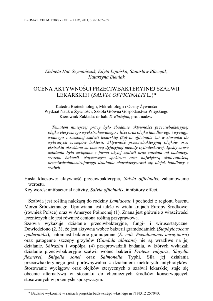 BROMAT. CHEM. TOKSYKOL. – XLIV, 2011, 3, str. 667–672 Elżbieta Hać-Szymańczuk, Edyta Lipińska, Stanisław Błażejak, Katarzyna Bieniak OCENA AKTYWNOŚCI PRZECIWBAKTERYJNEJ SZAŁWII LEKARSKIEJ (SALVIA OFFICINALIS L.)* Katedra Biotechnologii, Mikrobiologii i Oceny Żywności Wydział Nauk o Żywności, Szkoła Główna Gospodarstwa Wiejskiego Kierownik Zakładu: dr hab. S. Błażejak, prof. nadzw. Tematem niniejszej pracy było zbadanie aktywności przeciwbakteryjnej olejku eterycznego wyekstrahowanego z liści oraz olejku handlowego i wyciągu wodnego z suszonej szałwii lekarskiej (Salvia officinalis L.) w stosunku do wybranych szczepów bakterii. Aktywność przeciwbakteryjną olejków oraz ekstraktu określano za pomocą dyfuzyjnej metody cylinderkowej. Efektywność działania była związana z formą użytej szałwii oraz zależała od badanego szczepu bakterii. Najszerszym spektrum oraz największą skutecznością przeciwdrobnoustrojowego działania charakteryzował się olejek handlowy z szałwii. Hasła kluczowe: aktywność przeciwbakteryjna, Salvia officinalis, zahamowanie wzrostu. Key words: antibacterial activity, Salvia officinalis, inhibitory effect. Szałwia jest rośliną należącą do rodziny Lamiaceae i pochodzi z regionu basenu Morza Śródziemnego. Uprawiana jest także w wielu krajach Europy Środkowej (również Polsce) oraz w Ameryce Północnej (1). Znana jest głównie z właściwości leczniczych ale jest również cenioną rośliną przyprawową. Szałwia wykazuje działanie przeciwbakteryjne, fungi- i wirusostatyczne. Dowiedziono (2, 3), że jest aktywna wobec bakterii gramdodatnich (Staphylococcus epidermidis), natomiast bakterie gramujemne (E. coli, Pseudomonas aeruginosa) oraz patogenne szczepy grzybów (Candida albicans) nie są wrażliwe na jej działanie. Shirazini i współpr. (4) przeprowadzili badania, w których wykazali działanie przeciwbakteryjne szałwii wobec bakterii Proteus vulgaris, Shigella flexnerei, Shigella sonei oraz Salmonella Typhi. Siła jej działania przeciwbakteryjnego jest porównywalna z działaniem niektórych antybiotyków. Stosowanie wyciągów oraz olejków eterycznych z szałwii lekarskiej staje się obecnie alternatywą w stosunku do chemicznych środków konserwujących stosowanych w przemyśle spożywczym. ____________ * Badanie wykonane w ramach projektu badawczego własnego nr N N312 257040. 668 E. Hać-Szymańczuk i inni Nr 3 Celem pracy było określenie aktywności przeciwbakteryjnej olejków eterycznych (handlowego oraz wyekstrahowanego ze świeżych liści) oraz wyciągu wodnego z suszonej szałwii w stosunku do wybranych szczepów bakterii, które mogą występować w żywności pochodzenia zwierzęcego. MATERIAŁ I METODY Przedmiotem badań był handlowy olejek eteryczny (n=3), olejek eteryczny wyekstrahowany ze świeżych liści szałwii (n=3) oraz wyciąg wodny z suszonej szałwii lekarskiej (Salvia officinalis). W celu ekstrakcji olejku eterycznego, świeże liście szałwii rozdrabniano, zalewano wodą i poddawano destylacji w aparacie do otrzymywania olejków eterycznych według Derynga firmy Simax (5). Ochłodzony destylat czterokrotnie ekstrahowano chlorkiem metylenu w rozdzielaczu, a następnie usuwano wodę, dodając bezwodny siarczan magnezu. Część rozpuszczalnika odparowywano w wyparce laboratoryjnej z regulowanym ciśnieniem firmy Büchi (ciśnienie 540-560 hPa, temperatura 30°C). Przy sporządzaniu wyciągu wodnego z szałwii, susz handlowy umieszczano w lnianym woreczku, który przenoszono do naczynia zawierającego zimną wodę. Całość doprowadzano do wrzenia. Po 24 h przechowywania wyciągu w temperaturze 4°C usuwano woreczek z suszem. Otrzymany wyciąg zagęszczano do masy użytego surowca w wyparce firmy Büchi (ciśnienie 50 hPa, temperatura 30°C) (6). W celu przygotowania do oznaczeń olejku handlowego (Dr Beta, Pollena Aroma), rozcieńczano go w stosunku 1:1 z heksanem. Do oznaczenia właściwości przeciwbakteryjnych szałwii wykorzystano szczepy bakterii, pochodzące z Kolekcji Czystych Kultur Zakładu Biotechnologii i Mikrobiologii Żywności: Micrococcus sp., Bacillus subtilis ATCC 6633, Tetracoccus sp., Staphylococcus aureus ATTC 25923, Proteus vulgaris 458, Proteus mirabilis 180, Escherichia coli ATCC 25922 oraz Klebsiella pneumoniae 196. Wrażliwość bakterii na działanie olejków eterycznych oraz wyciągu wodnego z szałwii lekarskiej określano metodą stosowaną do oznaczania przeciwdrobnoustrojowej aktywności antybiotyków, którą dostosowano do potrzeb eksperymentu przeprowadzanego w trzydziestu powtórzeniach dla każdego szczepu bakterii (7). Do badań wykorzystywano 24-godzinne hodowle bakterii w płynnym bulionie wzbogaconym (temperatura 37°C). Po inkubacji dokonywano pomiaru gęstości optycznej zawiesiny drobnoustrojów przy użyciu spektrofotometru Spectronic®20 GENESYS przy długości fali 550 nm lub w przypadku szczepów patogennych używając densimatu firmy BioMerieux. Następnie jałowe płytki Petriego szczepiono wgłębnie 0,1 ml zawiesiny bakterii, po czym zalewano ok. 20 ml upłynnionego bulionu z agarem. Płytki pozostawiano przez 30 minut w temperaturze pokojowej w celu zestalenia pożywki, po czym podsuszano je pod lampą POLON z nawiewem przez 30 minut. Na powierzchni podłoża, ustawiano Nr 3 Aktywność przeciwbakteryjna szałwii lekarskiej 669 trzy jałowe cylinderki ze stali nierdzewnej o średnicy zewnętrznej 8 mm i wewnętrznej 7 mm. Do dwóch cylinderków wprowadzano 0,1 ml badanego olejku lub wyciągu, natomiast trzeci napełniano taką samą objętością rozpuszczalnika, użytego dla danego olejku (chlorek metylenu lub heksan) lub wyciągu (woda). Przygotowane w ten sposób płytki termostatowano przez 24 h w temperaturze 37°C. Następnie sprawdzano obecność lub brak stref zahamowania wzrostu wokół cylinderków. Pomiaru średnicy uzyskanych stref zahamowania wzrostu dokonywano łącznie ze średnicą cylinderka. Wyniki u