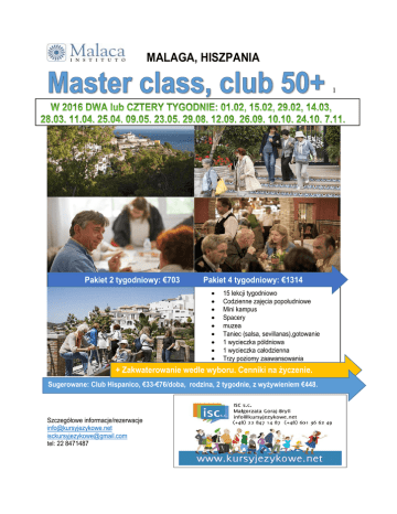 MALAGA, HISZPANIA 1 Pakiet 2 tygodniowy: €703 Pakiet 4 tygodniowy: €1314 15 lekcji tygodniowo Codzienne zajęcia popołudniowe Mini kampus Spacery muzea Taniec (salsa, sevillanas),gotowanie 1 wycieczka póldniowa 1 wycieczka całodzienna Trzy poziomy zaawansowania + Zakwaterowanie wedle wyboru. Cenniki na życzenie. Sugerowane: Clubrodzina, Hispanico , wyższyz wyżywieniem standard €32-€62/doba Sugerowane: Club Hispanico, €33-€76/doba, 2 tygodnie, €448. Szczegółowe informacje/rezerwacje [email protected] [email protected] tel: 22 8471487