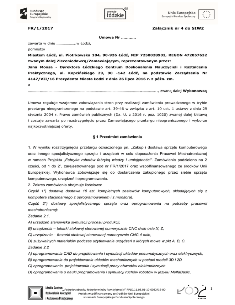 FR/1/2017 Załącznik nr 4 do SIWZ Umowa Nr ………… zawarta w dniu ………………..w Łodzi, pomiędzy Miastem Łódź, ul. Piotrkowska 104, 90-926 Łódź, NIP 7250028902, REGON 472057632 zwanym dalej Zleceniodawcą/Zamawiającym, reprezentowanym przez: Jana Moosa - Dyrektora Łódzkiego Centrum Doskonalenia Nauczycieli i Kształcenia Praktycznego, ul. Kopcińskiego 29, 90 -142 Łódź, na podstawie Zarządzenia Nr 4147/VII/16 Prezydenta Miasta Łodzi z dnia 26 lipca 2016 r. z późn. zm. a ………….…………………………………………………………………………………………..…………..., zwaną dalej Wykonawcą Umowa reguluje wzajemne zobowiązania stron przy realizacji zamówienia prowadzonego w trybie przetargu nieograniczonego na podstawie art. 39-46 w związku z art. 10 ust. 1 ustawy z dnia 29 stycznia 2004 r. Prawo zamówień publicznych (Dz. U. z 2016 r. poz. 1020) zwanej dalej Ustawą i zostaje zawarta po rozstrzygnięciu przez Zamawiającego przetargu nieograniczonego i wyborze najkorzystniejszej oferty. § 1 Przedmiot zamówienia 1. W wyniku rozstrzygnięcia przetargu oznaczonego pn. „Zakup i dostawa sprzętu komputerowego oraz innego specjalistycznego sprzętu i urządzeń w celu doposażenia Pracowni Mechatronicznej w ramach Projektu „Fabryka robotów fabryką wiedzy i umiejętności”. Zamówienie podzielono na 2 części, od 1 do 2”, zarejestrowanego pod nr FR/1/2017 oraz współfinansowanego ze środków Unii Europejskiej, Wykonawca zobowiązuje się do dostarczenia zakupionego przez siebie sprzętu komputerowego, urządzeń i oprogramowania. 2. Zakres zamówienia obejmuje ilościowo: Część 1*) dostawę dostawa 15 szt. kompletnych zestawów komputerowych, składających się z komputera stacjonarnego z oprogramowaniem i z monitora). Część 2*) dostawę specjalistycznego sprzętu oraz oprogramowania na potrzeby pracowni mechatronicznej: Zadanie 2.1. A) urządzeń stanowiska symulacji procesu produkcji, B) urządzenia – tokarki stołowej sterowanej numerycznie CNC dwie osie X, Z, C) urządzenia – frezarki stołowej sterowanej numerycznie CNC 4 osie, D) zużywalnych materiałów podczas użytkowania urządzeń o których mowa w pkt A, B, C. Zadanie 2.2 A) oprogramowania CAD do projektowania i symulacji układów pneumatycznych oraz elektrycznych, B) oprogramowania do projektowania układów mechanicznych w postaci modeli 3D i 2D C) oprogramowania projektowania i symulacji pracy obwodów elektronicznych D) oprogramowania o nauki programowania i symulacji ruchów robotów w języku MelfaBasic, „Fabryka robotów fabryką wiedzy i umiejętności” RPLD.11.03.01-10-0032/16-00 Projekt współfinansowany ze środków Unii Europejskiej w ramach Europejskiego Funduszu Społecznego 1 FR/1/2017 Załącznik nr 4 do SIWZ 2.1.Techniczny i jakościowy zakres dostawy sprzętu o którym mowa w ust. 2 został określony szczegółowo w SIWZ oraz w ofercie Wykonawcy. 3. Wynagrodzenie Wykonawcy współfinansowanie jest z Europejskiego Funduszu Społecznego. 4. Przedmiot zamówienia został określony w Specyfikacji Istotnych Warunków Zamówienia (SIWZ). Składając ofertę, Wykonawca złożył oświadczenie, iż treść SIWZ jest mu znana i nie wnosi wobec niej zastrzeżeń. 5. Wykonawca zobowiązuje się zrealizować umowę zgodnie ze złożoną ofertą oraz SIWZ, stanowiącymi integralną część niniejszej umowy oraz odpowiednio załączniki nr 1 i 5 do umowy § 2 Termin realizacji przedmiotu umowy 1. Termin realizacji zamówienia: - ustala się zgodnie ze złożoną ofertą oraz zgodnie z SIWZ 2. W przypadku zaistnienia okoliczności, za które żadna ze stron nie ponosi odpowiedzialności i których strony, przy zachowaniu należytej staranności nie mogły przewidzieć przy zawieraniu umowy, a które mogą skutkować niemożnością dotrzymania terminów umownych, Wykonawca zobowiązany jest niezwłocznie zawiadomić Zamawiającego na piśmie o ich wystąpieniu. Wówczas Zamawiający może wyrazić zgodę na wyznaczenie nowego terminu wykonania prac, który w stosunku do terminów poprzednich może być przesunięty o czas nie dłuższy niż czas trwania tychże okoliczności. W przypadku braku takiego zawiadomienia, Wykonawcy zobowiązany jest do dotrzymania terminów ustalonych w umowie. Ustalenie nowych terminów musi nastąpić na piśmie. Powyższy zapis nie znajduje zastosowania w przypadku, gdy oferta Wykonawcy została uznana za najkorzystniejszą z uwagi na zaproponowanie przez niego krótszego terminu wykonania zamówienia (za co Wykonawca uzyskał dodatkową punktację na etapie oceny ofert). § 3 Procedura realizacji przedmiotu umowy 1. Wykonawca zobowiązuje się do dostarczenia zamówienia do siedziby Zamawiającego. Dostawa obejmuje rozładunek i przemieszczenie towaru do pomieszczeń magazynowych wskazanych przez Zamawiającego. Przez dostawę rozumie się dostarczenie przedmiotu zamówienia w miejsce wyznaczone przez Zamawiającego w umówionym terminie. 2. Wykonawca przyszłego świadczenia umownego zobowiązany jest dostarczyć do siedziby Zamawiającego, lub w inne wskazane przez niego miejsce, jednorazowo (dotyczy części 1 oraz części 2 – w zakresie dostawy o której mowa w pkt 3.2.2 zadanie 2.1 lit. B, C i D oraz zadanie 2.2 w całości; Zamawiający dopuszcza możliwość zaistnienia sytuacji, gdzie z uwagi na obiektywne okoliczności związane ze specyfiką zamówienia, termin dostawy urządzeń o których mowa w pkt 3.2.2 zadanie 2.1 lit A może być istotnie różny od terminów dostawy pozostałych urządzeń i oprogramowania o których mowa w pkt 3.2.2) oraz w umówionym terminie cały sprzęt, urządzenia i oprogramowanie będące przedmiotem zamówienia (w danej części) oraz uruchomić i przygotować do pracy zgodnie z przeznaczeniem. „Fabryka robotów fabryką wiedzy i umiejętności” RPLD.11.03.01-10-0032/16-00 Projekt współfinansowany ze środków Unii Europejskiej w ramach Europ