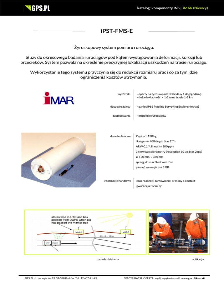 katalog: komponenty INS | iMAR (Niemcy) iPST-FMS-E Żyroskopowy system pomiaru rurociągu. Służy do okresowego badania rurociągów pod kątem występowania deformacji, korozji lub przecieków. System pozwala na określenie precyzyjnej lokalizacji uszkodzeń na trasie rurociągu. Wykorzystanie tego systemu przyczynia się do redukcji rozmiaru prac i co za tym idzie ograniczenia kosztów utrzymania. wyróżniki kluczowe zalety zastosowania dane techniczne - oparty na żyroskopach FOG klasy 1 deg/godzinę. - duża dokładność: < 1-2 m na trasie 1-2 km - pakiet iPSE Pipeline Surveying Explorer (opcja) - inspekcje rurociągów Payload: 130 kg Range +/- 400 deg/s, bias 1°/h ARW 0.1°/, linearity 300 ppm 3 serwoakcelerometry (resolution 10 µg, bias 2 mg) Ø 120 mm, L 380 mm sprzęg do max 3 odometrów pamięć wewnętrzna 3 GB informacje handlowe czas realizacji zamówienia: prosimy o kontakt gwarancja: 12 m-cy zasada działania GPS.PL ul. Jasnogórska 23, 31-358 Kraków. Tel.: 12 637-71-49 aplikacja SPECYFIKACJA, OFERTA: wyślij zapytanie email: www.gps.pl/kontakt