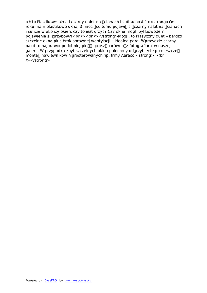 <h1>Plastikowe okna i czarny nalot na �cianach i sufitach</h1><strong>Od roku mam plastikowe okna, 3 miesi�ce temu pojawi� si�czarny nalot na �cianach i suficie w okolicy okien, czy to jest grzyb? Czy okna mog� by�powodem pojawienia si�grzybów?!<br /><br /></strong>Mog�, to klasyczny duet – bardzo szczelne okna plus brak sprawnej wentylacji – idealna para. Wprawdzie czarny nalot to najprawdopodobniej ple��- prosz�porówna�z fotografiami w naszej galerii. W przypadku zbyt szczelnych okien polecamy odgrzybienie pomieszcze�i monta� nawiewników higrosterowanych np. frmy Aereco.<strong> <br /></strong> Powered by EasyFAQ by Joomla-addons.org