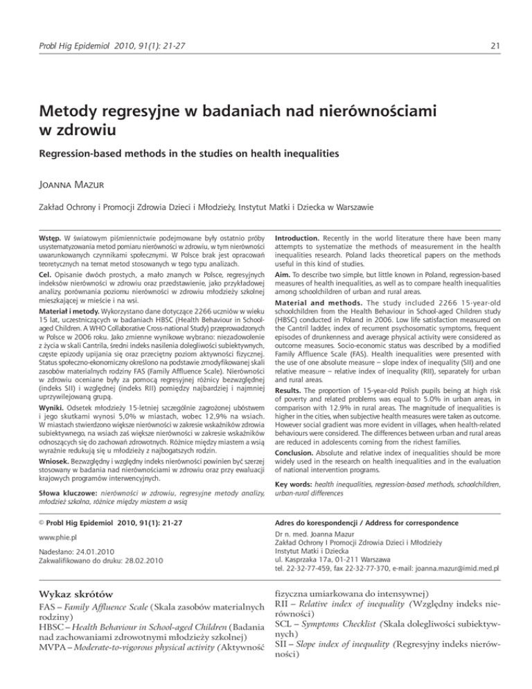 MazurHig Probl J. Epidemiol Metody regresyjne 2010, 91(1): w badaniach 21-27 nad nierównościami w zdrowiu 21 Metody regresyjne w badaniach nad nierównościami w zdrowiu Regression-based methods in the studies on health inequalities Joanna Mazur Zakład Ochrony i Promocji Zdrowia Dzieci i Młodzieży, Instytut Matki i Dziecka w Warszawie Wstęp. W światowym piśmiennictwie podejmowane były ostatnio próby usystematyzowania metod pomiaru nierówności w zdrowiu, w tym nierówności uwarunkowanych czynnikami społecznymi. W Polsce brak jest opracowań teoretycznych na temat metod stosowanych w tego typu analizach. Introduction. Recently in the world literature there have been many attempts to systematize the methods of measurement in the health inequalities research. Poland lacks theoretical papers on the methods useful in this kind of studies. Cel. Opisanie dwóch prostych, a mało znanych w Polsce, regresyjnych indeksów nierówności w zdrowiu oraz przedstawienie, jako przykładowej analizy, porównania poziomu nierówności w zdrowiu młodzieży szkolnej mieszkającej w mieście i na wsi. Aim. To describe two simple, but little known in Poland, regression-based measures of health inequalities, as well as to compare health inequalities among schoolchildren of urban and rural areas. Materiał i metody. Wykorzystano dane dotyczące 2266 uczniów w wieku 15 lat, uczestniczących w badaniach HBSC (Health Behaviour in Schoolaged Children. A WHO Collaborative Cross-national Study) przeprowadzonych w Polsce w 2006 roku. Jako zmienne wynikowe wybrano: niezadowolenie z życia w skali Cantrila, średni indeks nasilenia dolegliwości subiektywnych, częste epizody upijania się oraz przeciętny poziom aktywności fizycznej. Status społeczno-ekonomiczny określono na podstawie zmodyfikowanej skali zasobów materialnych rodziny FAS (Family Affluence Scale). Nierówności w zdrowiu oceniane były za pomocą regresyjnej różnicy bezwzględnej (indeks SII) i względnej (indeks RII) pomiędzy najbardziej i najmniej uprzywilejowaną grupą. Wyniki. Odsetek młodzieży 15-letniej szczególnie zagrożonej ubóstwem i jego skutkami wynosi 5,0% w miastach, wobec 12,9% na wsiach. W miastach stwierdzono większe nierówności w zakresie wskaźników zdrowia subiektywnego, na wsiach zaś większe nierówności w zakresie wskaźników odnoszących się do zachowań zdrowotnych. Różnice między miastem a wsią wyraźnie redukują się u młodzieży z najbogatszych rodzin. Wniosek. Bezwzględny i względny indeks nierówności powinien być szerzej stosowany w badania nad nierównościami w zdrowiu oraz przy ewaluacji krajowych programów interwencyjnych. Słowa kluczowe: nierówności w zdrowiu, regresyjne metody analizy, młodzież szkolna, różnice między miastem a wsią © Probl Hig Epidemiol 2010, 91(1): 21-27 www.phie.pl Nadesłano: 24.01.2010 Zakwalifikowano do druku: 28.02.2010 Wykaz skrótów FAS – Family Affluence Scale (Skala zasobów materialnych rodziny) HBSC – Health Behaviour in School-aged Children (Badania nad zachowaniami zdrowotnymi młodzieży szkolnej) MVPA – Moderate-to-vigorous physical activity (Aktywność Material and methods. The study included 2266 15-year-old schoolchildren from the Health Behaviour in School-aged Children study (HBSC) conducted in Poland in 2006. Low life satisfaction measured on the Cantril ladder, index of recurrent psychosomatic symptoms, frequent episodes of drunkenness and average physical activity were considered as outcome measures. Socio-economic status was described by a modified Family Affluence Scale (FAS). Health inequalities were presented with the use of one absolute measure – slope index of inequality (SII) and one relative measure – relative index of inequality (RII), separately for urban and rural areas. Results. The proportion of 15-year-old Polish pupils being at high risk of poverty and related problems was equal to 5.0% in urban areas, in comparison with 12.9% in rural areas. The magnitude of inequalities is higher in the cities, when subjective health measures were taken as outcome. However social gradient was more evident in villages, when health-related behaviours were considered. The differences between urban and rural areas are reduced in adolescents coming from the richest families. Conclusion. Absolute and relative index of inequalities should be more widely used in the research on health inequalities and in the evaluation of national intervention programs. Key words: health inequalities, regression-based methods, schoolchildren, urban-rural differences Adres do korespondencji / Address for correspondence Dr n. med. Joanna Mazur Zakład Ochrony I Promocji Zdrowia Dzieci i Młodzieży Instytut Matki i Dziecka ul. Kasprzaka 17a, 01-211 Warszawa tel. 22-32-77-459, fax 22-32-77-370, e-mail: [email protected] fizyczna umiarkowana do intensywnej) RII – Relative index of inequality (Względny indeks nierówności) SCL – Symptoms Checklist (Skala dolegliwości subiektywnych) SII – Slope index of inequality (Regresyjny indeks nierówności) 22 Wprowadzenie W wielu krajach zmniejszenie nierówności w zdrowiu zostało uznane za nadrzędny cel polityki zdrowotnej. W związku z tym istnieje potrzeba definiowania wymiernych celów i mierzenia efektów podejmowanych działań. Zalecane jest posługiwanie się takimi wskaźnikami, które mierzą różnicę między najmniej i najbardziej uprzywilejowanymi grupami społecznymi oraz różnicę między skrajnymi pod względem stopnia rozwoju regionami. W światowym piśmiennictwie fachowym podejmowane były ostatnio próby usystematyzowania metod pomiaru nierówności w zdrowiu, w tym nierówności uwarunkowanych czynnikami społecznymi [1-5]. W wydanej w 2007 roku pracy, Mary Shaw i wsp. opisali szereg mierników pozycji społeczno-ekonomicznej oraz wskaźników nierówności, z których znaczna część może mieć zastosowanie w badaniach nad nierównościami w zdrowiu [6]. Nieró