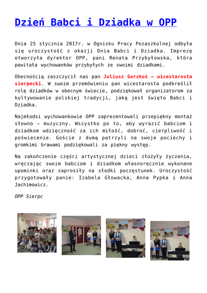 Dzień Babci i Dziadka w OPP Dnia 25 stycznia 2017r. w Ognisku Pracy Pozaszkolnej odbyła się uroczystość z okazji Dnia Babci i Dziadka. Imprezę otworzyła dyrektor OPP, pani Renata Przybyłowska, która powitała wychowanków przybyłych ze swoimi dziadkami. Obecnością zaszczycił nas pan Juliusz Gorzkoś – wicestarosta sierpecki. W swoim przemówieniu pan wicestarosta podkreślił rolę dziadków w obecnym świecie, podziękował organizatorom za kultywowanie polskiej tradycji, jaką jest święto Babci i Dziadka. Najmłodsi wychowankowie OPP zaprezentowali przepiękny montaż słowno – muzyczny. Wszystko po to, aby wyrazić babciom i dziadkom wdzięczność za ich miłość, dobroć, cierpliwość i poświecenie. Goście z dumą patrzyli na swoje pociechy i gromkimi brawami podziękowali za piękny występ. Na zakończenie części artystycznej dzieci złożyły życzenia, wręczając swoim babciom i dziadkom własnoręcznie wykonane upominki oraz zaprosiły na słodki poczęstunek. Uroczystość przygotowały panie: Izabela Głowacka, Anna Pypka i Anna Jachimowicz. OPP Sierpc Dzień Babci i Dziadka w OPP