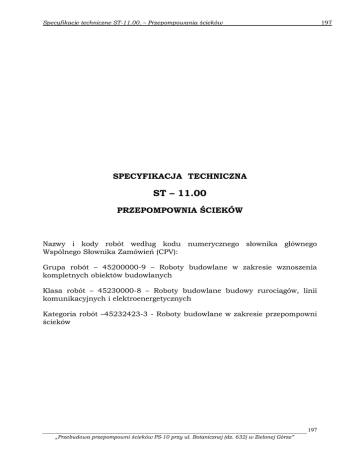 Specyfikacje techniczne ST-11.00. – Przepompowania ścieków 197 SPECYFIKACJA TECHNICZNA ST – 11.00 PRZEPOMPOWNIA ŚCIEKÓW Nazwy i kody robót według kodu numerycznego słownika głównego Wspólnego Słownika Zamówień (CPV): Grupa robót – 45200000-9 – Roboty budowlane w zakresie wznoszenia kompletnych obiektów budowlanych Klasa robót – 45230000-8 – Roboty budowlane budowy rurociągów, linii komunikacyjnych i elektroenergetycznych Kategoria robót –45232423-3 - Roboty budowlane w zakresie przepompowni ścieków 197 „Przebudowa przepompowni ścieków PS-10 przy ul. Botanicznej (dz. 632) w Zielonej Górze” Specyfikacje techniczne ST-11.00. – Przepompowania ścieków 198 SPIS TREŚCI 1. WSTĘP................................................................................................ 199 1.1. 1.2. 1.3. 1.4. 1.5. Przedmiot Specyfikacji Technicznej ............................................................ 199 Zakres stosowania ST ................................................................................ 199 Zakres robót objętych ST ............................................................................ 199 Określenia podstawowe .............................................................................. 199 Ogólne wymagania dotyczące robót ............................................................ 199 2. MATERIAŁY ........................................................................................ 199 3. SPRZĘT .............................................................................................. 202 4. TRANSPORT ....................................................................................... 202 5. WYKONANIE ROBÓT ........................................................................... 202 5.1. 5.2. Ogólne warunki wykonania ........................................................................ 202 Szczegółowe warunki wykonania ................................................................ 202 6. KONTROLA JAKOŚCI ROBÓT ............................................................. 207 6.1. 6.2. Ogólne wymagania kontroli jakości ............................................................ 207 Szczegółowe warunki kontroli jakości ......................................................... 207 7. OBMIAR ROBÓT ................................................................................. 207 7.1. Jednostka obmiaru .................................................................................... 207 8. ODBIÓR ROBÓT ................................................................................. 207 8.1. 8.2. Ogólne zasady odbioru Robót ..................................................................... 207 Szczegółowe warunki odbioru Robót ........................................................... 207 9. PODSTAWA PŁATNOŚCI ...................................................................... 208 9.1. Ogólne wymagania ..................................................................................... 208 10. PRZEPISY ZWIĄZANE...................................................................... 209 10.1. Normy ........................................................................................................ 209 10.2. Inne ........................................................................................................... 209 198 „Przebudowa przepompowni ścieków PS-10 przy ul. Botanicznej (dz. 632) w Zielonej Górze” Specyfikacje techniczne ST-11.00. – Przepompowania ścieków 199 1. WSTĘP 1.1. Przedmiot Specyfikacji Technicznej Przedmiotem niniejszej Specyfikacji Technicznej są wymagania dotyczące wykonania i odbioru przepompowni ścieków dla zadania: pn.: „Przebudowa przepompowni ścieków PS-10 przy ul. Botanicznej (dz. 632) w Zielonej Górze”. 1.2. Zakres stosowania ST Specyfikacja techniczna jest stosowana jako dokument przetargowy i kontraktowy przy zlecaniu i realizacji robót, wymienionych w punkcie 1.1. 1.3. Zakres robót objętych ST Ustalenia zawarte w niniejszej specyfikacji, dotyczą wybudowania kompletnej prefabrykowanej pompowni ścieków PS-10 wraz z podłączeniem i uruchomieniem. 1.4. Określenia podstawowe Określenia podane w niniejszej Technicznej Specyfikacji z obowiązującymi normami i ST - 00.00 – „Wymagania Ogólne”. 1.5. są zgodne Ogólne wymagania dotyczące robót Wykonawca robót jest odpowiedzialny za jakość wykonania Robót oraz za ich zgodność z Dokumentacją Projektową, Techniczną Specyfikacją i Poleceniami Inżyniera. 2. MATERIAŁY Należy dostarczyć i posadowić pompownię w następującym wykonaniu: tłocznię ścieków, o przepustowości min. Qhmax=120 m3/h, której zbiornik w każdych warunkach eksploatacyjnych jest stabilny i sztywny, wykonany ze stali (z blach o grubości min. 8mm) zabezpieczonych powłoką antykorozyjną o grubości min. 600 µm (kompozyt ceramiczny i epoksydowego systemu wiążący), uodpornioną na oddziaływanie agresywnych ścieków dzięki zastosowaniu biocydów (środek bakteriobójczy) w składzie powłoki, co gwarantuje długotrwałą ochronę przed korozją wżerową (biokorozję) powodowaną przez bakterie rozkładające siarczany (tzw. bakterie SRB). Zastosowanie jednorodnej powłoki na całej powierzchni zbiornika zabezpiecza przed oddziaływaniem agresywnych ścieków również miejsca spawania, które w przypadku konstrukcji stalowych niezabezpieczanych powłokami ochronnymi, stanowią najsłabsze ogniwo z punktu widzenia odporności na korozję. Zbiornik retencyjny tłoczni powinien posiadać tylko jeden duży otwór rewizyjny o śr. min. 1000 mm, zlokalizowany na górnej powierzchni, który bez rozszczelniania płaszczyzn bocznych pozwala na: łatwy montaż i demontaż zainstalowanych w podzespołów – rozdzielacza i separatorów, kontrolę stanu technicznego komory retencyjnej zespołów, jego i wnętrzu pozostałych 199 „Przebudowa przepompowni ścieków PS-10 p
