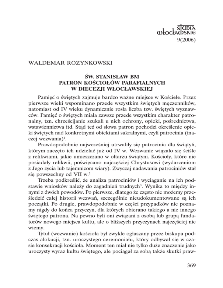 9(2006) WALDEMAR ROZYNKOWSKI ŚW. STANISŁAW BM PATRON KOŚCIOŁÓW PARAFIALNYCH W DIECEZJI WŁOCŁAWSKIEJ Pamięć o świętych zajmuje bardzo ważne miejsce w Kościele. Przez pierwsze wieki wspominano przede wszystkim świętych męczenników, natomiast od IV wieku dynamicznie rosła liczba tzw. świętych wyznawców. Pamięć o świętych miała zawsze przede wszystkim charakter patronalny, tzn. chrześcijanie szukali u nich ochrony, opieki, pośrednictwa, wstawiennictwa itd. Stąd też od słowa patron pochodzi określenie opieki świętych nad konkretnymi obiektami sakralnymi, czyli patrocinia (inaczej wezwania)1. Prawdopodobnie najwcześniej utrwaliły się patrocinia dla świątyń, którym zaczęto ich udzielać już od IV w. Wezwanie wiązało się ściśle z relikwiami, jakie umieszczano w ołtarzu świątyni. Kościoły, które nie posiadały relikwii, poświęcano najczęściej Chrystusowi (wydarzeniom z Jego życia lub tajemnicom wiary). Zwyczaj nadawania patrociniów stał się powszechny od VII w.2 Trzeba podkreślić, że analiza patrociniów i wyciąganie na ich podstawie wniosków należy do zagadnień trudnych3. Wynika to między innymi z dwóch powodów. Po pierwsze, dlatego że często nie możemy prześledzić całej historii wezwań, szczególnie nieudokumentowane są ich początki. Po drugie, prawdopodobnie w części przypadków nie poznamy nigdy do końca przyczyn, dla których obierano takiego a nie innego świętego patrona. Na pewno byli oni związani z osobą lub grupą fundatorów nowego miejsca kultu, ale o bliższych przyczynach najczęściej nie wiemy. Tytuł (wezwanie) kościoła był zwykle ogłaszany przez biskupa podczas alokucji, tzn. uroczystego ceremoniału, który odbywał się w czasie konsekracji kościoła. Moment ten miał nie tylko duże znaczenie jako uroczysty wyraz kultu świętego, ale pociągał za sobą także skutki praw- 369 ne4. Wezwania należy zaliczyć do jednych z trwalszych elementów tworzących parafie. Potwierdza to także zapis w obowiązującym dzisiaj prawie kanonicznym: „Każdy kościół powinien mieć swój tytuł, który nie może być zmieniony po dokonaniu poświęcenia kościoła” (kan. 1218)5. Znanym zjawiskiem były jednak zmiany wezwań. Związane to było ze zniszczeniami świątyń w czasie działań wojennych, pożarów, epidemii itd. Odbudowywane świątynie były na nowo konsekrowane i przy tej okazji nadawano im czasami inne patrocinium. Niejednokrotnie to nowe wezwanie odzwierciedlało popularność danego kultu w konkretnej epoce, a niekiedy związane było z kolejnym fundatorem świątyni. Znacznie częstszym jednak zjawiskiem towarzyszącym gruntownym odbudowom świątyń oraz ich remontom było dodawanie współpatronów6. * * * Powyższe spostrzeżenia dotyczą także kościołów noszących wezwania św. Stanisława. Święty ten stawał się patronem lub współpatronem przebudowywanych lub budowanych od fundamentów nowych świątyń. Zdarzało się także, że wybierano go jako orędownika dla kościołów przejmowanych po protestantach po II wojnie światowej. Dotychczasowe badania w Polsce nad patrociniami św. Stanisława nie należą do wyczerpujących, chociaż w ostatnich latach można zauważyć na tym polu coraz większe zainteresowanie. Do zintensyfikowania tych badań przyczyniły się na pewno jubileuszowe obchody pamięci męczennika w 2003 i 2004 r.7 Z obliczeń dokonanych na podstawie wykazu parafii w Polsce z końca 2001 roku wynika, że św. Stanisław patronował 283 parafiom. Przypomnijmy, że w naszym kraju było wtedy 9886 parafii, co oznacza, że patrocinium Męczennika nosiło 2,9% kościołów parafialnych8. Wezwania św. Stanisława spotykamy we wszystkich diecezjach w Polsce. Wyjątek stanowi tylko diecezja bizantyjska, co wydaje się jednak zrozumiałym. Trudno wnioskować, aby jakaś diecezja wybijała się szczególnie w liczbie wezwań biskupa męczennika. Obecnie najwięcej kościołów parafialnych przywołujących postać św. Stanisława posiada diecezja tarnowska (16). Powyżej dziewięciu znajduje się w diecezjach: płockiej (15), przemyskiej (15), krakowskiej (13), częstochowskiej (12), kieleckiej (12), poznańskiej (12), sandomierskiej (12), kaliskiej (11), łomżyńskiej (11), włocławskiej (11) oraz łowickiej (10). Jak widać w większości są to diecezje Polski południowej i środkowej. 370 Jak widać w grupie diecezji, w których spotykamy najczęściej patrocinium św. Stanisława, znajduje się także diecezja włocławska. Przyjrzyjmy się bliżej parafiom, w których spotykamy takie wezwanie9. Wezwanie św. Stanisława nosi kościół parafialny w B i a ł k o w i e w dekanacie kolskim. Początki parafii sięgają średniowiecza (przed 1416 r.). Wydaje się wielce prawdopodobnym, że kościół parafialny od początku nosił to właśnie wezwanie10. Wezwanie pozostawiono po wzniesieniu nowego kościoła w końcu XVIII w.11 Wezwanie męczennika nosi także kościół parafialny w B r o d n i w dekanacie warckim. Parafia posiada genezę średniowieczną i jest wielce prawdopodobne, że kościół od początku był pod wezwaniem św. Stanisława. Informacje o takim wezwaniu spotykamy w wizytacji z lat 1635– 163612. Wezwanie zachowano pomimo licznych przebudowań kościoła w XVI i XIX wieku13. Średniowieczną genezę posiada na pewno wezwanie kościoła parafialnego w B r z e ś c i u K u j a w s k i m. Pierwotny kościół parafialny w miejscowości posiadał jednak wezwanie św. Piotra i Pawła. Wezwanie św. Stanisława pojawiło się w związku z lokacją miasta oraz nową fundacją kościelną, które uczynił książę Kazimierz, syn Konrada Mazowieckiego14. Informacje o wezwaniu spotykamy w wizytacjach z XVI wieku15. W nowożytnych wizytacjach jako współpatronowie pojawiają się także święci Piotr i Paweł16. Nie mamy jednak wątpliwości, że kult najstarszych orędowników Brześcia został zdominowany przez św. Stanisława. 