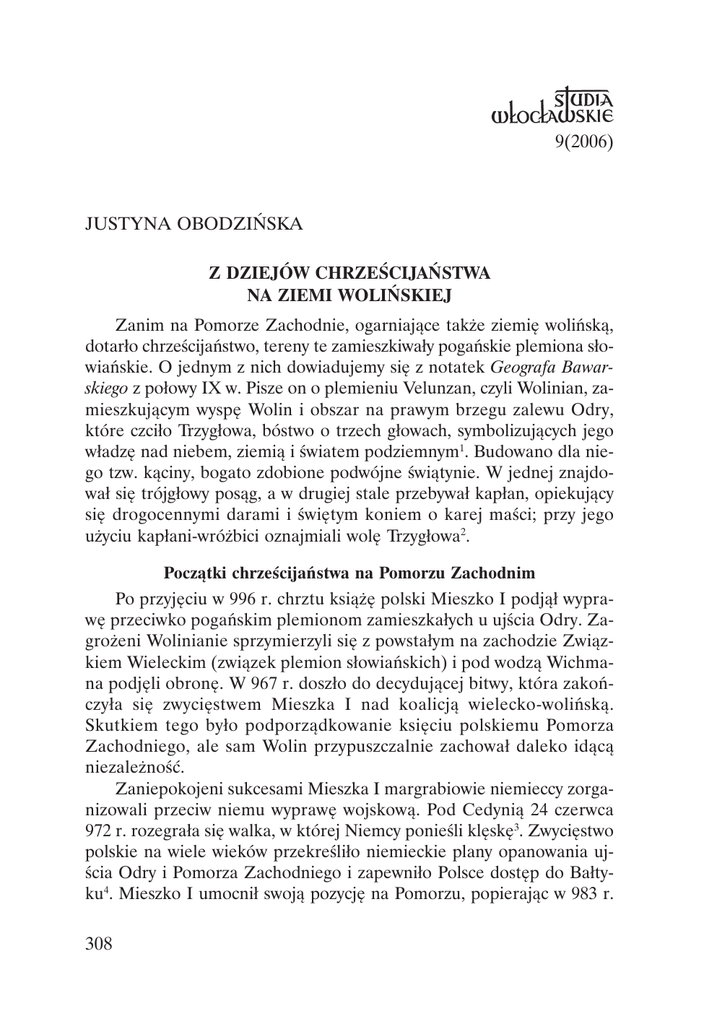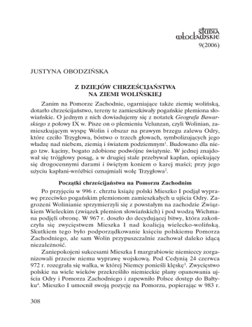 9(2006) JUSTYNA OBODZIŃSKA Z DZIEJÓW CHRZEŚCIJAŃSTWA NA ZIEMI WOLIŃSKIEJ Zanim na Pomorze Zachodnie, ogarniające także ziemię wolińską, dotarło chrześcijaństwo, tereny te zamieszkiwały pogańskie plemiona słowiańskie. O jednym z nich dowiadujemy się z notatek Geografa Bawarskiego z połowy IX w. Pisze on o plemieniu Velunzan, czyli Wolinian, zamieszkującym wyspę Wolin i obszar na prawym brzegu zalewu Odry, które czciło Trzygłowa, bóstwo o trzech głowach, symbolizujących jego władzę nad niebem, ziemią i światem podziemnym1. Budowano dla niego tzw. kąciny, bogato zdobione podwójne świątynie. W jednej znajdował się trójgłowy posąg, a w drugiej stale przebywał kapłan, opiekujący się drogocennymi darami i świętym koniem o karej maści; przy jego użyciu kapłani-wróżbici oznajmiali wolę Trzygłowa2. Początki chrześcijaństwa na Pomorzu Zachodnim Po przyjęciu w 996 r. chrztu książę polski Mieszko I podjął wyprawę przeciwko pogańskim plemionom zamieszkałych u ujścia Odry. Zagrożeni Wolinianie sprzymierzyli się z powstałym na zachodzie Związkiem Wieleckim (związek plemion słowiańskich) i pod wodzą Wichmana podjęli obronę. W 967 r. doszło do decydującej bitwy, która zakończyła się zwycięstwem Mieszka I nad koalicją wielecko-wolińską. Skutkiem tego było podporządkowanie księciu polskiemu Pomorza Zachodniego, ale sam Wolin przypuszczalnie zachował daleko idącą niezależność. Zaniepokojeni sukcesami Mieszka I margrabiowie niemieccy zorganizowali przeciw niemu wyprawę wojskową. Pod Cedynią 24 czerwca 972 r. rozegrała się walka, w której Niemcy ponieśli klęskę3. Zwycięstwo polskie na wiele wieków przekreśliło niemieckie plany opanowania ujścia Odry i Pomorza Zachodniego i zapewniło Polsce dostęp do Bałtyku4. Mieszko I umocnił swoją pozycję na Pomorzu, popierając w 983 r. 308 bunt Słowian mieszkających na zachód od Odry, którzy wystąpili przeciwko niemieckiej polityce chrystianizacyjnej. Układ sił na Pomorzu Zachodnim zmienił się w 986 r., kiedy król duński Harald Sinozęby zajął wyspę Wolin i założył tu obóz wikingów. Mieszko I odzyskał panowanie na ziemiach pomorskich przy pomocy oddziałów szwedzkich5. Ale i wtedy ambitnemu władcy nie udało się złamać samodzielności Wolina. Mieszkańcy nadal czcili bóstwa pogańskie. Następca Mieszka I, Bolesław Chrobry, kontynuował politykę pomorską swojego ojca. Zjazd gnieźnieński w 1000 r. (spotkanie Bolesława z cesarzem niemieckim Ottonem III) potwierdził zwierzchnictwo Polski nad Pomorzem. Chrobry doprowadził do ustanowienia wtedy pierwszego biskupstwa na Pomorzu Zachodnim w Kołobrzegu, podporządkowanego metropolii gnieźnieńskiej. Upadło ono jednak w nieznanych okolicznościach przed 1015 r. W XI w. uwidoczniły się dążenia książąt pomorskich do niezależności. Na terenach Pomorza Zachodniego powstawały tzw. republiki miejskie, w których władza przeszła w ręce feudałów, a w okresie panowania w latach 1025–1034 króla polskiego Mieszka II, syna Bolesława Chrobrego, Pomorze ponownie oderwało się od Polski6. Skuteczną walkę o przywrócenie panowania nad Pomorzem Zachodnim rozpoczął dopiero Bolesław Krzywousty w 1103 r. W latach 1121– 1122 zajął Pomorze, a następnie przystąpił do jego chrystianizacji. W tym celu zaprosił biskupa Bambergu – Ottona. Przybył on w towarzystwie licznego orszaku (20 kapłanów). Po sukcesach misji w Kamieniu Pomorskim7 „Apostoł Pomorza” dotarł do Wolina. Tam jednak spotkał się z oporem mieszkańców, którzy wyśmiewali się z kamienian, zarzucając im głupotę, chęć naśladowania błędów „obcego ludu”8, zdradę, niezrozumiałą ufność wobec obcych czarowników i oszustów. Wolinianie nie ukrywali wobec Ottona swojego przywiązania do wierzeń pogańskich. „Ilekroć bowiem wystąpił publicznie, by głosić kazanie, można było widzieć, jak barbarzyńcy z kijami i mieczami, jak kogo przypadek uzbroił, na wyścigi wypadali i jedni obrzucali błotem, inni miotali gęsto kamieniami, zgrzytali zębami, krzyczeli jeden przez drugiego, tak iż widocznym było, że wszyscy podobnie sprzysięgli się na śmierć jednego człowieka, nie pomijając żadnego sposobu szkodzenia mu” (Wolfger z Prüfeningu II 5)9. Ostatecznie wypędzili Ottona z miasta. Ten schronił się na przeciwległym brzegu rzeki, dokąd po kilku dniach przybyli przedstawiciele patrycjatu i usprawiedliwiali postawę ludu. Zobowiązali się też 309 do wysłuchania nauk biskupa, pod warunkiem, że najpierw uczyni to Szczecin, będący siedzibą książąt pomorskich. Otton udał się do Szczecina, jednak i tam spotkał się z wrogą reakcją ludności. Dopiero zdecydowana postawa Krzywoustego, grożącego przybyciem na czele wojska celem ukarania nieposłusznego ludu, przesądziła sprawę. Dodatkową zachętą dla Szczecina było obniżenie przez Krzywoustego trybutu, jaki musiano płacić polskiemu władcy. W odpowiedzi na to szczecinianie zburzyli swoje cztery pogańskie świątynie i pozwolili pobudować dwa kościoły: św. Wojciecha oraz św. Piotra. Na początku grudnia 1124 r. biskup Otton wyprawił się statkiem do Gardźca w południowo-wschodniej części wyspy Uznam, a stamtąd do Lubinia na wyspie Wolin10. W obu tych miejscowościach ochrzcił znaczną liczbę ludności i poświęcił wybudowaną kaplicę11, po czym w połowie grudnia powrócił do Wolina. Postawa Szczecina i wiadomość o groźbie Krzywoustego sprawiły, że poganie oddali w ręce biskupa swoją kącinę. Na tym miejscu zbudowano kościół pw. św. Wojciecha, a drugi – przed bramą miasta – ku czci Michała Anioła, powierzony pieczy kapłana Wojciecha, towarzysza Ottona (Wolfger z Prüfeningu II 5)12. Misja chrystianizacyjna na Pomorzu Zachodnim zakończyła się w Białogardzie. W jej wyniku księstwo pomorskie zostało włączone do wspólnoty krajów chrześcijańskich. Zmiany polit