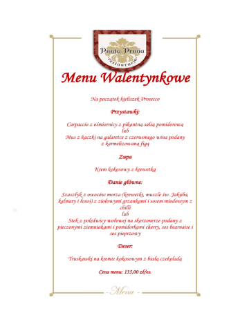 Menu Walentynkowe Na początek kieliszek Prosecco Przystawki: Carpaccio z ośmiornicy z pikantną salsą pomidorową lub Mus z kaczki na galaretce z czerwonego wina podany z karmelizowaną figą Zupa Krem kokosowy z krewetką Danie główne: Szaszłyk z owoców morza (krewetki, muszle św. Jakuba, kalmary i łosoś) z ziołowymi grzankami i sosem miodowym z chilli lub Stek z polędwicy wołowej na skorzonerze podany z pieczonymi ziemniakami i pomidorkami cherry, sos bearnaise i sos pieprzowy Deser: Truskawki na kremie kokosowym z białą czekoladą Cena menu: 135,00 zł/os.
