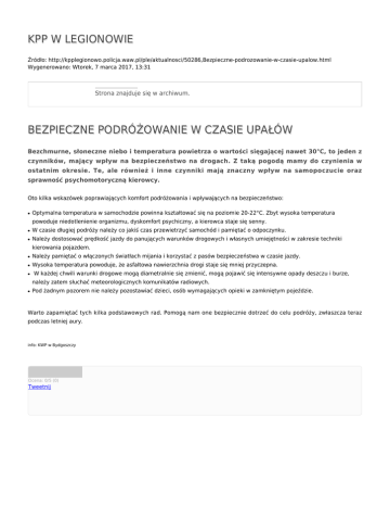 KPP W LEGIONOWIE Źródło: http://kpplegionowo.policja.waw.pl/ple/aktualnosci/50286,Bezpieczne-podrozowanie-w-czasie-upalow.html Wygenerowano: Wtorek, 7 marca 2017, 13:31 Strona znajduje się w archiwum. BEZPIECZNE PODRÓŻOWANIE W CZASIE UPAŁÓW Bezchmurne, słoneczne niebo i temperatura powietrza o wartości sięgającej nawet 30°C, to jeden z czynników, mający wpływ na bezpieczeństwo na drogach. Z taką pogodą mamy do czynienia w ostatnim okresie. Te, ale również i inne czynniki mają znaczny wpływ na samopoczucie oraz sprawność psychomotoryczną kierowcy. Oto kilka wskazówek poprawiających komfort podróżowania i wpływających na bezpieczeństwo: ● Optymalna temperatura w samochodzie powinna kształtować się na poziomie 20-22°C. Zbyt wysoka temperatura powoduje niedotlenienie organizmu, dyskomfort psychiczny, a kierowca staje się senny. ● W czasie długiej podróży należy co jakiś czas przewietrzyć samochód i pamiętać o odpoczynku. ● Należy dostosować prędkość jazdy do panujących warunków drogowych i własnych umiejętności w zakresie techniki kierowania pojazdem. ● Należy pamiętać o włączonych światłach mijania i korzystać z pasów bezpieczeństwa w czasie jazdy. ● Wysoka temperatura powoduje, że asfaltowa nawierzchnia drogi staje się mniej przyczepna. ● W każdej chwili warunki drogowe mogą diametralnie się zmienić, mogą pojawić się intensywne opady deszczu i burze, należy zatem słuchać meteorologicznych komunikatów radiowych. ● Pod żadnym pozorem nie należy pozostawiać dzieci, osób wymagających opieki w zamkniętym pojeździe. Warto zapamiętać tych kilka podstawowych rad. Pomogą nam one bezpiecznie dotrzeć do celu podróży, zwłaszcza teraz podczas letniej aury. info: KWP w Bydgoszczy Ocena: 0/5 (0) Tweetnij