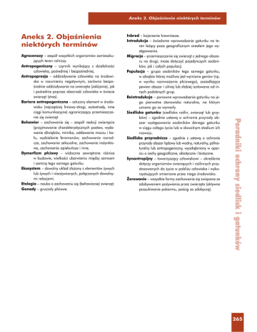 Anekstytu∏ 2. ObjaÊnienia rozdzia∏u (nazwa niektórych ryby terminów gatunku) Aneks 2. ObjaÊnienia niektórych terminów Poradniki ochrony siedlisk i gatunków Agrocenozy – zespó∏ wszystkich organizmów zamieszkujàcych teren rolniczy. Antropogeniczny – czynnik wynikajàcy z dzia∏alnoÊci cz∏owieka, poÊredniej i bezpoÊredniej. Antropopresja – oddzia∏ywanie cz∏owieka na Êrodowisko w rozumieniu negatywnym, zarówno bezpoÊrednie oddzia∏ywanie na zwierz´ta (zabijanie), jak i poÊrednie poprzez obecnoÊç cz∏owieka w Êwiecie zwierzàt (stres). Bariera antropogeniczna – sztuczny element w Êrodowisku (najcz´Êciej liniowy–drogi, autostrady, inne ciàgi komunikacyjne) ograniczajàcy przemieszczanie si´ zwierzàt. Behawior – zachowanie si´ – zespó∏ reakcji zwierz´cia (przyjmowanie charakterystycznych postaw, wydawanie dêwi´ków, mimika, oddawanie moczu i ka∏u, wydzielanie feromonów; zachowanie rozrodcze, zachowanie seksualne, zachowanie instynktowe, zachowanie opiekuƒcze i inne. Dymorfizm p∏ciowy – widoczne zewn´trzne ró˝nice w budowie, wielkoÊci ubarwieniu mi´dzy samcem i samicà tego samego gatunku. Ekosystem – dowolny uk∏ad z∏o˝ony z elementów ˝ywych lub ˝ywych i nieo˝ywionych, po∏àczonych dowolnymi relacjami. Etologia – nauka o zachowaniu si´ (behawiorze) zwierzàt. Gonady – gruczo∏y p∏ciowe. Inbred – kojarzenie krewniacze. Introdukcja – Êwiadome wprowadzanie gatunku na teren le˝àcy poza geograficznym area∏em jego wyst´powania. Migracja – przemieszczanie si´ zwierzàt z jednego obszaru na drugi; mo˝e dotyczyç pojedynczych osobników, jak i ca∏ych populacji. Populacja – grupa osobników tego samego gatunku, w obr´bie której mo˝liwa jest wymiana genów (np. w wyniku rozmna˝ania p∏ciowego), zasiedlajàca pewien obszar i silniej lub s∏abiej izolowana od innych podobnych grup. Reintrodukcja – ponowne wprowadzenie gatunku na jego pierwotne stanowisko naturalne, na którym uznano go za wymar∏y. Siedlisko gatunku (siedlisko roÊlin, zwierzàt lub grzybów) – zgodnie ustawà o ochronie przyrody obszar wyst´powania osobników danego gatunku w ciàgu ca∏ego ˝ycia lub w dowolnym stadium ich rozwoju. Siedlisko przyrodnicze – zgodnie z ustawà o ochronie przyrody obszar làdowy lub wodny, naturalny, pó∏naturalny lub antropogeniczny, wyodr´bniony w oparciu o cechy geograficzne, abiotyczne i biotyczne. Synantropijny – towarzyszàcy cz∏owiekowi – okreÊlenie dotyczy organizmów zwierz´cych i roÊlinnych przystosowanych do ˝ycia w pobli˝u cz∏owieka i wykorzystujàcych zmienione przez niego Êrodowisko. ˚erowanie – wszystkie formy zachowania si´ zwiàzane ze zdobywaniem po˝ywienia przez zwierz´ta (aktywne poszukiwanie pokarmu, poÊcig za zdobyczà). 265