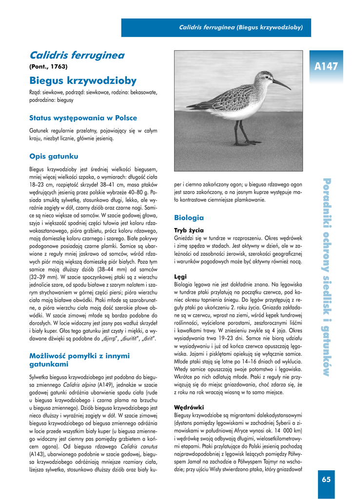 Calidris ferruginea (Biegus krzywodzioby) Calidris ferruginea A147 (Pont., 1763) Biegus krzywodzioby Rzàd: siewkowe, podrzàd: siewkowce, rodzina: bekasowate, podrodzina: biegusy Status wyst´powania w Polsce Gatunek regularnie przelotny, pojawiajàcy si´ w ca∏ym kraju, niezbyt licznie, g∏ównie jesienià. Opis gatunku Mo˝liwoÊç pomy∏ki z innymi gatunkami Sylwetka biegusa krzywodziobego jest podobna do biegusa zmiennego Calidris alpina (A149), jednak˝e w szacie godowej gatunki odró˝nia ubarwienie spodu cia∏a (rude u biegusa krzywodziobego i czarna plama na brzuchu u biegusa zmiennego). Dziób biegusa krzywodziobego jest nieco d∏u˝szy i wyraêniej zagi´ty w dó∏. W szacie zimowej biegusa krzywodziobego od biegusa zmiennego odró˝nia w locie przede wszystkim bia∏y kuper (u biegusa zmiennego widoczny jest ciemny pas pomi´dzy grzbietem a koƒcem ogona). Od biegusa rdzawego Calidris canutus (A143), ubarwionego podobnie w szacie godowej, biegusa krzywodziobego odró˝niajà mniejsze rozmiary cia∏a, l˝ejsza sylwetka, stosunkowo d∏u˝szy dziób oraz bia∏y ku- per i ciemno zakoƒczony ogon; u biegusa rdzawego ogon jest szaro zakoƒczony, a na jasnym kuprze wyst´puje ma∏o kontrastowe ciemniejsze plamkowanie. Biologia Tryb ˝ycia Gnieêdzi si´ w tundrze w rozproszeniu. Okres w´drówek i zim´ sp´dza w stadach. Jest aktywny w dzieƒ, ale w zale˝noÊci od zasobnoÊci ˝erowisk, szerokoÊci geograficznej i warunków pogodowych mo˝e byç aktywny równie˝ nocà. L´gi Biologia l´gowa nie jest dok∏adnie znana. Na l´gowiska w tundrze ptaki przylatujà na poczàtku czerwca, pod koniec okresu topnienia Êniegu. Do l´gów przyst´pujà z regu∏y ptaki po ukoƒczeniu 2. roku ˝ycia. Gniazda zak∏adane sà w czerwcu, wprost na ziemi, wÊród k´pek tundrowej roÊlinnoÊci, wyÊcielone porostami, zesz∏orocznymi liÊçmi i kawa∏kami trawy. W zniesieniu zwykle sà 4 jaja. Okres wysiadywania trwa 19–23 dni. Samce nie biorà udzia∏u w wysiadywaniu i ju˝ od koƒca czerwca opuszczajà l´gowiska. Jajami i piskl´tami opiekujà si´ wy∏àcznie samice. M∏ode ptaki stajà si´ lotne po 14–16 dniach od wyklucia. Wtedy samice opuszczajà swoje potomstwo i l´gowiska. Wkrótce po nich odlatujà m∏ode. Ptaki z regu∏y nie przywiàzujà si´ do miejsc gniazdowania, choç zdarza si´, ˝e z roku na rok wracajà wiosnà w to samo miejsce. Poradniki ochrony siedlisk i gatunków Biegus krzywodzioby jest Êredniej wielkoÊci biegusem, mniej wi´cej wielkoÊci szpaka, o wymiarach: d∏ugoÊç cia∏a 18–23 cm, rozpi´toÊç skrzyde∏ 38–41 cm, masa ptaków w´drujàcych jesienià przez polskie wybrze˝e 40–80 g. Posiada smuk∏à sylwetk´, stosunkowo d∏ugi, lekko, ale wyraênie zagi´ty w dó∏, czarny dziób oraz czarne nogi. Samice sà nieco wi´ksze od samców. W szacie godowej g∏owa, szyja i wi´kszoÊç spodniej cz´Êci tu∏owia jest koloru rdzawokasztanowego, pióra grzbietu, prócz koloru rdzawego, majà domieszk´ koloru czarnego i szarego. Bia∏e pokrywy podogonowe posiadajà czarne plamki. Samice sà ubarwione z regu∏y mniej jaskrawo od samców, wÊród rdzawych piór majà wi´kszà domieszk´ piór bia∏ych. Poza tym samice majà d∏u˝szy dziób (38–44 mm) od samców (32–39 mm). W szacie spoczynkowej ptaki sà z wierzchu jednolicie szare, od spodu bia∏awe z szarym nalotem i szarym strychowaniem w górnej cz´Êci piersi; pióra wierzchu cia∏a majà bia∏awe obwódki. Ptaki m∏ode sà szarobrunatne, a pióra wierzchu cia∏a majà doÊç szerokie p∏owe obwódki. W szacie zimowej m∏ode sà bardzo podobne do doros∏ych. W locie widoczny jest jasny pas wzd∏u˝ skrzyde∏ i bia∏y kuper. G∏os tego gatunku jest czysty i mi´kki, a wydawane dêwi´ki sà podobne do „djirrp”, „diuritit”, „dirit”. W´drówki Biegusy krzywodziobe sà migrantami dalekodystansowymi (dystans pomi´dzy l´gowiskami w zachodniej Syberii a zimowiskami w po∏udniowej Afryce wynosi ok. 14 000 km) i w´drówk´ swojà odbywajà d∏ugimi, wielosetkilometrowymi etapami. Ptaki przylatujàce do Polski jesienià pochodzà najprawdopodobniej z l´gowisk le˝àcych pomi´dzy Pó∏wyspem Jama∏ na zachodzie a Pó∏wyspem Tajmyr na wschodzie; przy ujÊciu Wis∏y stwierdzono ptaka, który gniazdowa∏ 65 Ptaki (cz´Êç II) Poradniki ochrony siedlisk i gatunków A147 w rejonie ujÊcia rzeki Ni˝na Tajmyra (zachodnia cz´Êç Pó∏wyspu Tajmyr), ale mo˝na wyobraziç sobie zalatywanie ptaków z terenów le˝àcych na wschód od Tajmyru. W´drówka biegusów krzywodziobych z l´gowisk rozpoczyna si´ z regu∏y w lipcu i na polskim wybrze˝u ptaki doros∏e zaczynajà pojawiaç si´ ju˝ w 1. po∏owie lipca; szczyt ich liczebnoÊci na wybrze˝u przypada na 3. dekad´ lipca i spotykane sà tu do po∏owy wrzeÊnia. Ptaki m∏ode pojawiajà si´ w 1. po∏owie sierpnia i mo˝na je spotkaç do 3. dekady wrzeÊnia. Z Polski biegusy krzywodziobe w´drujà dalej przede wszystkim na zachód wzd∏u˝ wybrze˝y Morza Pó∏nocnego i Atlantyku, docierajàc na zimowiska do Afryki (Centralnej i Po∏udniowej). Niewielka cz´Êç ptaków w´druje w poprzek kontynentu do basenu Morza Âródziemnego oraz w kierunku Morza Czarnego. Pierzà si´ g∏ównie w Afryce (na po∏udnie od Mauretanii). Wiosenna w´drówka z afrykaƒskich zimowisk rozpoczyna si´ w kwietniu i koƒczy na poczàtku czerwca. Wiosnà wiele ptaków obecnych jesienià w zachodniej i centralnej Europie skraca sobie tras´ w´drówki, kierujàc si´ z Afryki bezpoÊrednio na pó∏nocny wschód przez rejon Morza Czarnego (jest to tzw. w´drówka p´tlowa). Wiele ptaków m∏odych pozostaje w okolicy zimowisk do nast´pnego roku. Wiosnà w Polsce biegus krzywodzioby pojawia si´ rzadko. Zimowanie Na podstawie obràczkowania wiadomo, ˝e ptaki w´drujàce jesienià przez Polsk´ zimujà w basenie Morza Âródziemnego (Hiszpania) i wzd∏u˝ wybrze˝y Afryki Zachodniej, a˝ po po∏udniowy k