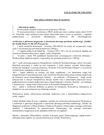 ZAŁĄCZNIK NR 2 DO SIWZ Opis zbioru obiektów klasy II (archiwa) I. Informacje ogólne: 1. Powierzchnia zasobów archiwum nie przekracza 300 mb. 2. W nowej przestrzeni w archiwum w PKiN archiwum wraz z szafami zajmie około 35-40 2 m . Pozostałą część pomieszczenia zajmą stanowiska pracy (wraz ze sprzętem i regałami podręcznymi) i przestrzeń udostępniania Archiwów dla odwiedzających. Archiwum w głównym magazynie w piwnicach dawnego pawilonu meblowego „Emilia” (ul. Emilii Plater 51, 00-125 Warszawa): 1. 3 szafy metalowe Konsmetal – wymiary 190x100x52 cm (szafy nie są pancerne, waga szafy z zawartością nie powinna przekroczyć 100 kg.). 2. 11 regałów półkowych MetaClip – wymiary 220 x 105 x 64 cm, na których znajduje się Archiwum Ptaszkowskiej (m.in. papier, szkło, fotografie). 3. 14 palet z około 850 pudełkami kartonowymi zawierającymi Archiwum Reklamy i Wielhorskiego (głównie papier), waga palety nie powinna przekroczyć 1200 kg. Ad.1 – szafy zawierają negatywy fotograficzne z archiwów Kossakowskiego, Libery i Kowalni. Materiały pozostaną w szafie na czas transportu, a luźne miejsca wypełni Zamawiający. Konieczny transport w pozycji pionowej. Wymiary szaf umożliwiają transport w tej pozycji również przez standardowe drzwi biurowe. Ad.2 – regały półkowe są otwarte, nie będą wypełnione i po demontażu mogą być transportowane w dowolnej pozycji. Całe Archiwum Ptaszkowskiej razem zostanie spakowane do kartonów przez Zamawiającego; kartony – po ustaleniu z Wykonawcą – mogą zostać umieszczone w skrzyni transportowej. Reszta zasobu wraz z materiałami pakowymi (m.in. pudła kartonowe) zostanie spakowana przez Zamawiającego w kartony. Kartony – po ustaleniu z Wykonawcą – mogą zostać umieszczone w skrzyniach transportowych. Ad.3 – palety z Archiwum Reklamy są gotowe do transportu. Wykonawca zabezpieczy je dodatkowo na czas transportu wg własnego uznania. Wykonawca będzie zobowiązany przenieść archiwum wraz z infrastrukturą magazynową (szafy, regały). Całość obiektów klasy II wraz z regałami i szafami ma zostać przewieziona przez Wykonawcę z archiwum w głównym magazynie w piwnicach dawnego pawilonu meblowego „Emilia” do Magazynu archiwów w Pałacu Kultury i Nauki na IX piętrze. Zamawiający wymaga wniesienia obiektów i infrastruktury do pomieszczenia. Zamawiający nie wymaga ustawiania infrastruktury magazynowej ani układania archiwów na regałach. Montaż i demontaż infrastruktury zostanie wykonany przez Zamawiającego; zapakowanie i zabezpieczenie regałów na czas przenosin jest po stronie Wykonawcy.