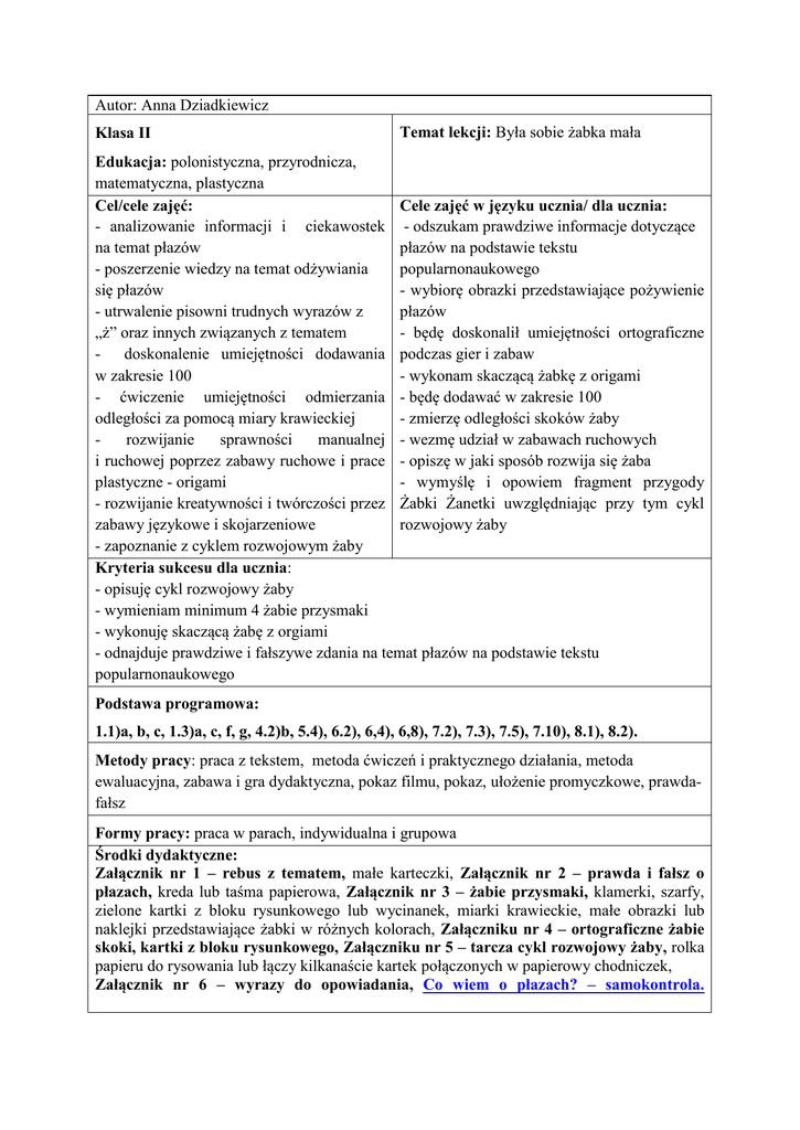 Autor: Anna Dziadkiewicz Klasa II Temat lekcji: Była sobie żabka mała Edukacja: polonistyczna, przyrodnicza, matematyczna, plastyczna Cel/cele zajęć: Cele zajęć w języku ucznia/ dla ucznia: - analizowanie informacji i ciekawostek - odszukam prawdziwe informacje dotyczące na temat płazów płazów na podstawie tekstu - poszerzenie wiedzy na temat odżywiania popularnonaukowego się płazów - wybiorę obrazki przedstawiające pożywienie - utrwalenie pisowni trudnych wyrazów z płazów „ż” oraz innych związanych z tematem - będę doskonalił umiejętności ortograficzne - doskonalenie umiejętności dodawania podczas gier i zabaw w zakresie 100 - wykonam skaczącą żabkę z origami - ćwiczenie umiejętności odmierzania - będę dodawać w zakresie 100 odległości za pomocą miary krawieckiej - zmierzę odległości skoków żaby rozwijanie sprawności manualnej - wezmę udział w zabawach ruchowych i ruchowej poprzez zabawy ruchowe i prace - opiszę w jaki sposób rozwija się żaba plastyczne - origami - wymyślę i opowiem fragment przygody - rozwijanie kreatywności i twórczości przez Żabki Żanetki uwzględniając przy tym cykl zabawy językowe i skojarzeniowe rozwojowy żaby - zapoznanie z cyklem rozwojowym żaby Kryteria sukcesu dla ucznia: - opisuję cykl rozwojowy żaby - wymieniam minimum 4 żabie przysmaki - wykonuję skaczącą żabę z orgiami - odnajduje prawdziwe i fałszywe zdania na temat płazów na podstawie tekstu popularnonaukowego Podstawa programowa: 1.1)a, b, c, 1.3)a, c, f, g, 4.2)b, 5.4), 6.2), 6,4), 6,8), 7.2), 7.3), 7.5), 7.10), 8.1), 8.2). Metody pracy: praca z tekstem, metoda ćwiczeń i praktycznego działania, metoda ewaluacyjna, zabawa i gra dydaktyczna, pokaz filmu, pokaz, ułożenie promyczkowe, prawdafałsz Formy pracy: praca w parach, indywidualna i grupowa Środki dydaktyczne: Załącznik nr 1 – rebus z tematem, małe karteczki, Załącznik nr 2 – prawda i fałsz o płazach, kreda lub taśma papierowa, Załącznik nr 3 – żabie przysmaki, klamerki, szarfy, zielone kartki z bloku rysunkowego lub wycinanek, miarki krawieckie, małe obrazki lub naklejki przedstawiające żabki w różnych kolorach, Załączniku nr 4 – ortograficzne żabie skoki, kartki z bloku rysunkowego, Załączniku nr 5 – tarcza cykl rozwojowy żaby, rolka papieru do rysowania lub łączy kilkanaście kartek połączonych w papierowy chodniczek, Załącznik nr 6 – wyrazy do opowiadania, Co wiem o płazach? – samokontrola. „Drogowskazy” -wskazówki i uwagi o realizacji 1. Zadanie na dobry początek Nauczyciel rozdaje dzieciom kartki, na których znajduje się rebus do rozwiązania. – Załącznik nr 1 – rebus z tematem. Rozwiązaniem rebusu jest zdanie określające główny cel lekcji: Poznam dziś płazy. Centra Aktywnej Edukacji polonistycznokomunikacyjne Po rozwiązaniu rebusu dzieci wklejają kartki do zeszytu pod tematem lekcji. I dopisują cele szczegółowe podyktowane przez nauczyciela. 2. Zabawmy się w skojarzenia. Dzieci siedzą w kole na dywanie Nauczyciel rozpoczyna rundę zabawy w skojarzenia słowem PŁAZ, kolejne dzieci podają swoje skojarzenie z poprzednim wyrazem. Następnie nauczyciel prosi dzieci by zapisały na małych karteczkach swoje skojarzenia z wyrazem ŻABA – warto określić minimalną liczbę skojarzeń np. 3. Później nauczyciel przyczepia do tablicy lub kładzie na dywanie karteczkę z napisem żaba, a dzieci układają dookoła swoje skojarzenia – ułożenie promyczkowe, tzn. karteczki z wyrazami o takim samym znaczeniu układają jako jeden promyczek. polonistycznokomunikacyjne 3. Praca z tekstem popularnonaukowym – Żabi detektyw. Nauczyciel rozdaje uczniom karty pracy - str. 1 – Załącznik nr 2 – prawda i fałsz o płazach. Zadaniem dzieci jest zaznaczenie literki P lub F przy zdaniach dotyczących płazów. Mogą się przy tym zadaniu konsultować w parach, jednak każdy zaznacza odpowiedzi na swojej karcie. W ten sposób sprawdzają i dzielą się swoją dotychczasową wiedzą. Następnie nauczyciel rozdaje parom tekst popularnonaukowy dotyczący płazów – str. 2 załącznika nr 2. Dzieci czytają tekst i odszukują w nim potrzebne informacje, a następnie porównują ze swoimi odpowiedziami z zadania prawda-fałsz. Pod tabelką poprawiają zdania – tak by zawierały prawdziwe informacje. Obie kartki można wkleić do zeszytu jako notatkę. matematycznoprzyrodnicze Nauczyciel przeprowadza z uczniami rozmowę z pokazem plansz i zdjęć przedstawiających wszystkie gatunki polskich płazów. Dzieci opisują ich wygląd i starają się zapamiętać ich cechy charakterystyczne. Wskazują na zdjęciach te płazy, o których była mowa w czytanym tekście. 4. Zabawa ruchowa „Bocian i żaby” Na boisku lub w klasie wyznaczamy staw (narysowane lub wyklejone artystycznoruchowe papierową taśmą koło). W środku małe kółeczko (wysepka dla bociana). „Bocian” stoi na wysepce – „żaby” w przysiadzie na obwodzie koła. Żaby pytają – „Panie bocianie, chcesz żabkę na śniadanie?”. Potem wskakują do stawu i wyskakują z niego, a bocian stara się je złapać w obrębie stawu. Złapane żabki zabiera na wyspę. Gdy złapie umówioną liczbę żab, wybiera się innego bociana. 5. Zabawa ruchowo-edukacyjna Żabki szukają jedzenia. Nauczyciel dzieli uczniów na dwie drużyny. Każda z nich otrzymuje krótki tekst na temat odżywiania się płazów. Jedno z dzieci w każdej drużynie odczytuje tekst na głos jak najszybciej – jednokrotnie i oddaje go nauczycielowi. Pozostali muszę się starać jak najwięcej z niego zapamiętać. Następnie ustawiają się w jednym końcu sali w dwóch rzędach jeden za drugim – są skaczącymi żabkami. Można w tym celu przygotować opaski z wizerunkiem żaby do włożenia na głowę. W drugim końcu sali - na przeciw obu drużyn nauczyciel umieszcza dwie szarfy, w których wnętrzu znajdują się spinacze do bielizny z naklejonymi obra