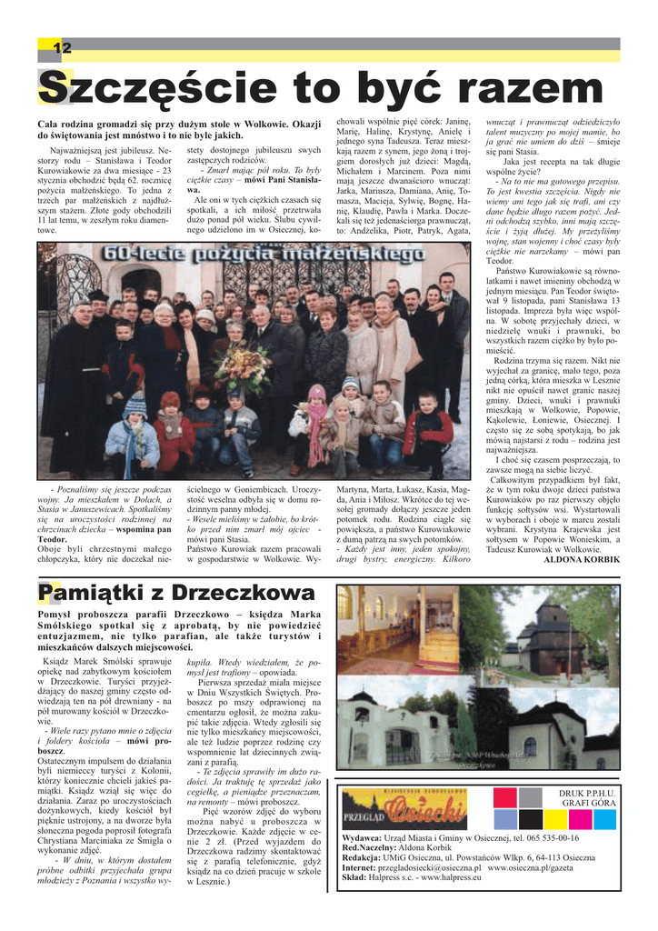 12 Szcz!"cie to by# razem Najwa#niejsz! jest jubileusz. Nestorzy rodu – Stanis$awa i Teodor Kurowiakowie za dwa miesi!ce - 23 stycznia obchodzi% b&d! 62. rocznic& po#ycia ma$#e"skiego. To jedna z trzech par ma$#e"skich z najd$u#szym sta#em. Z$ote gody obchodzili 11 lat temu, w zesz$ym roku diamentowe. stety dostojnego jubileuszu swych zast&pczych rodziców. - Zmar# maj$c pó# roku. To by#y ci"%kie czasy – mówi Pani Stanis!awa. Ale oni w tych ci&#kich czasach si& spotkali, a ich mi$o'% przetrwa$a du#o ponad pó$ wieku. (lubu cywilnego udzielono im w Osiecznej, ko- chowali wspólnie pi&% córek: Janin&, Mari&, Halin&, Krystyn&, Aniel& i jednego syna Tadeusza. Teraz mieszkaj! razem z synem, jego #on! i trojgiem doros$ych ju# dzieci: Magd!, Micha$em i Marcinem. Poza nimi maj! jeszcze dwana'cioro wnucz!t: Jarka, Mariusza, Damiana, Ani&, Tomasza, Macieja, Sylwi&, Bogn&, Hani&, Klaudi&, Paw$a i Marka. Doczekali si& te# jedena'ciorga prawnucz!t, to: And#elika, Piotr, Patryk, Agata, - Poznali!my si" jeszcze podczas wojny. Ja mieszka#em w Do#ach, a Stasia w Januszewicach. Spotkali!my si" na uroczysto!ci rodzinnej na chrzcinach dziecka – wspomina pan Teodor. Oboje byli chrzestnymi ma$ego ch$opczyka, który nie doczeka$ nie- 'cielnego w Goniembicach. Uroczysto'% weselna odby$a si& w domu rodzinnym panny m$odej. - Wesele mieli!my w %a#obie, bo krótko przed nim zmar# mój ojciec mówi pani Stasia. Pa"stwo Kurowiak razem pracowali w gospodarstwie w Wolkowie. Wy- Martyna, Marta, )ukasz, Kasia, Magda, Ania i Mi$osz. Wkrótce do tej weso$ej gromady do$!czy jeszcze jeden potomek rodu. Rodzina ci!gle si& powi&ksza, a pa"stwo Kurowiakowie z dum! patrz! na swych potomków. - Ka%dy jest inny, jeden spokojny, drugi bystry, energiczny. Kilkoro Ca!a rodzina gromadzi si" przy du#ym stole w Wolkowie. Okazji do $wi"towania jest mnóstwo i to nie byle jakich. wnucz$t i prawnucz$t odziedziczy#o talent muzyczny po mojej mamie, bo ja gra& nie umiem do dzi! – 'mieje si& pani Stasia. Jaka jest recepta na tak d$ugie wspólne #ycie? - Na to nie ma gotowego przepisu. To jest kwestia szcz"!cia. Nigdy nie wiemy ani tego jak si" trafi, ani czy dane b"dzie d#ugo razem po%y&. Jedni odchodz$ szybko, inni maj$ szcz"!cie i %yj$ d#u%ej. My prze%yli!my wojn", stan wojenny i cho& czasy by#y ci"%kie nie narzekamy – mówi pan Teodor. Pa"stwo Kurowiakowie s! równolatkami i nawet imieniny obchodz! w jednym miesi!cu. Pan Teodor 'wi&towa$ 9 listopada, pani Stanis$awa 13 listopada. Impreza by$a wi&c wspólna. W sobot& przyjecha$y dzieci, w niedziel& wnuki i prawnuki, bo wszystkich razem ci&#ko by by$o pomie'ci%. Rodzina trzyma si& razem. Nikt nie wyjecha$ za granic&, ma$o tego, poza jedn! córk!, która mieszka w Lesznie nikt nie opu'ci$ nawet granic naszej gminy. Dzieci, wnuki i prawnuki mieszkaj! w Wolkowie, Popowie, K!kolewie, )oniewie, Osiecznej. I cz&sto si& ze sob! spotykaj!, bo jak mówi! najstarsi z rodu – rodzina jest najwa#niejsza. I cho% si& czasem posprzeczaj!, to zawsze mog! na siebie liczy%. Ca$kowitym przypadkiem by$ fakt, #e w tym roku dwoje dzieci pa"stwa Kurowiaków po raz pierwszy obj&$o funkcj& so$tysów wsi. Wystartowali w wyborach i oboje w marcu zostali wybrani. Krystyna Krajewska jest so$tysem w Popowie Wonieskim, a Tadeusz Kurowiak w Wolkowie. ALDONA KORBIK Pami$tki z Drzeczkowa Pomys! proboszcza parafii Drzeczkowo – ksi"dza Marka Smólskiego spotka! si" z aprobat%, by nie powiedzie& entuzjazmem, nie tylko parafian, ale tak#e turystów i mieszka'ców dalszych miejscowo$ci. Ksi!dz Marek Smólski sprawuje opiek& nad zabytkowym ko'cio$em w Drzeczkowie. Tury'ci przyje#d#aj!cy do naszej gminy cz&sto odwiedzaj! ten na pó$ drewniany - na pó$ murowany ko'ció$ w Drzeczkowie. - Wiele razy pytano mnie o zdj"cia i foldery ko!cio#a – mówi proboszcz. Ostatecznym impulsem do dzia$ania byli niemieccy tury'ci z Kolonii, którzy koniecznie chcieli jakie' pami!tki. Ksi!dz wzi!$ si& wi&c do dzia$ania. Zaraz po uroczysto'ciach do#ynkowych, kiedy ko'ció$ by$ pi&knie ustrojony, a na dworze by$a s$oneczna pogoda poprosi$ fotografa Chrystiana Marciniaka ze (migla o wykonanie zdj&%. - W dniu, w którym dosta#em próbne odbitki przyjecha#a grupa m#odzie%y z Poznania i wszystko wy- kupi#a. Wtedy wiedzia#em, %e pomys# jest trafiony – opowiada. Pierwsza sprzeda# mia$a miejsce w Dniu Wszystkich (wi&tych. Proboszcz po mszy odprawionej na cmentarzu og$osi$, #e mo#na zakupi% takie zdj&cia. Wtedy zg$osili si& nie tylko mieszka"cy miejscowo'ci, ale te# ludzie poprzez rodzin& czy wspomnienie lat dziecinnych zwi!zani z parafi!. - Te zdj"cia sprawi#y im du%o rado!ci. Ja traktuj" t" sprzeda% jako cegie#k", a pieni$dze przeznaczam, na remonty – mówi proboszcz. Pi&% wzorów zdj&% do wyboru mo#na naby% u proboszcza w Drzeczkowie. Ka#de zdj&cie w cenie 2 z$. (Przed wyjazdem do Drzeczkowa radzimy skontaktowa% si& z parafi! telefonicznie, gdy# ksi!dz na co dzie" pracuje w szkole w Lesznie.) DRUK P.P.H.U. GRAFI GÓRA Wydawca: Urz!d Miasta i Gminy w Osiecznej, tel. 065 535-00-16 Red.Naczelny: Aldona Korbik Redakcja: UMiG Osieczna, ul. Powsta"ców Wlkp. 6, 64-113 Osieczna Internet: [email protected] www.osieczna.pl/gazeta Sk!ad: Halpress s.c. - www.halpress.eu
