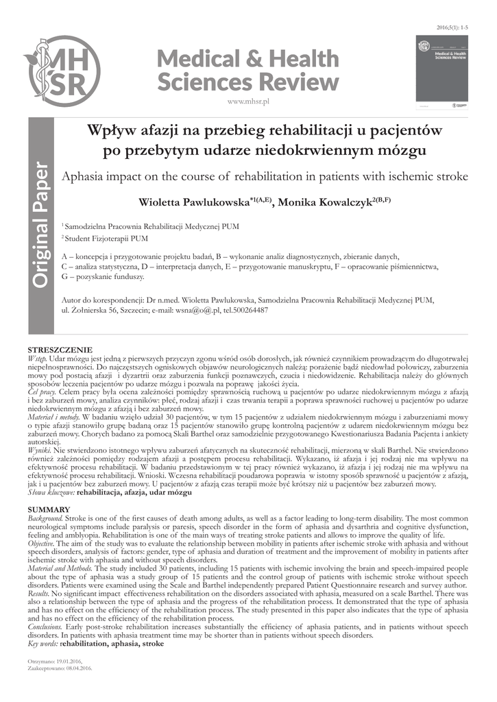 2016;5(1): 1-5 www.mhsr.pl Original Paper Wpływ afazji na przebieg rehabilitacji u pacjentów po przebytym udarze niedokrwiennym mózgu Aphasia impact on the course of rehabilitation in patients with ischemic stroke Wioletta Pawlukowska*1(A,E), Monika Kowalczyk2(B,F) 1 2 Samodzielna Pracownia Rehabilitacji Medycznej PUM Student Fizjoterapii PUM A – koncepcja i przygotowanie projektu badań, B – wykonanie analiz diagnostycznych, zbieranie danych, C – analiza statystyczna, D – interpretacja danych, E – przygotowanie manuskryptu, F – opracowanie piśmiennictwa, G – pozyskanie funduszy. Autor do korespondencji: Dr n.med. Wioletta Pawlukowska, Samodzielna Pracownia Rehabilitacji Medycznej PUM, ul. Żołnierska 56, Szczecin; e-mail: wsna@[email protected], tel.500264487 STRESZCZENIE Wstęp. Udar mózgu jest jedną z pierwszych przyczyn zgonu wśród osób dorosłych, jak również czynnikiem prowadzącym do długotrwałej niepełnosprawności. Do najczęstszych ogniskowych objawów neurologicznych należą: porażenie bądź niedowład połowiczy, zaburzenia mowy pod postacią afazji i dyzartrii oraz zaburzenia funkcji poznawczych, czucia i niedowidzenie. Rehabilitacja należy do głównych sposobów leczenia pacjentów po udarze mózgu i pozwala na poprawę jakości życia. Cel pracy. Celem pracy była ocena zależności pomiędzy sprawnością ruchową u pacjentów po udarze niedokrwiennym mózgu z afazją i bez zaburzeń mowy, analiza czynników: płeć, rodzaj afazji i czas trwania terapii a poprawa sprawności ruchowej u pacjentów po udarze niedokrwiennym mózgu z afazją i bez zaburzeń mowy. Materiał i metody. W badaniu wzięło udział 30 pacjentów, w tym 15 pacjentów z udziałem niedokrwiennym mózgu i zaburzeniami mowy o typie afazji stanowiło grupę badaną oraz 15 pacjentów stanowiło grupę kontrolną pacjentów z udarem niedokrwiennym mózgu bez zaburzeń mowy. Chorych badano za pomocą Skali Barthel oraz samodzielnie przygotowanego Kwestionariusza Badania Pacjenta i ankiety autorskiej. Wyniki. Nie stwierdzono istotnego wpływu zaburzeń afatycznych na skuteczność rehabilitacji, mierzoną w skali Barthel. Nie stwierdzono również zależności pomiędzy rodzajem afazji a postępem procesu rehabilitacji. Wykazano, iż afazja i jej rodzaj nie ma wpływu na efektywność procesu rehabilitacji. W badaniu przedstawionym w tej pracy również wykazano, iż afazja i jej rodzaj nie ma wpływu na efektywność procesu rehabilitacji. Wnioski. Wczesna rehabilitacji poudarowa poprawia w istotny sposób sprawność u pacjentów z afazją, jak i u pacjentów bez zaburzeń mowy. U pacjentów z afazją czas terapii może być krótszy niż u pacjentów bez zaburzeń mowy. Słowa kluczowe: rehabilitacja, afazja, udar mózgu SUMMARY Background. Stroke is one of the first causes of death among adults, as well as a factor leading to long-term disability. The most common neurological symptoms include paralysis or paresis, speech disorder in the form of aphasia and dysarthria and cognitive dysfunction, feeling and amblyopia. Rehabilitation is one of the main ways of treating stroke patients and allows to improve the quality of life. Objective. The aim of the study was to evaluate the relationship between mobility in patients after ischemic stroke with aphasia and without speech disorders, analysis of factors: gender, type of aphasia and duration of treatment and the improvement of mobility in patients after ischemic stroke with aphasia and without speech disorders. Material and Methods. The study included 30 patients, including 15 patients with ischemic involving the brain and speech-impaired people about the type of aphasia was a study group of 15 patients and the control group of patients with ischemic stroke without speech disorders. Patients were examined using the Scale and Barthel independently prepared Patient Questionnaire research and survey author. Results. No significant impact effectiveness rehabilitation on the disorders associated with aphasia, measured on a scale Barthel. There was also a relationship between the type of aphasia and the progress of the rehabilitation process. It demonstrated that the type of aphasia and has no effect on the efficiency of the rehabilitation process. The study presented in this paper also indicates that the type of aphasia and has no effect on the efficiency of the rehabilitation process. Conclusions. Early post-stroke rehabilitation increases substantially the efficiency of aphasia patients, and in patients without speech disorders. In patients with aphasia treatment time may be shorter than in patients without speech disorders. Key words: rehabilitation, aphasia, stroke Otrzymano: 19.01.2016, Zaakceptowano: 08.04.2016. Wioletta Pawlukowska, Monika Kowalczyk Wpływ afazji na przebieg rehabilitacji u pacjentów po przebytym udarze niedokrwiennym mózgu WSTĘP Udar mózgu jest jedną z pierwszych przyczyn zgonu wśród osób dorosłych, jak również czynnikiem prowadzącym do długotrwałej niepełnosprawności. W ciągu roku około 15 mln ludzi na całym świecie doznaje udaru mózgu, spośród których około 5 mln umiera oraz kolejne 5 mln cechuje trwała niepełnosprawność. Udar niedokrwienny stanowi około 80% wszystkich przypadków. Do najczęstszych ogniskowych objawów neurologicznych należą: porażenie bądź niedowład połowiczy, zaburzenia mowy pod postacią afazji (21-38%) i dyzartrii oraz zaburzenia funkcji poznawczych, czucia i niedowidzenie [1]. Głównym czynnikiem wpływającym na poprawę sprawności ruchowej pacjenta jest współpraca pomiędzy terapeutą, a pacjentem[2]. Celem pracy była ocena zależności pomiędzy sprawnością ruchową u pacjentów po udarze niedokrwiennym mózgu z afazją i bez zaburzeń mowy, analiza czynników: płeć, rodzaj afazji i czas trwania terapii a poprawa sprawności ruchowej u pacjentów po udarze niedokrwiennym mózgu z afazją i bez zaburzeń mowy. MATERIAŁ I METODY W ba