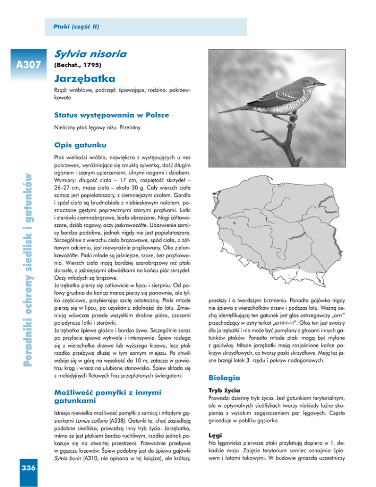 Ptaki (cz´Êç II) Sylvia nisoria A307 (Bechst., 1795) Jarz´batka Rzàd: wróblowe, podrzàd: Êpiewajàce, rodzina: pokrzewkowate Status wyst´powania w Polsce Nieliczny ptak l´gowy ni˝u. Przelotny. Poradniki ochrony siedlisk i gatunków Opis gatunku Ptak wielkoÊci wróbla, najwi´ksza z wyst´pujàcych u nas pokrzewek, wyró˝niajàca si´ smuk∏à sylwetkà, doÊç d∏ugim ogonem i szarym upierzeniem, silnymi nogami i dziobem. Wymiary: d∏ugoÊç cia∏a – 17 cm, rozpi´toÊç skrzyde∏ – 26–27 cm, masa cia∏a – oko∏o 30 g. Ca∏y wierzch cia∏a samca jest popielatoszary, z ciemniejszym czo∏em. Gard∏o i spód cia∏a sà brudnobia∏e z niebieskawym nalotem, poznaczone g´stymi poprzecznymi szarymi prà˝kami. Lotki i sterówki ciemnobràzowe, bia∏o obrze˝one. Nogi ˝ó∏tawoszare, dziób rogowy, oczy jaskrawo˝ó∏te. Ubarwienie samicy bardzo podobne, jednak nigdy nie jest popielatoszare. Szczególnie z wierzchu cia∏o bràzowawe, spód cia∏a, o ˝ó∏tawym odcieniu, jest niewyraênie prà˝kowany. Oko zielonkawo˝ó∏te. Ptaki m∏ode sà jaÊniejsze, szare, bez prà˝kowania. Wierzch cia∏a majà bardziej szarobràzowy ni˝ ptaki doros∏e, z jaÊniejszymi obwódkami na koƒcu piór skrzyde∏. Oczy m∏odych sà bràzowe. Jarz´batka pierzy si´ ca∏kowicie w lipcu i sierpniu. Od po∏owy grudnia do koƒca marca pierzy si´ ponownie, ale tylko cz´Êciowo, przybierajàc szat´ ostatecznà. Ptaki m∏ode pierzà si´ w lipcu, po uzyskaniu zdolnoÊci do lotu. Zmieniajà wówczas przede wszystkim drobne pióra, czasami pojedyncze lotki i sterówki. Jarz´batka Êpiewa g∏oÊno i bardzo ˝ywo. Szczególnie zaraz po przylocie Êpiewa wytrwale i intensywnie. Âpiew rozlega si´ z wierzcho∏ka drzewa lub wy˝szego krzewu, lecz ptak rzadko przebywa d∏u˝ej w tym samym miejscu. Po chwili wzbija si´ w gór´ na wysokoÊç do 10 m, zatacza w powietrzu kràg i wraca na ulubione stanowisko. Âpiew sk∏ada si´ z melodyjnych fletowych fraz przeplatanych Êwiergotem. Mo˝liwoÊç pomy∏ki z innymi gatunkami Istnieje niewielka mo˝liwoÊç pomy∏ki z samicà i m∏odymi gàsiorkami Lanius collurio (A338). Gatunki te, choç zasiedlajà podobne siedliska, prowadzà inny tryb ˝ycia. Jarz´batka, mimo ˝e jest ptakiem bardzo ruchliwym, rzadko jednak pokazuje si´ na otwartej przestrzeni. Przewa˝nie przebywa w gàszczu krzewów. Âpiew podobny jest do Êpiewu gajówki Sylvia borin (A310, nie opisana w tej ksià˝ce), ale krótszy, 336 jarz´batka prostszy i o twardszym brzmieniu. Ponadto gajówka nigdy nie Êpiewa z wierzcho∏ków drzew i podczas lotu. Wa˝nà cechà identyfikujàcà ten gatunek jest g∏os ostrzegawczy „arrr” przechodzàcy w ostry terkot „errrt-t-t-t”. G∏os ten jest swoisty dla jarz´batki i nie mo˝e byç pomylony z g∏osami innych gatunków ptaków. Ponadto m∏ode ptaki mogà byç mylone z gajówkà. M∏ode jarz´batki majà rozjaÊnione koƒce pokrzyw skrzyd∏owych, co tworzy paski skrzyd∏owe. Majà te˝ jasne brzegi lotek 3. rz´du i pokryw nadogonowych. Biologia Tryb ˝ycia Prowadzi dzienny tryb ˝ycia. Jest gatunkiem terytorialnym, ale w optymalnych siedliskach tworzy niekiedy luêne skupienia z wysokim zag´szczeniem par l´gowych. Cz´sto gniazduje w pobli˝u gàsiorka. L´gi Na l´gowiska pierwsze ptaki przylatujà dopiero w 1. dekadzie maja. Zaj´cie terytorium samiec oznajmia Êpiewem i lotami tokowymi. W budowie gniazda uczestniczy Silvia nisoria (Jarz´batka) W´drówki Jarz´batka jest migrantem dalekoodystansowym. Przylot na l´gowiska jest póêny – na poczàtku maja, a odlot nast´puje ju˝ w sierpniu. W´drówka zarówno jesienna, jak i wiosenna jest ma∏o wyraêna, ze wzgl´du na skryty tryb ˝ycia i strategi´ w´drówki polegajàcà na przelotach na d∏ugie dystanse oraz krótkich i rzadkich przerwach w migracji. Podczas w´drówki jesiennej ptaki europejskie lecà przez wschodni obszar Morza Âródziemnego i wybrze˝e Morza Czerwonego do Afryki Wschodniej. Kilka jesiennych wiadomoÊci o obràczkowanych w Polsce ptakach pochodzi z Syrii i Libanu Zimowanie Zimowiska jarz´batki znajdujà si´ we wschodniej Afryce na po∏udnie od równika – w Ugandzie, Kenii, Tanzanii i rzadko w Sudanie. W Sudanie zosta∏a stwierdzona jedna z nielicznych obràczkowanych w Polsce jarz´batek. Cz´Êç ptaków zimuje tak˝e na Pó∏wyspie Arabskim. Na zimowiskach spotykana jest na obszarach g´sto zakrzewionych. Pokarm Wiosnà i wczesnym latem g∏ówny pokarm stanowià owady i inne drobne bezkr´gowce. W pokarmie jarz´batki stwierdzano najcz´Êciej nagie larwy ró˝nych owadów, mo- tyle, drobne chrzàszcze i prostoskrzyd∏e oraz pajàki. Wyjàtkowo chwyta drobne kr´gowce, jak np. ma∏e jaszczurki. W miesiàcach letnich, szczególnie w sierpniu i wrzeÊniu, jej pokarm stanowià w znacznej mierze dojrzewajàce owoce bzu czarnego i koralowego, porzeczek, szak∏aków i innych krzewów jagodowych. A307 Wyst´powanie Siedlisko Jarz´batka zasiedla przede wszystkim krajobraz rolniczy i doliny rzeczne ze zró˝nicowanymi strukturalnie wielowarstwowymi zadrzewieniami. Gniazduje w liÊciastych zaroÊlach, cz´sto kolczastych, wzd∏u˝ polnych dróg, nad drobnymi ciekami, zbiornikami wodnymi, na torfowiskach, w k´pach Êródpolnych zadrzewieƒ, ˝ywop∏otach, k´pach drzew i krzewów na ∏àkach wszystkich typów, na ugorach i terenach ruderalnych, nas∏onecznionych zboczach i nasypach. W dolinach rzek gnieêdzi si´ w nadrzecznych ∏ozowiskach. W lasach gniazduje g∏ównie na ich obrze˝ach, cz´sto tam, gdzie wyst´pujà p∏aty je˝yn oraz w iglastych m∏odnikach. Nielicznie gnieêdzi si´ na peryferiach miast i w parkach. Siedliska z za∏àcznika I Dyrektywy Siedliskowej, które mogà byç istotne dla gatunku 4030 Suche wrzosowiska (Calluno-Genistion, Pohlio-Callunion, Calluno-Arctostaphylion) 6510 Ni˝owe i górskie Êwie˝e ∏àki u˝ytkowane ekstensywnie (Arrhenatherion elatioris) 7110 Torfowiska w