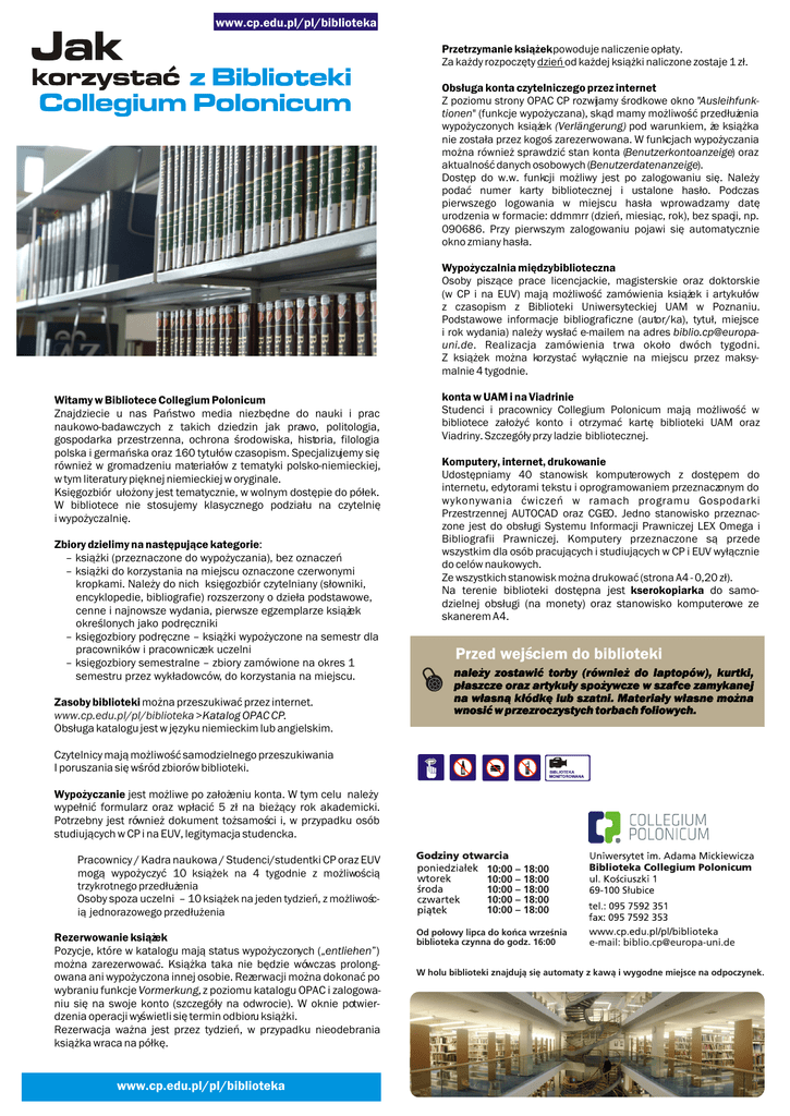 www.cp.edu.pl/pl/biblioteka Przetrzymanie ksi¹¿ek powoduje naliczenie op³aty. Za ka¿dy rozpoczêty dzieñ od ka¿dej ksi¹¿ki naliczone zostaje 1 z³. Obs³uga konta czytelniczego przez internet Z poziomu strony OPAC CP rozwijamy œrodkowe okno "Ausleihfunktionen" (funkcje wypo¿yczana), sk¹d mamy mo¿liwoœæ przed³u¿enia wypo¿yczonych ksi¹¿ek (Verlängerung) pod warunkiem, ¿e ksi¹¿ka nie zosta³a przez kogoœ zarezerwowana. W funkcjach wypo¿yczania mo¿na równie¿ sprawdziæ stan konta (Benutzerkontoanzeige) oraz aktualnoœæ danych osobowych (Benutzerdatenanzeige). Dostêp do w.w. funkcji mo¿liwy jest po zalogowaniu siê. Nale¿y podaæ numer karty bibliotecznej i ustalone has³o. Podczas pierwszego logowania w miejscu has³a wprowadzamy datê urodzenia w formacie: ddmmrr (dzieñ, miesi¹c, rok), bez spacji, np. 090686. Przy pierwszym zalogowaniu pojawi siê automatycznie okno zmiany has³a. Wypo¿yczalnia miêdzybiblioteczna Osoby pisz¹ce prace licencjackie, magisterskie oraz doktorskie (w CP i na EUV) maj¹ mo¿liwoœæ zamówienia ksi¹¿ek i artyku³ów z czasopism z Biblioteki Uniwersyteckiej UAM w Poznaniu. Podstawowe informacje bibliograficzne (autor/ka), tytu³, miejsce i rok wydania) nale¿y wys³aæ e-mailem na adres [email protected]. Realizacja zamówienia trwa oko³o dwóch tygodni. Z ksi¹¿ek mo¿na korzystaæ wy³¹cznie na miejscu przez maksymalnie 4 tygodnie. Witamy w Bibliotece Collegium Polonicum Znajdziecie u nas Pañstwo media niezbêdne do nauki i prac naukowo-badawczych z takich dziedzin jak prawo, politologia, gospodarka przestrzenna, ochrona œrodowiska, historia, filologia polska i germañska oraz 160 tytu³ów czasopism. Specjalizujemy siê równie¿ w gromadzeniu materia³ów z tematyki polsko-niemieckiej, w tym literatury piêknej niemieckiej w oryginale. Ksiêgozbiór u³o¿ony jest tematycznie, w wolnym dostêpie do pó³ek. W bibliotece nie stosujemy klasycznego podzia³u na czytelniê i wypo¿yczalniê. Zbiory dzielimy na nastêpuj¹ce kategorie: – ksi¹¿ki (przeznaczone do wypo¿yczania), bez oznaczeñ – ksi¹¿ki do korzystania na miejscu oznaczone czerwonymi kropkami. Nale¿y do nich ksiêgozbiór czytelniany (s³owniki, encyklopedie, bibliografie) rozszerzony o dzie³a podstawowe, cenne i najnowsze wydania, pierwsze egzemplarze ksi¹¿ek okreœlonych jako podrêczniki – ksiêgozbiory podrêczne – ksi¹¿ki wypo¿yczone na semestr dla pracowników i pracowniczek uczelni – ksiêgozbiory semestralne – zbiory zamówione na okres 1 semestru przez wyk³adowców, do korzystania na miejscu. Zasoby biblioteki mo¿na przeszukiwaæ przez internet. www.cp.edu.pl/pl/biblioteka > Katalog OPAC CP. Obs³uga katalogu jest w jêzyku niemieckim lub angielskim. konta w UAM i na Viadrinie Studenci i pracownicy Collegium Polonicum maj¹ mo¿liwoœæ w bibliotece za³o¿yæ konto i otrzymaæ kartê biblioteki UAM oraz Viadriny. Szczegó³y przy ladzie bibliotecznej. Komputery, internet, drukowanie Udostêpniamy 40 stanowisk komputerowych z dostêpem do internetu, edytorami tekstu i oprogramowaniem przeznaczonym do wykonywania æwiczeñ w ramach programu Gospodarki Przestrzennej AUTOCAD oraz CGEO. Jedno stanowisko przeznaczone jest do obs³ugi Systemu Informacji Prawniczej LEX Omega i Bibliografii Prawniczej. Komputery przeznaczone s¹ przede wszystkim dla osób pracuj¹cych i studiuj¹cych w CP i EUV wy³¹cznie do celów naukowych. Ze wszystkich stanowisk mo¿na drukowaæ (strona A4 - 0,20 z³). Na terenie biblioteki dostêpna jest kserokopiarka do samodzielnej obs³ugi (na monety) oraz stanowisko komputerowe ze skanerem A4. nale¿y zostawiæ torby (równie¿ do laptopów), kurtki, p³aszcze oraz artyku³y spo¿ywcze w szafce zamykanej na w³asn¹ k³ódkê lub szatni. Materia³y w³asne mo¿na wnosiæ w przezroczystych torbach foliowych. Czytelnicy maj¹ mo¿liwoœæ samodzielnego przeszukiwania I poruszania siê wœród zbiorów biblioteki. Wypo¿yczanie jest mo¿liwe po za³o¿eniu konta. W tym celu nale¿y wype³niæ formularz oraz wp³aciæ 5 z³ na bie¿¹cy rok akademicki. Potrzebny jest równie¿ dokument to¿samoœci i, w przypadku osób studiuj¹cych w CP i na EUV, legitymacja studencka. — Pracownicy / Kadra naukowa / Studenci/studentki CP oraz EUV mog¹ wypo¿yczyæ 10 ksi¹¿ek na 4 tygodnie z mo¿liwoœci¹ trzykrotnego przed³u¿enia — Osoby spoza uczelni – 10 ksi¹¿ek na jeden tydzieñ, z mo¿liwoœci¹ jednorazowego przed³u¿enia Rezerwowanie ksi¹¿ek Pozycje, które w katalogu maj¹ status wypo¿yczonych („entliehen”) mo¿na zarezerwowaæ. Ksi¹¿ka taka nie bêdzie wówczas prolongowana ani wypo¿yczona innej osobie. Rezerwacji mo¿na dokonaæ po wybraniu funkcje Vormerkung, z poziomu katalogu OPAC i zalogowaniu siê na swoje konto (szczegó³y na odwrocie). W oknie potwierdzenia operacji wyœwietli siê termin odbioru ksi¹¿ki. Rezerwacja wa¿na jest przez tydzieñ, w przypadku nieodebrania ksi¹¿ka wraca na pó³kê. www.cp.edu.pl/pl/biblioteka 10:00 – 18:00 10:00 – 18:00 10:00 – 18:00 10:00 – 18:00 10:00 – 18:00 Od po³owy lipca do koñca wrzeœnia biblioteka czynna do godz. 16:00 e-mail: [email protected] W holu biblioteki znajduj¹ siê automaty z kaw¹ i wygodne miejsce na odpoczynek.