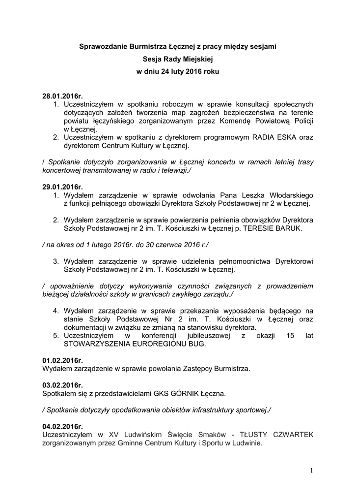 Sprawozdanie Burmistrza Łęcznej z pracy między sesjami Sesja Rady Miejskiej w dniu 24 luty 2016 roku 28.01.2016r. 1. Uczestniczyłem w spotkaniu roboczym w sprawie konsultacji społecznych dotyczących założeń tworzenia map zagrożeń bezpieczeństwa na terenie powiatu łęczyńskiego zorganizowanym przez Komendę Powiatową Policji w Łęcznej. 2. Uczestniczyłem w spotkaniu z dyrektorem programowym RADIA ESKA oraz dyrektorem Centrum Kultury w Łęcznej. / Spotkanie dotyczyło zorganizowania w Łęcznej koncertu w ramach letniej trasy koncertowej transmitowanej w radiu i telewizji./ 29.01.2016r. 1. Wydałem zarządzenie w sprawie odwołania Pana Leszka Włodarskiego z funkcji pełniącego obowiązki Dyrektora Szkoły Podstawowej nr 2 w Łęcznej. 2. Wydałem zarządzenie w sprawie powierzenia pełnienia obowiązków Dyrektora Szkoły Podstawowej nr 2 im. T. Kościuszki w Łęcznej p. TERESIE BARUK. / na okres od 1 lutego 2016r. do 30 czerwca 2016 r./ 3. Wydałem zarządzenie w sprawie udzielenia pełnomocnictwa Dyrektorowi Szkoły Podstawowej nr 2 im. T. Kościuszki w Łęcznej. / upoważnienie dotyczy wykonywania czynności związanych z prowadzeniem bieżącej działalności szkoły w granicach zwykłego zarządu./ 4. Wydałem zarządzenie w sprawie przekazania wyposażenia będącego na stanie Szkoły Podstawowej Nr 2 im. T. Kościuszki w Łęcznej oraz dokumentacji w związku ze zmianą na stanowisku dyrektora. 5. Uczestniczyłem w konferencji jubileuszowej z okazji 15 lat STOWARZYSZENIA EUROREGIONU BUG. 01.02.2016r. Wydałem zarządzenie w sprawie powołania Zastępcy Burmistrza. 03.02.2016r. Spotkałem się z przedstawicielami GKS GÓRNIK Łęczna. / Spotkanie dotyczyły opodatkowania obiektów infrastruktury sportowej./ 04.02.2016r. Uczestniczyłem w XV Ludwińskim Święcie Smaków - TŁUSTY CZWARTEK zorganizowanym przez Gminne Centrum Kultury i Sportu w Ludwinie. 1 05.02.2016r. Odbyło się spotkanie organizacyjne z dyrektorami szkół i przedszkoli w sprawie obchodów Dni Łęcznej. 07.02.2016r. Uczestniczyłem w zebraniu sprawozdawczym OSP ZAKRZÓW. 08.02.2016r. Uczestniczyłem w negocjacjach w Starostwie Powiatowym w Łęcznej. / Negocjacje dotyczyły wypłaty odszkodowania za działkę nr 749/1 o pow. 186m2 oraz nr 751/1 o powierzchni 579m2 położonych w Łęcznej, które z mocy prawa przeszły na własność Skarbu Państwa z przeznaczeniem pod drogę krajową na podstawie decyzji zatwierdzających podziały działek nr 749 oraz 751. Do ugody nie doszło, ze względu na niską kwotę odszkodowania zaproponowaną przez przedstawiciela Starosty Łęczyńskiego. / 09.02.2016r. 1. Przeprowadziłem negocjacje z JMZ INWESTYCJE Sp. cywilna. / dotyczy nieruchomości oznaczonej wg ewidencji gruntów numerami działek 3178/9 o powierzchni 170m2 oraz 3178/10 o powierzchni 219m2 położonej w Łęcznej, przeznaczonej według planu zagospodarowania przestrzennego pod ulicę dojazdową- ulica Wacława Jawoszka, za cenę ustaloną w drodze rokowań tj. 10.000,00 zł./ 2. Uczestniczyłem w konsultacjach społecznych dotyczących założeń tworzenia map zagrożeń bezpieczeństwa na terenie powiatu łęczyńskiego zorganizowanych przez Komendę Powiatową Policji w Łęcznej. 10.02.2016r. 1. Uczestniczyłem w posiedzeniu Komisji Rewizyjnej Rady Miejskiej w Łęcznej. 2. Odbyło się spotkanie z przedstawicielami firmy BIOWATT S.A. w sprawie odmetanowania składowiska odpadów. 11.02.2016r. 1. Uczestniczyłem w spotkaniu konsultacyjnym partnerów projektu WIRTUALNE POWIATY 3. 2. Udział Zastępcy Burmistrza p. Leszka Włodarskiego w spotkaniu organizacyjnym z dyrektorami szkół i przedszkoli w sprawie obchodów DNI ŁĘCZNEJ 3. Uczestniczyłem w spotkaniu przedmeczowym dotyczącym omówienia zasad bezpieczeństwa w trakcie trwania imprezy masowej zorganizowanym przez Komendę Powiatową Policji w Łęcznej. 2 12.02.2016r. 1. Wydałem zarządzenie w sprawie zbycia nieruchomości stanowiącej mienie komunalne w drodze bezprzetargowej. / dotyczy nieruchomości gruntowej oznaczonej wg ewidencji gruntów numerem działki 3107/13 o pow. 0,0027 ha, położonej w Łęcznej na rzecz PGE Dystrybucja S.A. z siedzibą w Lublinie za kwotę 5.265,00zł+ VAT, zbycie nieruchomości następuje w celu realizacji urządzeń infrastruktury technicznej./ 2. Wydałem zarządzenie w sprawie nabycia prawa własności nieruchomości do zasobu gminnego. / dotyczy nieruchomości oznaczonej wg ewidencji gruntów numerami działek 3178/9 o powierzchni 0,0170 ha oraz 3178/10 o powierzchni 0,0219 ha położonych w Łęcznej za cenę ustaloną w drodze rokowań, tj. 10.000,00 zł od JMZ INWESTYCJE Sp. cywilna ./ 3. Wydałem zarządzenie w sprawie Regulaminu Organizacyjnego Urzędu Miejskiego w Łęcznej w warunkach zewnętrznego zagrożenia bezpieczeństwa państwa i w czasie wojny. 4. Uczestniczyłem w spotkaniu w Starostwie Powiatowym w Łęcznej dotyczących założeń tworzenia map zagrożeń bezpieczeństwa na terenie powiatu łęczyńskiego zorganizowanym przez Komendę Powiatową Policji w Łęcznej. 16.02.2016r. Uczestniczyłem w posiedzeniu Komitetu Sterującego w ramach projektu pn. „Wzmocnienie spójności społecznej, gospodarczej i terytorialnej w Obszarze Funkcjonalnym SZLAKU JANA III SOBIESKIEGO w województwie lubelskim”. 17.02.2016r. 1. Przyjąłem p. BOŻENĘ OLEKSY audytora wewnętrznego. 2. Uczestniczyłem w spotkaniu zorganizowanym przez Starostwo Powiatowe w Łęcznej w sprawie PROGRAMU ROZWOJU OBSZARÓW WIEJSKICH na lata 2014-2020. / Spotkanie dotyczyło współudziału gmin w modernizacji dróg powiatowych./ 19.02.2016r. 1. Uczestniczyłem w posiedzeniu Rady Nadzorczej ŁĘCZYŃSKIEJ ENERGETYKI SP. z o.o. w Bogdance. 2. Udział Zastępcy Burmistrza p. Leszka Włodarskiego w spotkaniu w FUNDACJI ROZWOJU LUBELSZCZYZNY. / Spotkanie dotyczyły ewentualnego aplikowania o środki Unii Europejskiej w ramach inicjatywy URBAN INNOVATIVE ACTIONS. Celem inicjatywy jest rozpoznanie i przetestowani