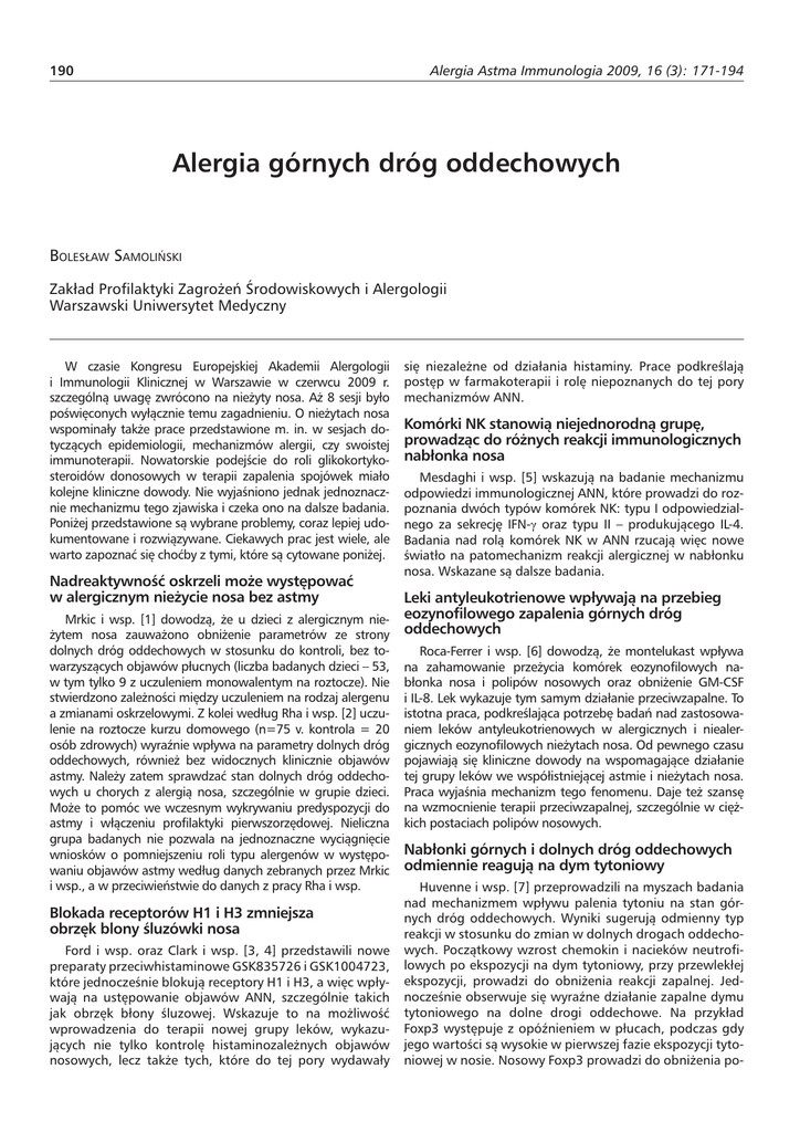 190 Alergia Astma Immunologia 2009, 16 (3): 171-194 Alergia górnych dróg oddechowych BOLESŁAW SAMOLIŃSKI Zakład Profilaktyki Zagrożeń Środowiskowych i Alergologii Warszawski Uniwersytet Medyczny W czasie Kongresu Europejskiej Akademii Alergologii i Immunologii Klinicznej w Warszawie w czerwcu 2009 r. szczególną uwagę zwrócono na nieżyty nosa. Aż 8 sesji było poświęconych wyłącznie temu zagadnieniu. O nieżytach nosa wspominały także prace przedstawione m. in. w sesjach dotyczących epidemiologii, mechanizmów alergii, czy swoistej immunoterapii. Nowatorskie podejście do roli glikokortykosteroidów donosowych w terapii zapalenia spojówek miało kolejne kliniczne dowody. Nie wyjaśniono jednak jednoznacznie mechanizmu tego zjawiska i czeka ono na dalsze badania. Poniżej przedstawione są wybrane problemy, coraz lepiej udokumentowane i rozwiązywane. Ciekawych prac jest wiele, ale warto zapoznać się choćby z tymi, które są cytowane poniżej. Nadreaktywność oskrzeli może występować w alergicznym nieżycie nosa bez astmy się niezależne od działania histaminy. Prace podkreślają postęp w farmakoterapii i rolę niepoznanych do tej pory mechanizmów ANN. Komórki NK stanowią niejednorodną grupę, prowadząc do różnych reakcji immunologicznych nabłonka nosa Mesdaghi i wsp. [5] wskazują na badanie mechanizmu odpowiedzi immunologicznej ANN, które prowadzi do rozpoznania dwóch typów komórek NK: typu I odpowiedzialnego za sekrecję IFN-γ oraz typu II – produkującego IL-4. Badania nad rolą komórek NK w ANN rzucają więc nowe światło na patomechanizm reakcji alergicznej w nabłonku nosa. Wskazane są dalsze badania. Leki antyleukotrienowe wpływają na przebieg Mrkic i wsp. [1] dowodzą, że u dzieci z alergicznym nie- eozynofilowego zapalenia górnych dróg żytem nosa zauważono obniżenie parametrów ze strony oddechowych dolnych dróg oddechowych w stosunku do kontroli, bez towarzyszących objawów płucnych (liczba badanych dzieci – 53, w tym tylko 9 z uczuleniem monowalentym na roztocze). Nie stwierdzono zależności między uczuleniem na rodzaj alergenu a zmianami oskrzelowymi. Z kolei według Rha i wsp. [2] uczulenie na roztocze kurzu domowego (n=75 v. kontrola = 20 osób zdrowych) wyraźnie wpływa na parametry dolnych dróg oddechowych, również bez widocznych klinicznie objawów astmy. Należy zatem sprawdzać stan dolnych dróg oddechowych u chorych z alergią nosa, szczególnie w grupie dzieci. Może to pomóc we wczesnym wykrywaniu predyspozycji do astmy i włączeniu profilaktyki pierwszorzędowej. Nieliczna grupa badanych nie pozwala na jednoznaczne wyciągnięcie wniosków o pomniejszeniu roli typu alergenów w występowaniu objawów astmy według danych zebranych przez Mrkic i wsp., a w przeciwieństwie do danych z pracy Rha i wsp. Blokada receptorów H1 i H3 zmniejsza obrzęk blony śluzówki nosa Ford i wsp. oraz Clark i wsp. [3, 4] przedstawili nowe preparaty przeciwhistaminowe GSK835726 i GSK1004723, które jednocześnie blokują receptory H1 i H3, a więc wpływają na ustępowanie objawów ANN, szczególnie takich jak obrzęk błony śluzowej. Wskazuje to na możliwość wprowadzenia do terapii nowej grupy leków, wykazujących nie tylko kontrolę histaminozależnych objawów nosowych, lecz także tych, które do tej pory wydawały Roca-Ferrer i wsp. [6] dowodzą, że montelukast wpływa na zahamowanie przeżycia komórek eozynofilowych nabłonka nosa i polipów nosowych oraz obniżenie GM-CSF i IL-8. Lek wykazuje tym samym działanie przeciwzapalne. To istotna praca, podkreślająca potrzebę badań nad zastosowaniem leków antyleukotrienowych w alergicznych i niealergicznych eozynofilowych nieżytach nosa. Od pewnego czasu pojawiają się kliniczne dowody na wspomagające działanie tej grupy leków we współistniejącej astmie i nieżytach nosa. Praca wyjaśnia mechanizm tego fenomenu. Daje też szansę na wzmocnienie terapii przeciwzapalnej, szczególnie w ciężkich postaciach polipów nosowych. Nabłonki górnych i dolnych dróg oddechowych odmiennie reagują na dym tytoniowy Huvenne i wsp. [7] przeprowadzili na myszach badania nad mechanizmem wpływu palenia tytoniu na stan górnych dróg oddechowych. Wyniki sugerują odmienny typ reakcji w stosunku do zmian w dolnych drogach oddechowych. Początkowy wzrost chemokin i nacieków neutrofilowych po ekspozycji na dym tytoniowy, przy przewlekłej ekspozycji, prowadzi do obniżenia reakcji zapalnej. Jednocześnie obserwuje się wyraźne działanie zapalne dymu tytoniowego na dolne drogi oddechowe. Na przykład Foxp3 występuje z opóźnieniem w płucach, podczas gdy jego wartości są wysokie w pierwszej fazie ekspozycji tytoniowej w nosie. Nosowy Foxp3 prowadzi do obniżenia po- 191 Alergia Astma Immunologia 2009, 16 (3): 171-194 ziomu markerów zapalenia. W płucach Foxp3 pojawia się po 4 tygodniach od ekspozycji i prowadzi do podniesienia markerów zapalenia. Autorzy sugerują, że doniesienie to może być pomocne w opracowaniu nowych terapii. Donosowe glikokortykosteroidy wspomagają terapię zapalenia ucha środkowego Maspero i wsp. [8] w grupie 670 dzieci z całorocznym alergicznym nieżytem nosa wykazali pozytywny wpływ donosowej glikokortykosteroidoterapii na występowanie i przebieg otitis media. To ważne doniesienie w dyskusji nad rolą donosowej glikokortykosteroidoterapii w schorzeniach towarzyszących ANN, tym bardziej, że przeprowadzone zostało na bardzo dużej grupie dzieci. Stoi ono w sprzeczności z metaanalizą Cochrana, jednak nie można ignorować wartości tej pracy. nych, a także kliniczne potwierdzenie teorii higienicznej, wreszcie pierwszy krok w kierunku udokumentowanej naukowo szansy na profilaktykę pierwszorzędową alergii. Roztwory izotermiczne też leczą alergiczny nieżyt nosa Rapiejko i wsp. [11] zbadali wpływ roztworu izotonicznego na stan błony śluzowej. Wykazali, że w ANN u 60 badanych chorych wpływa on korzystnie na o
