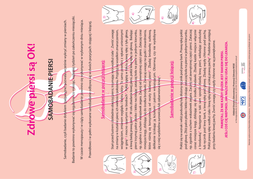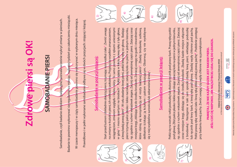 7) 5) 3) 1) Materiały wydane przez Wojewódzką Stację Sanitarno – Epidemiologiczną w Warszawie w ramach wojewódzkiego programu edukacyjengo profilaktyki raka piersi. Al. Jerozolimskie 32 00-024 Warszawa Mazowiecki Kurator Oświaty ul. Nowogrodzka 82, 02-018 Warszawa, tel. (22) 432 10 02, [email protected] Oddział Oświaty Zdrowotnej i Promocji Zdrowia WSSE PAMIĘTAJ, ŻE NIE KAŻDY GUZEK JEST RAKIEM PIERSI. JEŚLI COŚ CIĘ NIEPOKOI, JAK NAJSZYBCIEJ UDAJ SIĘ DO LEKARZA. Połóż się na wznak i włóż poduszkę lub złożony ręcznik pod prawy bark. Prawą rękę połóż pod głowę. Złóż palce płasko i lekko naciskając zataczaj koła na piersi w jednym kierunku, np. zgodnie z ruchem wskazówek zegara. Zacznij od zewnętrznej części piersi. Zataczaj coraz mniejsze kręgi, zbliżając się do środka brodawki. Zbadaj każde miejsce włącznie z brodawką7). Następnie w taki sam sposób zbadaj lewą pierś, wkładając poduszkę lub ręcznik pod lewy bark, a lewą rękę pod głowę. Zbadaj węzły chłonne pod pachą. Połóż prawą rękę wzdłuż ciała i lewą ręką lekko uciskaj prawą pachę8). Podobnie postępuj przy badaniu lewej pachy. Zwróć uwagę, czy węzły chłonne nie są powiększone. Samobadanie w pozycji leżącej: Stań przed lustrem i dokładnie obejrzyj piersi, trzymając ręce wzdłuż ciała1). Zwróć uwagę na zmiany w kształcie piersi, ich wielkości i położeniu. Przyjrzyj się wszelkim zmarszczeniom, wciągnięciom, zmianom wyglądu i koloru skóry. To samo powtórz z rękami uniesionymi w górę2) i mocno opartymi na biodrach3). Połóż zgiętą w łokciu prawą rękę z tyłu głowy, a lewą badaj prawą pierś4). W celu zbadania lewej piersi, połóż lewą rękę za głową. Badając piersi trzymaj palce płasko i lekko naciskając zataczaj koła na piersi w jednym kierunku, np. zgodnie z ruchem wskazówek zegara. Zacznij od zewnętrznej części piersi. Zataczaj coraz mniejsze kręgi, zbliżając się do środka brodawki. Zwracaj uwagę na guzki i stwardnienia, które różnią się konsystencją od reszty badanej piersi5). Zbadaj brodawkę sutkową, delikatnie ściskając ją kciukiem i palcem wskazującym. Obserwuj, czy nie wydobywa się z niej wydzielina surowicza lub zabarwiona krwią6). Samobadanie w pozycji stojącej: 8) Prawidłowo i w pełni wykonane samobadanie odbywa się w dwóch pozycjach: stojącej i leżącej. W czasie menopauzy i w ciąży samobadanie powinno się wykonywać w wybranym dniu miesiąca. 6) 2) Badanie to powinno wykonywać się regularnie co miesiąc, najlepiej tydzień po zakończeniu miesiączki. Samobadanie, czyli badanie dotykiem (palpacyjne) pozwala wcześnie wykryć zmiany w piersiach. SAMOBADANIE PIERSI Zdrowe piersi są OK! 4)