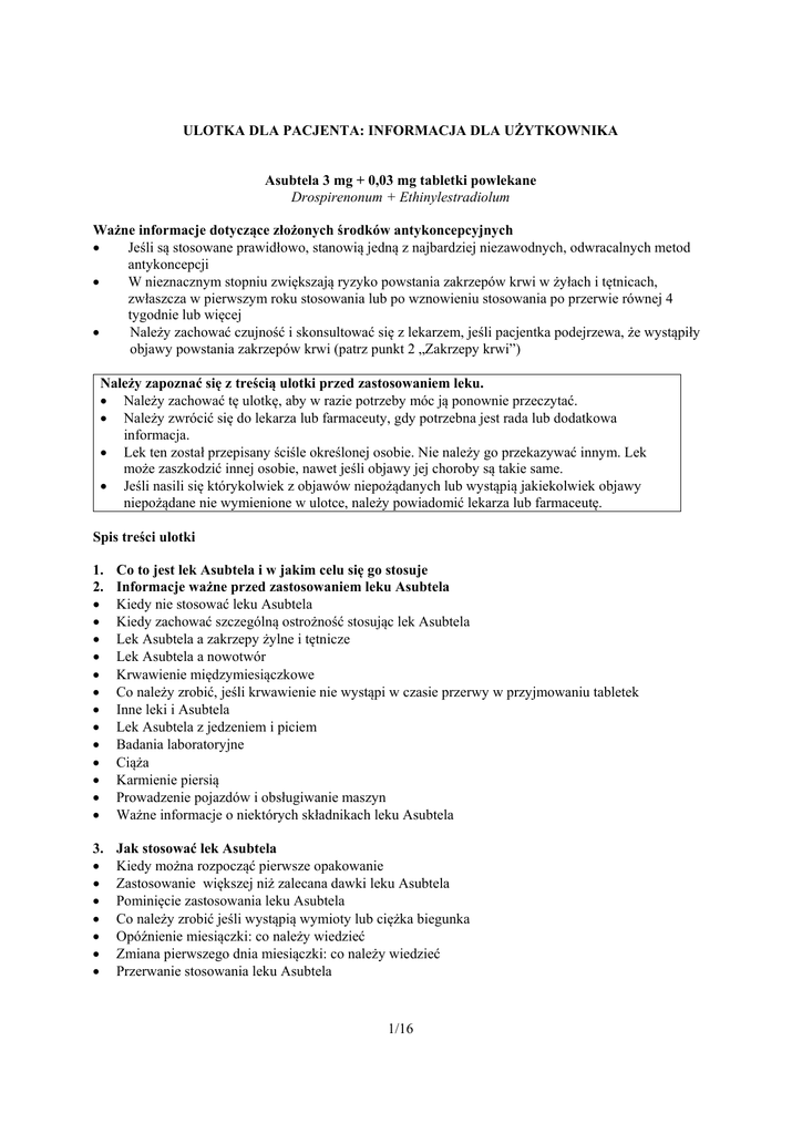ULOTKA DLA PACJENTA: INFORMACJA DLA UŻYTKOWNIKA Asubtela 3 mg + 0,03 mg tabletki powlekane Drospirenonum + Ethinylestradiolum Ważne informacje dotyczące złożonych środków antykoncepcyjnych Jeśli są stosowane prawidłowo, stanowią jedną z najbardziej niezawodnych, odwracalnych metod antykoncepcji W nieznacznym stopniu zwiększają ryzyko powstania zakrzepów krwi w żyłach i tętnicach, zwłaszcza w pierwszym roku stosowania lub po wznowieniu stosowania po przerwie równej 4 tygodnie lub więcej Należy zachować czujność i skonsultować się z lekarzem, jeśli pacjentka podejrzewa, że wystąpiły objawy powstania zakrzepów krwi (patrz punkt 2 „Zakrzepy krwi”) Należy zapoznać się z treścią ulotki przed zastosowaniem leku. Należy zachować tę ulotkę, aby w razie potrzeby móc ją ponownie przeczytać. Należy zwrócić się do lekarza lub farmaceuty, gdy potrzebna jest rada lub dodatkowa informacja. Lek ten został przepisany ściśle określonej osobie. Nie należy go przekazywać innym. Lek może zaszkodzić innej osobie, nawet jeśli objawy jej choroby są takie same. Jeśli nasili się którykolwiek z objawów niepożądanych lub wystąpią jakiekolwiek objawy niepożądane nie wymienione w ulotce, należy powiadomić lekarza lub farmaceutę. Spis treści ulotki 1. 2. Co to jest lek Asubtela i w jakim celu się go stosuje Informacje ważne przed zastosowaniem leku Asubtela Kiedy nie stosować leku Asubtela Kiedy zachować szczególną ostrożność stosując lek Asubtela Lek Asubtela a zakrzepy żylne i tętnicze Lek Asubtela a nowotwór Krwawienie międzymiesiączkowe Co należy zrobić, jeśli krwawienie nie wystąpi w czasie przerwy w przyjmowaniu tabletek Inne leki i Asubtela Lek Asubtela z jedzeniem i piciem Badania laboratoryjne Ciąża Karmienie piersią Prowadzenie pojazdów i obsługiwanie maszyn Ważne informacje o niektórych składnikach leku Asubtela 3. Jak stosować lek Asubtela Kiedy można rozpocząć pierwsze opakowanie Zastosowanie większej niż zalecana dawki leku Asubtela Pominięcie zastosowania leku Asubtela Co należy zrobić jeśli wystąpią wymioty lub ciężka biegunka Opóźnienie miesiączki: co należy wiedzieć Zmiana pierwszego dnia miesiączki: co należy wiedzieć Przerwanie stosowania leku Asubtela 1/16 4. 5. 6. 1. 1. Możliwe działania niepożądane Jak przechowywać lek Asubtela Inne informacje Co to jest lek Asubtela i w jakim celu się go stosuje Asubtela to tabletka antykoncepcyjna stosowana w celu zapobiegania ciąży. Każda tabletka zawiera niewielką ilość dwóch różnych hormonów żeńskich: drospirenon i etynyloestradiol. Tabletki antykoncepcyjne zawierające dwa hormony zwane są tabletkami „złożonymi”. 2. Informacje ważne przed zastosowaniem leku Asubtela Uwagi ogólne Przed rozpoczęciem przyjmowania leku Asubtela należy zapoznać się z informacjami dotyczącymi zakrzepów krwi w punkcie 2. Jest szczególnie ważne, aby zapoznać się z objawami wystąpienia zakrzepów krwi (patrz punkt 2 „Zakrzepy krwi”). Zanim będzie można rozpocząć stosowanie leku Asubtela, lekarz zada kilka pytań na temat zdrowia oraz zdrowia bliskich krewnych. Lekarz zmierzy również ciśnienie krwi i, w zależności od indywidualnego przypadku, może również wykonać pewne inne badania. W niniejszej ulotce informacyjnej opisano kilka sytuacji, w których należy przerwać stosowanie leku Asubtela lub w których skuteczność działania leku Asubtela może być zmniejszona. W takich sytuacjach nie należy odbywać stosunków płciowych lub stosować w tym czasie dodatkowe niehormonalne środki antykoncepcyjne, np. prezerwatywy lub inne metody barierowe. W tym czasie nie należy również stosować metody kalendarzowej lub metody termicznej. Metody te mogą być zawodne, ponieważ lek Asubtela modyfikuje miesięczne zmiany temperatury ciała oraz zmiany śluzu szyjkowego. Asubtela, podobnie jak inne hormonalne środki antykoncepcyjne, nie zabezpiecza przed wirusem HIV (AIDS) ani innymi chorobami przenoszonymi drogą płciową. Kiedy nie stosować leku Asubtela: Nie należy stosować leku Asubtela jeśli u pacjentki występuje jakikolwiek z wymienionych poniżej stanów. Jeśli u pacjentki występuje jakikolwiek z wymienionych poniżej stanów, należy poinformować o tym lekarza. Lekarz omówi z pacjentką, jaki inny środek zapobiegania ciąży będzie bardziej odpowiedni. jeśli u pacjentki występuje (lub kiedykolwiek w przeszłości występował) zakrzep krwi w naczyniach żylnych nóg (zakrzepica żył głębokich), w płucach (zatorowość płucna) lub w innych organach jeśli pacjentka wie, że ma zaburzenia wpływające na krzepliwość krwi - na przykład niedobór białka C, niedobór białka S, niedobór antytrombiny III, obecność czynnika V Leiden lub przeciwciał antyfosfolipidowych jeśli pacjentka wymaga zabiegu chirurgicznego lub nie będzie chodziła przez długi czas (patrz punkt „Zakrzepy krwi” jeśli u pacjentki występuje (lub kiedykolwiek w przeszłości wystąpił) zawał mięśnia sercowego lub udar mózgu 2/16 jeśli pacjentka choruje (lub chorowała w przeszłości) na dusznicę bolesną (choroba, która powoduje silny ból w klatce piersiowej i może być pierwszym objawem zawału serca) lub przemijający napad niedokrwienny (przemijające objawy udaru) jeśli pacjentka choruje na jakąkolwiek z poniższych chorób, które mogą zwiększyć ryzyko powstania zakrzepu w tętnicy: - ciężka cukrzyca z uszkodzeniem naczyń krwionośnych - bardzo wysokie ciśnienie krwi - bardzo wysokie stężenie tłuszczów we krwi (cholesterolu lub triglicerydów) - chorobę nazwaną hiperhomocysteinemią jeśli u pacjentki występuje (lub kiedykolwiek w przeszłości występowała) migrena (z tzw. ogniskowymi objawami neurologicznymi) jeśli u pacjentki występuje (lub występował w przeszłości) rodzaj migreny nazywany „migreną z aurą” jeśli u pacjentki występuje (lub kiedykolwiek w prz