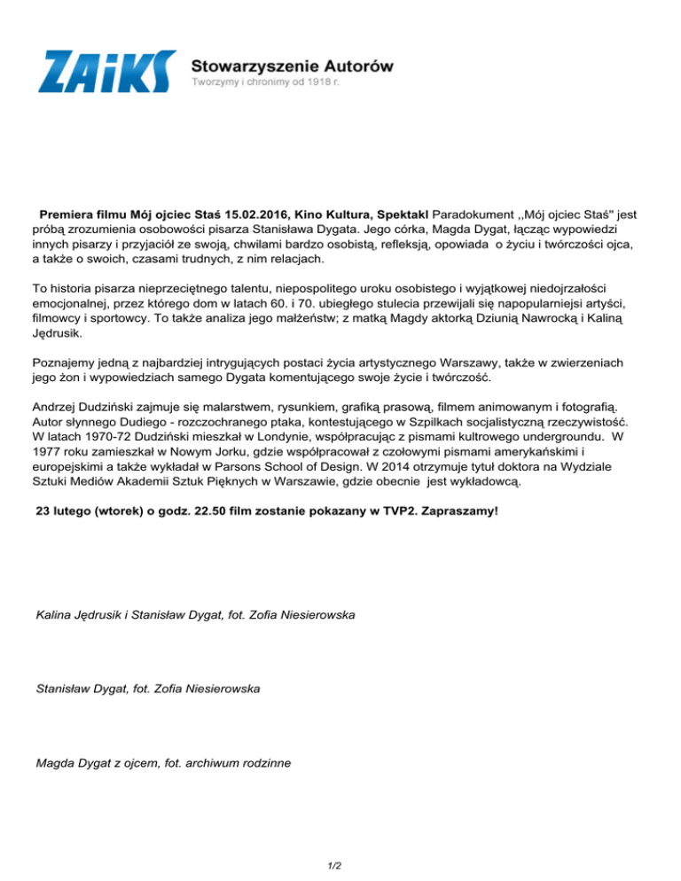 Premiera filmu Mój ojciec Staś 15.02.2016, Kino Kultura, Spektakl Paradokument ,,Mój ojciec Staś'' jest próbą zrozumienia osobowości pisarza Stanisława Dygata. Jego córka, Magda Dygat, łącząc wypowiedzi innych pisarzy i przyjaciół ze swoją, chwilami bardzo osobistą, refleksją, opowiada o życiu i twórczości ojca, a także o swoich, czasami trudnych, z nim relacjach. To historia pisarza nieprzeciętnego talentu, niepospolitego uroku osobistego i wyjątkowej niedojrzałości emocjonalnej, przez którego dom w latach 60. i 70. ubiegłego stulecia przewijali się napopularniejsi artyści, filmowcy i sportowcy. To także analiza jego małżeństw; z matką Magdy aktorką Dziunią Nawrocką i Kaliną Jędrusik. Poznajemy jedną z najbardziej intrygujących postaci życia artystycznego Warszawy, także w zwierzeniach jego żon i wypowiedziach samego Dygata komentującego swoje życie i twórczość. Andrzej Dudziński zajmuje się malarstwem, rysunkiem, grafiką prasową, filmem animowanym i fotografią. Autor słynnego Dudiego - rozczochranego ptaka, kontestującego w Szpilkach socjalistyczną rzeczywistość. W latach 1970-72 Dudziński mieszkał w Londynie, współpracując z pismami kultrowego undergroundu. W 1977 roku zamieszkał w Nowym Jorku, gdzie współpracował z czołowymi pismami amerykańskimi i europejskimi a także wykładał w Parsons School of Design. W 2014 otrzymuje tytuł doktora na Wydziale Sztuki Mediów Akademii Sztuk Pięknych w Warszawie, gdzie obecnie jest wykładowcą. 23 lutego (wtorek) o godz. 22.50 film zostanie pokazany w TVP2. Zapraszamy! Kalina Jędrusik i Stanisław Dygat, fot. Zofia Niesierowska Stanisław Dygat, fot. Zofia Niesierowska Magda Dygat z ojcem, fot. archiwum rodzinne 1/2 Z ojcem na ulicy, fot. archiwum rodzinne ? wróć do listy wydarzeń Wszelkie prawa zastrzeżone 2017 ZAiKS / data wygenerowania strony 07.03.2017 13:35:22 PDF ze strony: http://zaiks.org.pl/wydarzenia,422 2/2