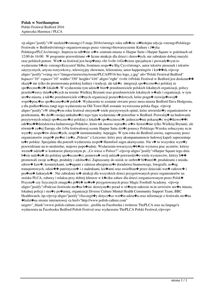Polak w Northampton Polski Festiwal Bedford 2016 Agnieszka Haremza / PLCA <p align="justify">W niedziel�<strong>15 maja 2016</strong> roku odb�zie si�kolejna edycja <strong>Polskiego Festiwalu w Bedford</strong> organizowanego przez <strong>Stowarzyszenie Kultury i J�yka Polskiego/PLCA</strong>. Impreza ta odb�zie si�w centrum miasta w Harpur Suite i Harpur Square w godzinach od 12:00 do 16:00. W programie przewidziane s� liczne atrakcje dla dzieci i doros�ych, nie zabraknie dobrej muzyki oraz polskich potraw. Wst� na festiwal jest bezp�atny.<br /><br />Go�ciem specjalnym i prowadz�cym to wydarzenie b�zie <strong>Krzysztof Skiba, frontmen zespo�u Big Cyc</strong>, autor tekstów piosenek i tekstów satyrycznych, artysta rozrywkowy, telewizyjny showmen, felietonista, autor happeningów i ksi��ek.</p><p align="justify"><img src="/images/stories/my/rozne/PLCA/PF16 bez logo_z.jpg" alt="Polski Festiwal Bedford" hspace="10" vspace="10" width="350" height="416" align="right" /><br />Polski Festiwal w Bedford jest doskona�� okazj� nie tylko do promowania polskiej kultury i tradycji, ale tak�e integracji spo�eczno�ci polskiej ze spo�eczno�ci� lokaln�. W wydarzeniu tym udzia� bior� przedstawiciele polskich lokalnych organizacji, polscy przedsi�iorcy dzia�aj�cych na terenie Wielkiej Brytanii oraz przedstawiciele lokalnych w�adz i organizacji, w tym urz�u miasta, a tak�e przedstawiciele ró�nych organizacji pozarz�dowych, które pragn� rozwija�swoj� wspó�prac�ze spo�eczno�ci� polsk�. Wydarzenie to zostanie otwarte przez mera miasta Bedford Dava Hodgsona, a dla podkre�lenia rangi tego wydarzenia na Old Town Hall zostanie wywieszona polska flaga. </p><p align="justify">W ubieg�ym roku festiwal otrzyma� wiele pozytywnych opinii, które utwierdzi�y organizatorów w przekonaniu, �e dzi�i swojej unikalno�ci tego typu wydarzenia s� potrzebne w Bedford. Pozwalaj� na budowanie pozytywnych relacji spo�eczno�ci polskiej z lokaln� spo�ecznosci�, jednocze�nie pokazuj�c wyj�tkowo��i odr�no��dziedzictwa kulturowego Polaków, które tak mocno wpisa�o si�w histori�nie tylko Wielkiej Brytanii, ale równie� ca�ej Europy.<br />Na festiwalowej scenie Harpur Suite dzi�i pomocy Polskiego Wzroku zobaczymy m.in wyst�y zespo�ów dzieci�ych, zespó� instrumentalny Arpeggio. W tym roku do Bedford zawita, zaproszony przez organizatorów zespó� pie�ni i ta�a „Polesie” z Leicester, który przy akompaniamencie ludowej kapeli zaprezentuje ta�e polskie. Specjalnie dla potrzeb wydarzenia zespó� Harmfool zagra akustycznie. Nie s� to wszystkie wyst�y przewidziane na to niedzielne, majowe popo�udnie. Wydarzeniu towarzyszy�b�zie wystawa prac uczniów, którzy wezm� udzia� w konkursie plastycznym pt. „Co wiesz o Polsce?”.</p><p align="justify">Harpur Square tego dnia b�zie nale�a� do polskiej spo�eczno�ci, poniewa� swój udzia� potwierdzi�o wielu wystawców, którzy b�� promowali swoje us�ugi, produkty i zdolno�ci. Zapraszamy do stoisk ze srebrn� bi�uteri�, produktami z miodu, zdrow� kaw�, kosmetykami, us�ugami z zakresu ubezpiecze�i doradztwa finansowego, fotografii, us�ug transportowych, odzie�� patriotyczn� i z nadrukami, ksi�arni oraz uwielbian� przez dzieciaki wat� cukrow� i pra�on� kukurydz�. Nie zabraknie te� atrakcji dla wszystkich dzieci przygotowanych przez organizatorów na stoisku PLCA, zabawy i relaksu przy dobrej lekturze w k�ciku zabaw dla dzieci zorganizowanym przez Polsk� Przysta� czy fizycznych zmaga�z pi�k� no�n� przygotowanych przez Magic Football Academy. </p><p align="justify">Podczas festiwalu mo�na b�zie skorzysta�z porad w ró�nym zakresie m.in serwisów urz�u miasta, lokalnej policji i stra�y po�arnej, organizacji Diverse Culture Mental Health Community Support Team, BBC Healthwatch, itp.</p><p align="justify">Szczegó�y dotycz�ce wzi�ia udzia�u oraz informacje o festiwalu mo�na �ledzi�na stronie internetowej <a href="http://www.polish-culture.com" target="_blank">www.polish-culture.com</a> , profilu na Facebooku i twitterze ThePLCA oraz na fanpage'u wydarzenia na Facebooku Bedford Polish Festival oraz wydarzeniu ThePLCA Polski Festiwal.</p><p> strona 1 / 1
