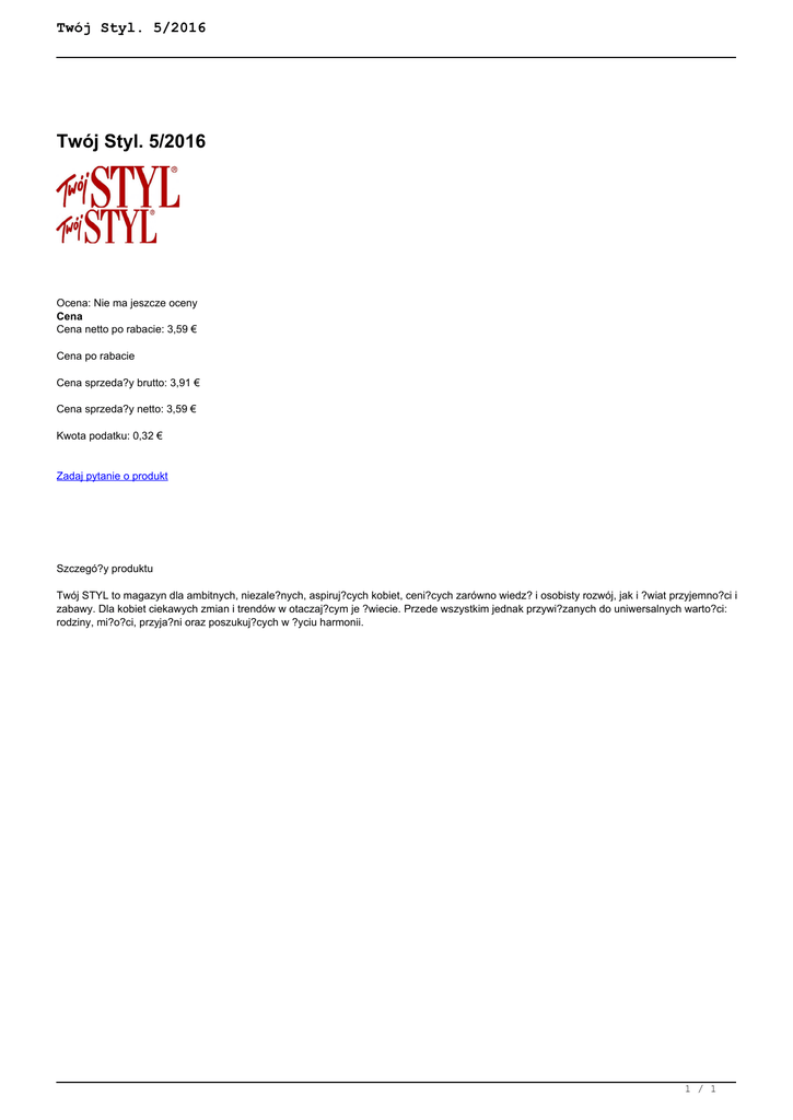 Twój Styl. 5/2016 Twój Styl. 5/2016 Ocena: Nie ma jeszcze oceny Cena Cena netto po rabacie: 3,59 € Cena po rabacie Cena sprzeda?y brutto: 3,91 € Cena sprzeda?y netto: 3,59 € Kwota podatku: 0,32 € Zadaj pytanie o produkt Szczegó?y produktu Twój STYL to magazyn dla ambitnych, niezale?nych, aspiruj?cych kobiet, ceni?cych zarówno wiedz? i osobisty rozwój, jak i ?wiat przyjemno?ci i zabawy. Dla kobiet ciekawych zmian i trendów w otaczaj?cym je ?wiecie. Przede wszystkim jednak przywi?zanych do uniwersalnych warto?ci: rodziny, mi?o?ci, przyja?ni oraz poszukuj?cych w ?yciu harmonii. 1 / 1 Powered by TCPDF (www.tcpdf.org)