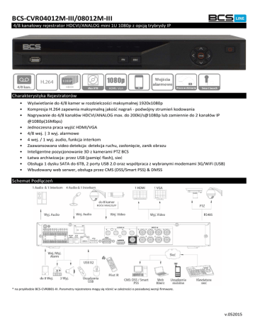 BCS-CVR04012M-III/08012M-III 4/8 ka ałow rejestrator HDCVI/ANALOG mini 1U 1080p z op ją trybrydy IP Charakter st ka Rejestratorów • • • • • • • • • • • Wyświetlanie do 4/8 ka er w rozdziel zości maksymalnej 1920x1080p Kompresja H. zapew ia aks al ą jakość agrań - podwój stru ień kodowa ia Nagrywanie do 4/8 ka ałów HDCVI/ANALOG max. do 200kl/s@1080p lub zamiennie do ka ałów IP @1080p(16Mbps) Jed o zes a pra a w jść HDMI/VGA 4/8 wej. | 3 wyj. alarmowe 4 wej. / 1 wyj. audio, funkcja interkom Zaawansowana video detekcja: detekcja ruchu, zasło ięcie, zanik obrazu Inteligentne pozycjonowanie 3D z kamerami PTZ BCS Łatwa ar hiwiza ja: przez USB pa ięć flash , sieć O sługa 1 dysku SATA do 6TB, 2 porty USB 2.0 oraz współpra a z w ra i ode a i G/WiFi (USB) Wbudowany web serwer, o sługa przez CMS (DSS/Smart PSS) & DMSS S he at Podłą zeń * a prz kładzie BCS-CVR0801-III. Para etr rejestratora ogą się róż ić w zależ oś i o posiada ej wersji fir ware. v.052015 BCS-CVR04012M-III/08012M-III Specyfikacja techniczna BCS-CVR04012M-III/08012M-III z op ją tr r d IP System Procesor Wbudowany wysoko wydajny procesor System operacyjny LINUX Fu k jo al ość s ste u Fu k ja Pe taple : O raz a ż wo, Nagr wa ie, Odtwarza ie, Ar hiwiza ja i )dal Kontrola systemu Pa el, M sz, Pilot, Klawiatura, Sieć dostęp Wideo / W świetla ie Standard Wideo PAL(625Linii) Ilość wejść wideo 4/8 ka ałów W jś ia 1 HDMI, 1 VGA o itorowe Rozdziel zoś i w świetla ia 1920× Podział a w jś ia h 1/4/8/9 w zależ oś i od wersji ka ałowej Sekwencja obrazu Tak Maski pr wat oś i OSD , × , × , × defi iowal e stref pr wat oś i a ka ał Nazwa ka er , Czas, )a ik s g ału, Blokada ka er , Detek ja ru hu, Nagrywanie Audio Wejś ie W jś ie Dwukierunkowa komunikacja 4 ka ały, BNC(200ka ał, BNC V KΩ V, KΩ - Poprzez wejś ie audio a ka ale Nagrywanie Kompresja Video/Audio H.264 / G.711 Rozdziel zość agr wa ia Głów Stru ień: HDCVI – 1080p/720p(1~25 kl/s), ANALOG –c960H/D1/2CIF/CIF(1~25 kl/s), IP – 2kan.@1080p(16Mbps) E tra Stru ień: CIF/QCIF(1~25 kl/s) )ajętość pas a 48~8192Kb/s a ka ał Tryb nagrywania Ma ual , Ter i arz Ciągłe; MD - Detekcja video, w tym : detekcja ruchu, zakr ie ka er , za ik s g ału), Stop Priorytet nagrywania Manualne >Detek ja ru hu>Ciągłe I terwał agrań ~ i . do śl ie: i . , Pre-nagrywanie: 1~30 sek., Post-nagrywanie: 10~300 sek. Wideo detekcja i Alarm Wyzwalanie zdarzeń Nagrywanie, PTZ, Trasa, E-mail, FTP, Buzzer i komunikat na ekranie Detekcja ruchu Stref : )a ik s g ału, zakr ie ka er tak Wejś ia/W jś ia alar owe 4/8 | 3 w jś ia alarmowe* w zależ oś i od wersji ka ałowej , Czułość: ~ pozio ów Odtwarzanie i Archiwizacja Odtwarza ie agrań 1/4/9* w zależ oś i od wersji ka ałowej Tryb wyszukiwania Czas/Data, Detekcja Ruchu i Zaawansowane wyszukiwanie (co do sekundy) Funkcje odtwarzania Pla , Pauza, Stop, Do T łu, Sz ki pla , Wol pla , Następ plik, Poprzed i plik, Następ a ka era, Poprzed ia ka era, Peł ekra , Powtórze ie, Pętla, Ar hiwiza ja, C frowe powiększe ie Archiwizacja danych Pendrive / USB HDD / USB CD / Sieć Sieć Interfejs Port RJ-45 (10/100M) O sługiwa e protokoł HTTP, TCP/IP, IPv4/IPv6, UPNP, RTSP, UDP, SMTP, NTP, DHCP, DNS, IP Filter, PPPOE, DDNS, FTP Zdalne sterowanie Mo itor, PT) , Odtwarza ie, Ustawie ia, Ś iąga ie plików, Przegląda ie logów Dysk Dysk Twardy 1 port SATA, Max 6TB HDD Zarzadzanie dysku Monitorowanie dysku Dodatkowe interfejsy USB 2 porty, 1 do myszy, 1 do archiwizacji RS485 PTZ Pozostałe Zasilanie DC 12V / 2A zasilacz w komplecie Po ór prądu 10W bez HDD Warunki środowiskowe -10°C ~+ Wymiary Waga °C / i i U, ~ %RH / × × ~ kpa W×D×H 1.5kg bez HDD v.052015