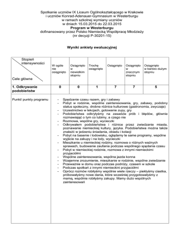 Spotkanie uczniów IX Liceum Ogólnokształcącego w Krakowie i uczniów Konrad-Adenauer-Gymnasium w Westerburgu w ramach szkolnej wymiany uczniów w dniach 15.03.2015 do 22.03.2015 Program w Westerburgu dofinansowany przez Polsko Niemiecką Współpracę Młodzieży (nr decyzji P-30201-15) Wyniki ankiety ewaluacyjnej Stopień intensywności W ogóle nie osiągnięto Osiągnięto w niewielkim stopniu Trochę osiągnięto Osiągnięto Osiągnięto w znacznym stopniu Osiągnięto w bardzo dużym stopniu 7 7 5 Cele główne 1. Odkrywanie podobieństw Punkt/ punkty programu 0 - - 0 1 Spędzanie czasu razem, gry i zabawy Pobyt w rodzinie, wspólne zainteresowania, gry, zabawy, podobny status społeczny, drobne różnice kulturowe (gastronomia, zwyczaje) Uczestnictwo w lekcjach, gotowanie zupy, gry Podobieństwa odkryłyśmy na zasadzie prób i błędów, głównie rozmawiająć o tym co lubimy, a czego nie Rozmowa, wspólne gry, wycieczki Odkrywałem podobieństwa i różnice przez zwiedzanie miasta, poznawanie niemieckiej kultury, języka. Podobieństwa można także znaleźć w jedzeniu śniadania, obiadu i kolacji Pobyt na basenie i lodowisku, oglądamy te same programy, wspólne wyjście na zakupy i na lody, wycieczki Mieszkanie u niemieckiej rodziny, rozmowa o różnych ważnych sprawach, budowanie zaufania podczas wspólnego spędania czasu Pobyt w niemieckiej rodzinie, rozmowa z innymi niemieckimi przyjaciółmi Wspólne zainteresowania, wspólna jazda konna Wzajemne zrozumienie, mieszkanie w rodzinie, wspólne zwiedzanie Przeważnie w domu oraz podczas podróży, czasem w szkole Podczas spotkań z innymi niemieckini przyjaciółmi Oprócz rozmów robiłyśmy wspólnie wiele rzeczy – piekłyśmy ciastka, próbowałyśmy nowe dania, które wcześniej przygotowałyśmy z mamą, wspólnie robiłyśmy zakupy. Mamy dużo wspólnych zainteresowań 2. Wzajemne budowanie zaufania Punkt/ punkty programu 0 - 1 - - - - 0 5 7 8 Gra w różne gry Głównie szczere rozmowy, akceptacja, bliski kontakt w trakcie zabaw i gier, wspólne zainteresowania, osiąganie kompromisów, taki sam plan na przyszłość, przyjazna rodzina partnerki Program w twierdzy w Koblencji, zwiedzanie muzeum w Bonn, jazda na łyżwach Rozmawiałyśmy szczerze, pomagałyśmy sobie w kłopotliwych sytuacjah, co wymagało zaufania Rozmowy, spacery Rozmowy o wspólnych problemach, gry zespołowe Wszystkie punkty programu oraz czas spędzony z rodziną niemiecką Dużo rozmawiałyśmy ze sobą, wzajemnie sobie pomagałyśmy, wszędzie chodziłyśmy razem Wspólne rozmowy, rozwiązywanie problemów, wspólne spędzanie czasu Wspólne rozmowy, przemyślenia, problemy W domu oraz podczas wieczornych wyjść do restauracji Szczere rozmowy z partnerem Wspólne odkrywanie nowych rzeczy Rozmowy na poważne tematy, wzajemna pomoc, wspólna nauka jazdy na łyżwach - - 3. Wspólne omawianie i rozwiązywanie problemów Punkt/ punkty programu 0 0 2 8 2 7 Ustalanie co będziemy robić Szybkie dojście do porozumienia, dobra organizacja pracy, zwiedzania, podobne poglądy, wspólnie rozwiązywałyśmy dany problem Brak problemów, w przypadku niedomówień zwykła rozmowa Nie miałyśmy problemów, pobyt był bardzo przyjemny. W przypadku niedomówień lub gdy się nie rozumiałyśmy, dyskutowałyśmy o tym Rozmowy Nie było żadnego problemu, więc nie było czego rozwiązywać Rozmowa, lodowisko Częste rozmowy o tym co się stało lub jak się czuje, wspólne zainteresowanie problemami Wspólne rozmowy i spędzanie czasu, zainteresowanie problemami Zainteresowanie obu stron planami na następny dzień Ustalanie planów na popołudnie Każdy z nas miał jakiś problem, wspólnie rozwiązywaliśmy go podczas rozmów Wyjścia wieczorne Brak tolerancji ze strony niektórych Niemców Bariera językowa Wspólnie rozwiązywaliśmy konflikty, szukając najlepszego wyjścia z sytuacji, szybkie dojście do kompromisu, podobne zdanie w wielu sytuacjach Wyjaśnianie wszelkich niejasności Brak kłopotów i problemów, w przypadku nieporozumień rozmowa! 4. Wspólne plany na przyszłość Punkt/ punkty programu 1 - Punkt/ punkty programu 0 - 2 3 6 5 Rozmawianie o tym co będziemy robić Rozmowy na temat psychologii, wspólny plan dotyczący kierunku studiów Rozmowa, czatowanie, planowanie wspólnych zajęć w czerwcu Bedziemy utrzymywać kontakt, korespondować. Zaplanowałyśmy wstępnie, jak będzie wyglądał pobyt Fabienne w Krakowie Będziemy pisać do siebie Mamy plany dotyczące pobytu w Krakowie, np. zwiedzanie miasta na rowerach, wycieczki po mieście Program w Polsce Gdy skończymy 18 lat naszym marzeniem jest wycieczka na mecz FC Bayern Muenchen oraz zwiedzenie stadionu Planowanie spotkania w czerwcu Każdy z nas ma różne zainteresowania i chcemy robić co innego Wycieczki Brak Zamierzamy kontynuować znajomość, komunikować się przed kolejnym spotkaniem Rozmowa, wspólne plany, maile i inna korespondencja - 5. Wzajemne uczenie się tolerancji 3 0 0 4 5 11 Cały czas Bez problemu akceptowałyśmy różnice kulturowe, starałysmy się znaleźć wyjście z sytuacji w przypadku różnic Rozmowa z partnerami, pobyt w rodzinach, gry planszowe, poznawanie obyczajów Rozmawiałyśmy dużo o stereotypach, o tym co Polacy sądzą o Niemcach i na odwrót Rozmowy Mówienie: dzień dobry, smacznego, itd. Za każdym razem! Wspólne lekcje, wyjścia Myślę, że nauczyłam się być bardziej kulturalną i tolerancyjną osobą Rozmowa o zwyczajach, zainteresowanie inną kulturą Wspólne rozmowy oraz spędzanie czasu wolnego Pobyt w rodzinie, wieczorne wyjścia Rozmowy z rodzicami, przebywanie w innym środowisku Poznawanie kultury, wycieczki, rozmowy, wspólne wypady z przyjaciółmi Dużo rozmawiayśmy o kulturze naszych krajów i cechach wspólnych oraz o naszym podejściu do niektórych spraw Pytania, co jest dla mnie i dla innych nowe, rozmowy o obyczajach Gdy miałyśmy problem, zawsze potrafiłyśmy znaleźć wyjście, brak nieporozumień Opr