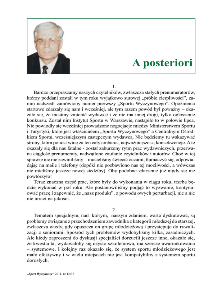A posteriori 1 A posteriori 1. Bardzo przepraszamy naszych czytelników, zwłaszcza stałych prenumeratorów, którzy poddani zostali w tym roku wyjątkowo surowej „próbie cierpliwości”, zanim nadszedł zamówiony numer pierwszy „Sportu Wyczynowego”. Opóźnienia startowe zdarzały się nam i wcześniej, ale tym razem powód był poważny – okazało się, że musimy zmienić wydawcę i że nie ma innej drogi, tylko ogłoszenie konkursu. Został nim Instytut Sportu w Warszawie, nastąpiło to w połowie lipca. Nie powiodły się wcześniej prowadzone negocjacje między Ministerstwem Sportu i Turystyki, które jest właścicielem „Sportu Wyczynowego” a Centralnym Ośrodkiem Sportu, wcześniejszym zastępczym wydawcą. Nie będziemy tu wskazywać strony, która ponosi winę za ten cały ambaras, najważniejsze są konsekwencje. A te okazały się dla nas fatalne - został zaburzony rytm prac wydawniczych, przerwana ciągłość prenumeraty, nadwątlone zaufanie czytelników i autorów. Choć w tej sprawie nic nie zawiniliśmy – musieliśmy świecić oczami, tłumaczyć się, odpowiadając na maile i telefony (dopóki nie pozbawiono nas tej możliwości, a wówczas nie mieliśmy jeszcze nowej siedziby). Oby podobne zdarzenie już nigdy się nie powtórzyło! Teraz znaczną część prac, które były do wykonania w ciągu roku, trzeba będzie wykonać w pół roku. Ale postanowiliśmy podjąć to wyzwanie, kontynuować pracę i zapewnić, że „nasz produkt”, z powodu owych perturbacji, nic a nic nie utraci na jakości. 2. Tematem specjalnym, nad którym, naszym zdaniem, warto dyskutować, są problemy związane z przechodzeniem zawodnika z kategorii młodszej do starszej, zwłaszcza wtedy, gdy opuszcza on grupę młodzieżową i przystępuje do rywalizacji z seniorami. Spośród tych problemów wydobyliśmy kilka, zasadniczych. Ale kiedy zaproszeni do dyskusji specjaliści dorzucili jeszcze inne, okazało się, że kwestia ta, wydawałoby się czysto szkoleniowa, ma szersze uwarunkowania – systemowe. I kolejny raz okazało się, że system sportu młodzieżowego jest mało efektywny i w wielu miejscach nie jest kompatybilny z systemem sportu dorosłych. „Sport Wyczynowy” 2011, nr 1/537 2 A posteriori 3. Ostrze krytyki dyskutantów kieruje się w pierwszym rzędzie na system współzawodnictwa. Wszyscy zgodnie podkreślają, że zdobywanie medali i miejsc punktowanych na zawodach centralnych przez młodych zawodników, związane z gratyfikacjami finansowymi dla klubów czy trenerów, przeszkadza w prawidłowym prowadzeniu procesu szkolenia. Sytuacja przypomina błędne koło, klubom brakuje środków, więc te młodzieżowe punkty, zdobyte we współzawodnictwie oficjalnym, pośrednio, stanowią źródło zasilania finansowego i często są podstawą egzystencji klubu. Czy można się dziwić, że wiele osób (trenerzy, działacze) myśli głównie o bieżących efektach szkolenia, nie o perspektywie. Wydusić z młodzika czy juniora ile się da, a co będzie z nim za kilka lat zobaczy się. 4. Przebiec maraton, precyzyjniej mówiąc: ukończyć bieg maratoński, nieważne w jakim czasie, to do niedawna dla wysportowanego, ale nie zawodowego biegacza, mniej więcej to samo, co dla alpinisty zdobyć szczyt Monte Everestu. Dziś okazuje się, że zdolne są do tego wyczynu dziesiątki, a nawet setki tysięcy zwykłych biegaczy. Pytanie: co jest przyczyną, że biegi maratońskie stały się tak szeroko dostępne dla mas, niemal na całym świecie? Musi istnieć jakaś siła, która zmusza ludzi do długotrwałego, męczącego treningu, a jeszcze dodatkowo do specjalnego przygotowania startowego w maratonie. To nie jest trudny, wyczerpujący bieg; to jest ekstremalna próba – dla ciała i psychiki. W ciągu kilku godzin, jakich wymaga pokonanie trasy, która miewa różne, łatwiejsze i trudniejsze konfiguracje, dochodzą czynniki zewnętrzne – zimno, deszcz, wiatr lub gorąco, wysoka wilgotność powietrza – wychodzą na wierzch wszystkie słabości organizmu i psychiki. Czasu wystarcza, by przypomnieć i zanalizować wiele wydarzeń ze swego życia.. A maratony biega coraz więcej ludzi, powtórzmy pytanie: – dlaczego i po co? Pomińmy tych, którzy traktują bieganie jak zawód; trenują, by startować, wygrywać i zdobywać nagrody. Wśród przeważającej reszty biegaczy przeważa motyw wewnętrzny – ambicjonalny, potrzeba sprawdzenia się oraz jako finalny xl „biegam dla zdrowia”. W większości cywilizowanych społeczeństw zdrowie urosło do rangi najważniejszych wartości. Zrozumiano, iż nie jest ono – lepsze czy gorsze, jak komu przypadnie – dane raz na zawsze, ale, że pragnąc je zachować w jak najlepszym stanie, trzeba o nie dbać. Najprostszym sposobem owej dbałości jest – zdrowe odżywianie oraz aktywność fizyczna. Tej, z kolei, najprostszą, najbardziej naturalną formą jest bieg. 5. Tomasz Sahaj przytacza opinię francuskiego socjologa Michela Maffesoliego, który używał pojęcia „plemiona” na określenie barbarzyńców naszych czasów prowadzących prymitywny i stadny tryb życia, w którym siła fizyczna jest środkiem w rozwiązywaniu problemów społecznych. Aktywność pseudokibiców futbolowych, manifestowana przez „Sport Wyczynowy” 2011, nr 1/537 A posteriori 3 nich siła, hierarchia ważności i sposób organizacji oraz poczucie bezkarności, są efektem uwiądu mechanizmów społecznych, które mogłyby ich działania skutecznie powstrzymać. To jasne, rzecz w tym jak te mechanizmy na powrót uruchomić, czy restrykcje i surowe prawo wystarczą. 6. Felietonista ma prawo do przesady. To jest prawo tego gatunku. Bywa jednak, że bzdura, którą dostrzega tak go irytuje, że nie bawi się w zawoalowane ironie, tylko wali prosto po oczach. Jak Barbarzyńca w tym felietonie, kiedy atakuje wprost bezsensowne miernictwo naukowe nie oparte na żadnej idei, które ma uchodzić za badania naukowe. Niestety, pisze, 