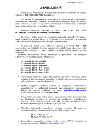 Rzeszów 2009-05-11 ZAPROSZENIE Podkarpacki Wojewódzki Związek Piłki Siatkowej zaprasza do wzięcia udziału w XX Festiwalu Piłki Siatkowej. Już po raz XX proponujemy wszystkim sympatykom piłki siatkowej – zawodnikom, trenerom, uczniom, nauczycielom aktywny udział w święcie piłki siatkowej, jakim jest sportowa rywalizacja z rówieśnikami z różnych środowisk południowo – wschodniej Polski. Festiwal rozegrany zostanie w dniach w Leżajsku – chłopcy, w Krośnie – dziewczęta. 30 - 31. 05. 2009 Również w roku bieżącym pragniemy zaprosić naszych Przyjaciół z boisk województw sąsiadujących z Podkarpaciem tj. drużyny z województw małopolskiego i lubelskiego oraz z innych rejonów kraju. W ostatnich latach brało udział w każdym z Festiwali 700 – 800 uczestników, zawodników klubów sportowych, szkół, które stanowią o sile podkarpackiej siatkówki – mamy nadzieję na liczny udział również w roku bieżącym. Drużyny rywalizować będą zespołami z podziałem na chłopców i dziewczęta w następujących kategoriach: 1. 2. 3. 4. 5. 6. rocznik rocznik rocznik rocznik rocznik rocznik 1998 1997 1996 1995 1993 1991 – – – – – – dwójki trójki czwórki 94 – trójki 92 – trójki 90 – trójki Organizator zapewnia wspaniałe nagrody (puchary, dyplomy, sprzęt sportowy) dla najlepszych zespołów w każdej kategorii wiekowej oraz pokrywa koszty organizacji turnieju. System rozgrywek zostanie podany po otrzymaniu potwierdzenia uczestnictwa w konkretnej kategorii (na załączonym zgłoszeniu). Zgłoszenia prosimy nadsyłać na adres [email protected] w nieprzekraczalnym terminie do 23.05. Organizator zastrzega sobie prawo ograniczenia ilości dopuszczonych do Festiwalu zespołów ze względu na możliwości organizacyjne turnieju. Ilość dopuszczonych zespołów podamy po zgłoszeniach. Każda kategoria rozgrywa zawody w jednym dniu. Wszelkie informacje dodatkowe, pytania prosimy kierować odpowiedzialnego za organizację turnieju kol. Artura Łozy. do 017/851-65-04 kom. 604/63-12-40 Komunikaty szczegółowe podane będą w dniu 27.05 wyłącznie na stronie internetowej PWZPS - www.pwzps.p9.pl ZGŁOSZENIE DRUŻYNY ................................................................. DO XX FESTIWALU PIŁKI SIATKOWEJ 30-31. 05. 2009 KATEGORIA DZIEWCZĘTA CHŁOPCY 1998 1997 1996 1995 – 94 1993 – 92 1991 – 90 Prosimy podać tylko ilość zespołów zgłaszanych oraz przesłać zgłoszenie do 23.05.2009 !!! Adres i telefon kontaktowy: ................................................................ ................................................................ ................................................................ Podpis osoby zgłaszającej KOMUNIKAT ORGANIZACYJNY XX FESTIWALU PIŁKI SIATKOWEJ 30-31.05. 2009 I. Planowane miejsca rozgrywania zawodów : 1. Hala sportowa Zespołu Szkół w Leżajsku i SP – 3 w Leżajsku – chłopcy 2. Obiekty MOSiR-u w Krośnie – dziewczęta II. Godziny rozpoczęcia oraz miejsce gier podamy w komunikatach szczegółowych dotyczących każdej kategorii wiekowej po uzyskaniu zgłoszeń. Komunikaty szczegółowe podane będą w dniu 27.05 wyłącznie na stronie internetowej PWZPS - www.pwzps.p9.pl . III. Wszystkie mecze rozgrywane będą na czas – 10 minut gry. Możliwe są inne sposoby rozgrywania turnieju, w zależności od liczby zgłoszonych drużyn. IV. W trakcie gry dopuszczalne są dwie zmiany, nie ma zmiany boisk oraz przerw dla odpoczynku. V. Grę rozpoczyna i kończy sygnał gwizdkiem sędziego głównego, trwająca akcja po gwizdku jest dogrywana do końca. VI. W przypadku remisu dogrywana jest jedna akcja do zdobycia punktu dla któregoś z zespołów. VII. Prosimy drużyny startujące kilkoma zespołami w danej kategorii wiekowej o wcześniejsze przydzielenie numerów swoim zespołom wg rzeczywistych umiejętności ze względu na rozstawienie najlepszych zespołów poszczególnych drużyn w różnych grupach oraz poinformowanie zawodników o tym , w którym zespole (z jakim numerem) grają. Ułatwi to dotarcie organizatorom z informacją do zawodników podczas zawodów. VIII. Organizator zapewnia piłki do gry, natomiast uczestnicy proszeni są o zabranie piłek do rozgrzewki . IX. Wymiary boisk i wysokość siatki na których odbędą się mecze : - Kat. 98 4,00 x 4,50 m - 200 - Kat. 97 4,50 x 7,00 m - 210 - Kat. 96 7,00 x 7,00 m - 215 / 224 - Kat. 95 – 94 4,50 x 9,00 m - 215 / 235 - Kat. 93 – 92 4,50 x 9,00 m - 224 / 243 - Kat. 91 – 90 4,50 x 9,00 m - 224 / 243 X. Na uczestnikach spoczywa obowiązek posiadania badań lekarskich dopuszczających do udziału w zawodach sportowych. XI. Zakończenia turnieju połączone z rozdaniem nagród będą miały miejsce po zakończeniu zawodów każdej grupy wiekowej. XII. Wszystkich uczestników prosimy o potwierdzenie udziału 30 minut przed planowanym rozpoczęciem gier. ORGANIZATORZY