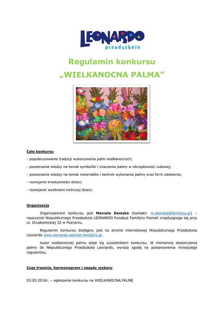 Regulamin konkursu „WIELKANOCNA PALMA” Cele konkursu - popularyzowanie tradycji wykonywania palm wielkanocnych; - poszerzanie wiedzy na temat symboliki i znaczenia palmy w obrzędowości ludowej; - poszerzenie wiedzy na temat materiałów i technik wykonania palmy oraz form zdobienia; - rozwijanie kreatywności dzieci; - rozwijanie wyobraźni twórczej dzieci; Organizacja Organizatorem konkursu jest Marcela Demska (kontakt: [email protected]) – nauczyciel Niepublicznego Przedszkola LEONARDO Fundacji Familijny Poznań znajdującego się przy ul. Druskienickiej 32 w Poznaniu. Regulamin konkursu dostępny jest na stronie internetowej Niepublicznego Przedszkola Leonardo www.leonardo-poznan.familijny.pl. Autor wielkanocnej palmy staje się uczestnikiem konkursu. W momencie dostarczenia palmy do Niepublicznego Przedszkola Leonardo, wyraża zgodę na postanowienia niniejszego regulaminu. Czas trwania, harmonogram i zasady wyboru 03.03.2016r. – ogłoszenie konkursu na WIELKANOCNĄ PALMĘ 07.03.2016r. – 15.03.2016r. przyjmowanie powstałych WIELKANOCNYCH PALM w Niepublicznym Przedszkolu Leonardo w Poznaniu, przy ulicy Druskienickiej 32. 16.03.2016r. – głosowanie Jury, które wybierze zwycięzców - trzy najlepsze palmy zajmą odpowiednio I, II i III miejsce. 17.03.2016r. – ogłoszenie wyników oraz wręczenie nagród. Zdjęcia palm zostaną opublikowane na stronie internetowej Niepublicznego Przedszkola Leonardo Fundacji Familijny Poznań www.leonardo-poznan.familijny.pl oraz na profilu facebookowym Niepublicznego Przedszkola Leonardo. Uczestnictwo Udział w konkursie może wziąć każde dziecko uczęszczające do przedszkoli Fundacji Familijny Poznań – Oddział Wielkopolski. Zasady konkursu Warunkiem uczestnictwa w konkursie jest przekazanie przez uczestnika, lub inną wyznaczoną przez niego osobę, do Niepublicznego Przedszkola Leonardo Wielkanocnej Palmy. Palma powinna być wykonana w formie 3D, przy wykorzystaniu materiałów i tworzyw naturalnych, oraz tradycyjnych form zdobniczych. Rozmiar palmy - dowolny. Do palmy należy dołączyć opis i informację o autorze (imię i nazwisko, wiek, nazwa przedszkola). Podczas trwania konkursu (od 7 do 15 marca 2016r.) wielkanocne palmy będą znajdowały się na specjalnej wystawie zorganizowanej w Niepublicznym Przedszkolu Leonardo Fundacji Familijny Poznań. Uczestnicy konkursu, którzy dostarczą swoją palmę na wystawę w Niepublicznym Przedszkolu Leonardo, wyrażają zgodę na publikację nadesłanych danych oraz zdjęć palm na stronie internetowej Niepublicznego Przedszkola Leonardo www.leonardopoznan.familijny.pl oraz na profilu facebookowym Przedszkola. Wystawa wykonanych wielkanocnych palm w Niepublicznym Przedszkolu Leonardo będzie trwała od 7 do 15 marca 2016r. Wszystkie palmy należy odebrać z Niepublicznego Przedszkola Leonardo Fundacji Familijny Poznań od 17 do 22 marca w godzinach 6’30 – 16’30. Po tym terminie, nieodebrane palmy przejdą na własność Przedszkola. Nagrody Nagrodzeni zostaną zwycięzcy I, II i III miejsca, wskazani przez Jury. Odbiór nagród Niepubliczne Przedszkole LEONRADO w Poznaniu bierze odpowiedzialność za przekazanie nagród zwycięzcom. Zapraszamy do udziału!