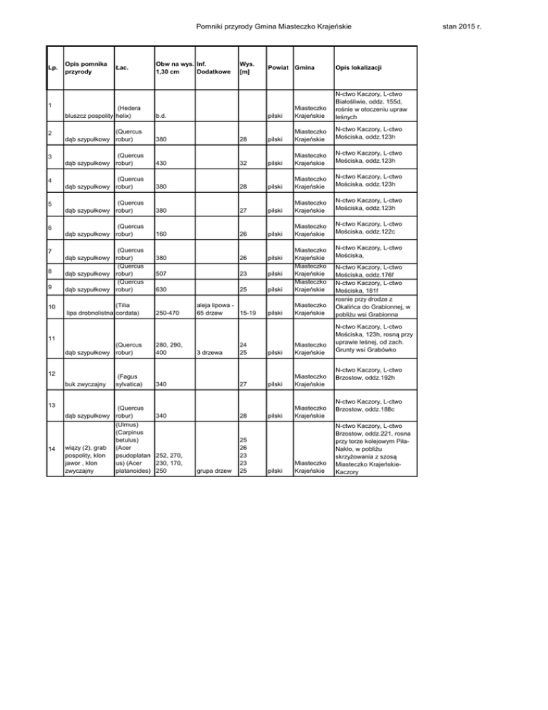 Pomniki przyrody Gmina Miasteczko Krajeńskie stan 2015 r.