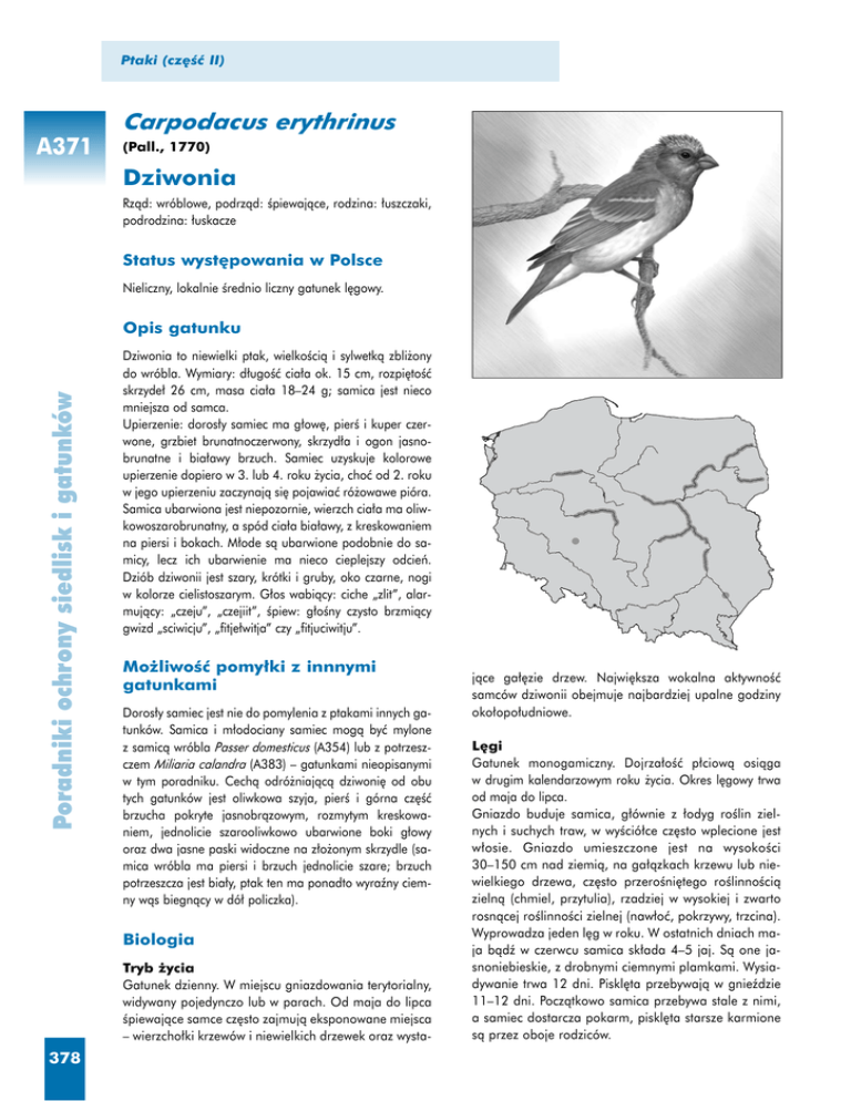 Ptaki (cz´Êç II) Carpodacus erythrinus A371 (Pall., 1770) Dziwonia Rzàd: wróblowe, podrzàd: Êpiewajàce, rodzina: ∏uszczaki, podrodzina: ∏uskacze Status wyst´powania w Polsce Nieliczny, lokalnie Êrednio liczny gatunek l´gowy. Poradniki ochrony siedlisk i gatunków Opis gatunku Dziwonia to niewielki ptak, wielkoÊcià i sylwetkà zbli˝ony do wróbla. Wymiary: d∏ugoÊç cia∏a ok. 15 cm, rozpi´toÊç skrzyde∏ 26 cm, masa cia∏a 18–24 g; samica jest nieco mniejsza od samca. Upierzenie: doros∏y samiec ma g∏ow´, pierÊ i kuper czerwone, grzbiet brunatnoczerwony, skrzyd∏a i ogon jasnobrunatne i bia∏awy brzuch. Samiec uzyskuje kolorowe upierzenie dopiero w 3. lub 4. roku ˝ycia, choç od 2. roku w jego upierzeniu zaczynajà si´ pojawiaç ró˝owawe pióra. Samica ubarwiona jest niepozornie, wierzch cia∏a ma oliwkowoszarobrunatny, a spód cia∏a bia∏awy, z kreskowaniem na piersi i bokach. M∏ode sà ubarwione podobnie do samicy, lecz ich ubarwienie ma nieco cieplejszy odcieƒ. Dziób dziwonii jest szary, krótki i gruby, oko czarne, nogi w kolorze cielistoszarym. G∏os wabiàcy: ciche „zlit”, alarmujàcy: „czeju”, „czejiit”, Êpiew: g∏oÊny czysto brzmiàcy gwizd „sciwicju”, „fitje∏witja” czy „fitjuciwitju”. Mo˝liwoÊç pomy∏ki z innnymi gatunkami Doros∏y samiec jest nie do pomylenia z ptakami innych gatunków. Samica i m∏odociany samiec mogà byç mylone z samicà wróbla Passer domesticus (A354) lub z potrzeszczem Miliaria calandra (A383) – gatunkami nieopisanymi w tym poradniku. Cechà odró˝niajàcà dziwoni´ od obu tych gatunków jest oliwkowa szyja, pierÊ i górna cz´Êç brzucha pokryte jasnobràzowym, rozmytym kreskowaniem, jednolicie szarooliwkowo ubarwione boki g∏owy oraz dwa jasne paski widoczne na z∏o˝onym skrzydle (samica wróbla ma piersi i brzuch jednolicie szare; brzuch potrzeszcza jest bia∏y, ptak ten ma ponadto wyraêny ciemny wàs biegnàcy w dó∏ policzka). Biologia Tryb ˝ycia Gatunek dzienny. W miejscu gniazdowania terytorialny, widywany pojedynczo lub w parach. Od maja do lipca Êpiewajàce samce cz´sto zajmujà eksponowane miejsca – wierzcho∏ki krzewów i niewielkich drzewek oraz wysta- 378 dziwonia jàce ga∏´zie drzew. Najwi´ksza wokalna aktywnoÊç samców dziwonii obejmuje najbardziej upalne godziny oko∏opo∏udniowe. L´gi Gatunek monogamiczny. Dojrza∏oÊç p∏ciowà osiàga w drugim kalendarzowym roku ˝ycia. Okres l´gowy trwa od maja do lipca. Gniazdo buduje samica, g∏ównie z ∏odyg roÊlin zielnych i suchych traw, w wyÊció∏ce cz´sto wplecione jest w∏osie. Gniazdo umieszczone jest na wysokoÊci 30–150 cm nad ziemià, na ga∏àzkach krzewu lub niewielkiego drzewa, cz´sto przeroÊni´tego roÊlinnoÊcià zielnà (chmiel, przytulia), rzadziej w wysokiej i zwarto rosnàcej roÊlinnoÊci zielnej (naw∏oç, pokrzywy, trzcina). Wyprowadza jeden l´g w roku. W ostatnich dniach maja bàdê w czerwcu samica sk∏ada 4–5 jaj. Sà one jasnoniebieskie, z drobnymi ciemnymi plamkami. Wysiadywanie trwa 12 dni. Piskl´ta przebywajà w gnieêdzie 11–12 dni. Poczàtkowo samica przebywa stale z nimi, a samiec dostarcza pokarm, piskl´ta starsze karmione sà przez oboje rodziców. Carpodacus erythrinus (Dziwonia) W´drówki Gatunek w´drowny, do Polski przylatuje w po∏owie maja (niekiedy ju˝ w kwietniu), odlatuje w sierpniu i wrzeÊniu. Wyjàtkowo notowany bywa jeszcze w listopadzie. Przelotne ptaki mo˝na spotkaç w nietypowych siedliskach, np. w wysokopiennych lasach. Zimowanie Tradycyjne zimowiska populacji europejskiej zlokalizowane sà na zachodzie i po∏udniu Azji. W ostatnich czasach kszta∏tujà si´ nowe obszary zimowania na zachodzie i po∏udniu Europy oraz w Afryce Pó∏nocnej. Wyst´powanie Siedlisko W Polsce dziwonia wyst´puje zarówno na terenach nizinnych, jak i wy˝ynnych oraz górskich. Najch´tniej zasiedla doliny rzeczne oraz obni˝enia nad jeziorami i torfowiskami. Niezb´dne warunki do wyst´powania dziwonii to sàsiedztwo wód p∏ynàcych lub stojàcych, mozaikowa struktura krajobrazu, tj. obecnoÊç zarówno niewielkich zadrzewieƒ, jak i terenów otwartych (torfowisk, ∏àk i pastwisk), ekstensywnie zagospodarowanych. Dziwonia lokalnie wyst´puje tak˝e na skrajach lasów i na uprawach leÊnych, na groblach stawów rybnych oraz w obr´bie osiedli ludzkich, zw∏aszcza niewielkich wiosek o rozproszonej zabudowie. Notowana jest tak˝e na peryferiach du˝ych miast (m.in. Poznania, Wroc∏awia, Warszawy). Siedliska z za∏àcznika I Dyrektywy Siedliskowej, które mogà byç istotne dla gatunku 6410 Zmiennowilgotne ∏àki trz´Êlicowe (Molinion) 6430 Zio∏oroÊla górskie (Adenostylion alliariae) i zio∏oroÊla nadrzeczne (Convolvuletalia sepium) 6510 Ni˝owe i górskie Êwie˝e ∏àki u˝ytkowane ekstensywnie (Arrhenatherion elatioris) 7140 Torfowiska przejÊciowe i trz´sawiska (przewa˝nie z roÊlinnoÊcià z Scheuchzerio-Caricetea) 7210 Torfowiska nakredowe (Cladietum marisci, Caricetum buxbaumii, Schoenetum nigricantis) 7230 Górskie i nizinne torfowiska zasadowe o charakterze m∏ak, turzycowisk i mechowisk 91D0 Bory i lasy bagienne 91E0 ¸´gi wierzbowe, topolowe, olszowe i jesionowe (Salicetum albo-fragilis, Populetum albae, Alnenion glutinoso-incanae), olsy êródliskowe Rozmieszczenie geograficzne Wyró˝niono 5 podgatunków dziwonii. W Europie wyst´puje podgatunek nominatywny C. e. erythrinus. Na zachodzie zwarty zasi´g tego podgatunku obejmuje po∏udniowo-zachodnià cz´Êç Norwegii, Dani´, pó∏nocno-wschodnie Niemcy i Polsk´. Przez po∏udniowà Polsk´ przebiega równie˝ po∏udniowa granica europejskiego zasi´gu podgatunku nominatywnego. Dalej na zachód i po∏udnie dziwonia gniazduje nielicznie (do kilkudziesi´ciu par w Holandii i Austrii, w pozosta∏ych krajach Europy notowane sà l´gi pojedynczych par). Na pó∏nocy zasi´g area∏u l´gowego dziwonii si´ga do Êrodkowej Finlandii i do rejonu Arc