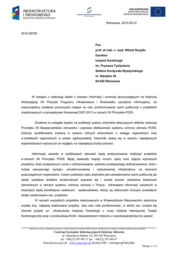 Warszawa, 2015-05-27 2015-05700 Pan prof. dr hab. n. med. Witold Rużyłło Dyrektor Instytut Kardiologii im. Prymasa Tysiąclecia Stefana Kardynała Wyszyńskiego ul. Alpejska 42 04-628 Warszawa W związku z realizacją zadań z obszaru informacji i promocji spoczywających na Instytucji Wdrażającej XII Priorytet Programu Infrastruktura i Środowisko uprzejmie informujemy, że rozpoczęliśmy działanie promocyjne mające na celu poinformowanie opinii publicznej o projektach zrealizowanych w perspektywie finansowej 2007-2013 w ramach XII Priorytetu POIS. Działanie to polegało będzie na publikacji sześciu artykułów dotyczących efektów realizacji Priorytetu XII Bezpieczeństwo zdrowotne i poprawa efektywności systemu ochrony zdrowia POIiŚ. Artykuły opublikowane zostaną w sześciu różnych dziennikach o zasięgu regionalnym oraz w dodatkach regionalnych w prasie ogólnopolskiej. Dzienniki ukażą się w sześciu największych województwach wybranych ze względu na największą liczbę ludności. Informacje zawarte w publikacjach stanowić będą podsumowanie realizacji projektów w ramach XII Priorytetu POIiŚ. Będą zawierały między innymi: opisy oraz zdjęcia wybranych projektów, ilości podpisanych umów o dofinansowanie, wartości przekazanego dofinansowania, ilości i rodzaj zakupionego sprzętu, zmodernizowanej i wybudowanej infrastruktury na terenach poszczególnych województw. Celem publikacji cyklu artykułów jest uświadomienie opinii publicznej jak dzięki udziałowi środków strukturalnych poprawił się i wzrósł poziom udzielania świadczeń zdrowotnych w ramach systemu ochrony zdrowia z Polsce. Adresatami informacji zawartych w artykułach będą beneficjenci ostateczni - społeczeństwo, którzy są odbiorcami korzyści powstałych dzięki zrealizowaniu ww. projektów. W ramach wszystkich projektów realizowanych w Województwie Mazowieckim wyłonione zostały trzy, najlepiej realizowane projekty. Jest nam miło poinformować, iż wśród ww. znalazł się również projekt pn. „Rozbudowa Instytutu Kardiologii o nowy Oddział Intensywnej Terapii Kardiologicznej wraz z przebudową Klinik i doposażeniem Instytutu o wysokospecjalistyczny aparat Dokument w postaci elektronicznej opatrzony został bezpiecznym podpisem elektronicznym weryfikowanym za pomocą ważnego kwalifikowanego certyfikatu. Centrum Systemów Informacyjnych Ochrony Zdrowia ul. Stanisława Dubois 5A, 00-184 Warszawa tel. +48(22) 597-09-27 fax +48(22) 597-09-47 [email protected] www.csioz.gov.pl skrytka ESP : /csiozgovpl/skrytka Strona 1 z 2 hemodynamiczny przystosowany do pracy hybrydowej” prowadzony przez Państwa jednostkę. Artykuł zostanie opublikowany w „Dzienniku Rzeczpospolita”. Z poważaniem, Dyrektor Centrum Systemów Informacyjnych Ochrony Zdrowia (-) Marcin Kędzierski Sporządził: Katarzyna Podulka Dokument w postaci elektronicznej opatrzony został bezpiecznym podpisem elektronicznym weryfikowanym za pomocą ważnego kwalifikowanego certyfikatu. Centrum Systemów Informacyjnych Ochrony Zdrowia ul. Stanisława Dubois 5A, 00-184 Warszawa tel. +48(22) 597-09-27 fax +48(22) 597-09-47 [email protected] www.csioz.gov.pl Strona 2 z 2