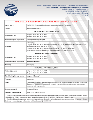 Instytut Meteorologii i Gospodarki Wodnej - Państwowy Instytut Badawczy Centralne Biuro Prognoz Meteorologicznych w Krakowie 30-215 Kraków ul. Piotra Borowego 14 tel: 12-6398150, fax: 12-4251973 email: [email protected] www: www.imgw.pl PROGNOZA NIEBEZPIECZNYCH ZJAWISK METEOROLOGICZNYCH Nazwa biura IMGW-PIB Centralne Biuro Prognoz Meteorologicznych w Krakowie Obszar Województwo śląskie PROGNOZA NA PIERWSZĄ DOBĘ Ważność (cz. urz.) od godz. 07:30 dnia 04.01.2017 do godz. 07:30 dnia 05.01.2017 Zjawisko/stopień zagrożenia Intensywne opady śniegu/1 Przebieg Obowiązują: Do godz.09:00 dnia 04.01.2017 OSTRZEŻENIE nr 1 na INTENSYWNE OPADY ŚNIEGU/1 wydane o godz.06:32 dnia 03.01.2017. Do godz.08:00 dnia 04.01.2017 OSTRZEŻENIE nr 2 na SILNY WIATR/1, ZAWIEJE/ZAMIECIE ŚNIEŻNE/1 wydane o godz.14:16 dnia 03.01.2017. PROGNOZA NA DRUGĄ DOBĘ Ważność (cz. urz.) od godz. 07:30 dnia 05.01.2017 do godz. 07:30 dnia 06.01.2017 Zjawisko/stopień zagrożenia nie przewiduje się/- Przebieg nie dotyczy PROGNOZA NA TRZECIĄ DOBĘ Ważność (cz. urz.) od godz. 07:30 dnia 06.01.2017 do godz. 07:30 dnia 07.01.2017 Zjawisko/stopień zagrożenia nie przewiduje się/- Przebieg nie dotyczy Uwagi Prognoza niebezpiecznych zjawisk meteorologicznych jest informacją orientacyjną. Wydawanie depeszy OSTRZEŻENIE unieważnia i anuluje wszystkie informacje dotyczące tego samego okresu zawarte w prognozie. Dyżurny synoptyk Grzegorz Mikutel Godzina i data wydania godz. 14:51 dnia 03.01.2017 Opracowanie niniejsze i jego format, jako przedmiot prawa autorskiego podlega ochronie prawnej, zgodnie z przepisami ustawy z dnia 4 lutego 1994r o prawie autorskim i prawach pokrewnych (dz. U. z 2006 r. Nr 90, poz. 631 z późn. zm.). Wszelkie dalsze udostępnianie, rozpowszechnianie (przedruk, kopiowanie, wiadomość sms) jest dozwolone wyłącznie w formie dosłownej z bezwzględnym wskazaniem źródła informacji tj. IMGW-PIB.