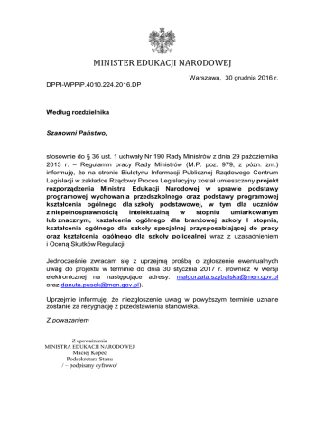 MINISTER EDUKACJI NARODOWEJ Warszawa, 30 grudnia 2016 r. DPPI-WPPiP.4010.224.2016.DP Według rozdzielnika Szanowni Państwo, stosownie do § 36 ust. 1 uchwały Nr 190 Rady Ministrów z dnia 29 października 2013 r. – Regulamin pracy Rady Ministrów (M.P. poz. 979, z późn. zm.) informuję, że na stronie Biuletynu Informacji Publicznej Rządowego Centrum Legislacji w zakładce Rządowy Proces Legislacyjny został umieszczony projekt rozporządzenia Ministra Edukacji Narodowej w sprawie podstawy programowej wychowania przedszkolnego oraz podstawy programowej kształcenia ogólnego dla szkoły podstawowej, w tym dla uczniów z niepełnosprawnością intelektualną w stopniu umiarkowanym lub znacznym, kształcenia ogólnego dla branżowej szkoły I stopnia, kształcenia ogólnego dla szkoły specjalnej przysposabiającej do pracy oraz kształcenia ogólnego dla szkoły policealnej wraz z uzasadnieniem i Oceną Skutków Regulacji. Jednocześnie zwracam się z uprzejmą prośbą o zgłoszenie ewentualnych uwag do projektu w terminie do dnia 30 stycznia 2017 r. (również w wersji elektronicznej na następujące adresy: [email protected] oraz [email protected]). Uprzejmie informuję, że niezgłoszenie uwag w powyższym terminie uznane zostanie za rezygnację z przedstawienia stanowiska. Z poważaniem Z upoważnienia MINISTRA EDUKACJI NARODOWEJ Maciej Kopeć Podsekretarz Stanu / – podpisany cyfrowo/ Otrzymują: 1) 2) 3) 4) 5) 6) 7) 8) 9) 10) 11) 12) 13) 14) 15) 16) 17) 18) 19) 20) 21) 22) 23) 24) 25) 26) 27) 28) 29) 30) 31) 32) 33) 34) 35) 36) 37) 38) 39) 40) 41) 42) 43) Chrześcijański Związek Zawodowy „Solidarność im. ks. J. Popiełuszki” Federacja Związków Zawodowych Pracowników Kultury i Sztuki Komisja Krajowa Federacji Regionów i Komisji Zakładowych „Solidarność 80” Komisja Krajowa NSZZ „Solidarność 80” Konfederacja Związków Zawodowych Górnictwa w Polsce NSZZ Pracowników Schronisk dla Nieletnich i Zakładów Poprawczych Sekcja Krajowa Oświaty i Wychowania NSZZ „Solidarność” Sekcja Oświaty KNSZZ „Solidarność 80” Wolny Związek Zawodowy „Solidarność – Oświata” Wolny Związek Zawodowy „Sierpień 80” Komisja Krajowa Związek Nauczycielstwa Polskiego Związek Zakładów Doskonalenia Zawodowego Związek Zawodowy Nauczycieli Średnich Szkół Leśnych w Polsce Związek Zawodowy „Rada Poradnictwa” Związek Zawodowy Pracowników Oświaty i Wychowania „Oświata” Alians Ewangeliczny Business Centre Club Federacja Stowarzyszeń Naukowo-Technicznych Federacja Inicjatyw Oświatowych Forum Rodziców przy Ministrze Edukacji Narodowej Fundacja Rozwoju Dzieci im. Komeńskiego Fundacja Rozwoju Systemu Edukacji Fundacja Rodzice Szkole Fundacja Polskie Forum Migracyjne Fundacja na rzecz Różnorodności Społecznej Fundacja Rozwoju Demokracji Lokalnej Instytut Pamięci Narodowej Komitet Nauk Pedagogicznych PAN Konferencja Dyrektorów Bibliotek Pedagogicznych Konferencja Rektorów Akademickich Szkół Polskich Konfederacja Lewiatan Konfederacja Stowarzyszeń Nauczycielskich Krajowe Forum Oświaty Niepublicznej Krajowe Porozumienie Rodziców i Rad Rodziców Ogólnopolska Federacja Organizacji Pozarządowych Ogólnopolskie Stowarzyszenie Dwujęzyczności Bilinguis Ogólnopolskie Stowarzyszenie Kadry Kierowniczej Oświaty Ogólnopolskie Stowarzyszenie Powiatowych i Gminnych Samorządowych Ośrodków Doskonalenia Nauczycieli Rada Dzieci i Młodzieży przy Ministrze Edukacji Narodowej Rada Języka Polskiego przy Prezydium Polskiej Akademii Nauk Rada do spraw Szkolnictwa Artystycznego Rada Szkół Katolickich Polska Akademia Umiejętności 44) 45) 46) 47) 48) 49) 50) 51) 52) 53) 54) 55) 56) 57) 58) 59) 60) 61) 62) 63) 64) 65) 66) 67) 68) 69) 70) 71) 72) 73) 74) 75) 76) 77) 78) 79) 80) 81) 82) 83) 84) 85) 86) Polska Izba Książki Polska Rada Ekumeniczną Polskie Stowarzyszenie Dyrektorów Szkół Polskie Stowarzyszenie na Rzecz Osób z Upośledzeniem Umysłowym Polski Stowarzyszenie Nauczycieli Przedmiotów Przyrodniczych Polskie Towarzystwo Botaniczne Polskie Towarzystwo Chemiczne Polskie Towarzystwo Fizyczne Polskie Towarzystwo Geograficzne Polskie Towarzystwo Historyczne Polskie Towarzystwo Informatyczne Polskie Towarzystwo Matematyczne Polskie Towarzystwo Przyrodników Pracodawcy Rzeczypospolitej Polskiej Sekretariat Konferencji Episkopatu Polski Społeczne Towarzystwo Oświatowe Stowarzyszenie Akademickich Ośrodków Nauczania Języków Obcych SERMO Stowarzyszenie Bibliotekarzy Polskich Stowarzyszenie Dyrektorów Szkół Średnich Stowarzyszenie Dyrektorów i Nauczycieli Centrów Kształcenia Praktycznego Stowarzyszenie Doradców Szkolnych i Zawodowych Rzeczpospolitej Polskiej Stowarzyszenie Edukatorów Stowarzyszenie Edukatorów Samorządowych Stowarzyszenie Nauczycieli Edukacji Początkowej Stowarzyszenie Nauczycieli Fizyki Stowarzyszenie Nauczycieli Historii Stowarzyszenie Nauczycieli Humanistów Stowarzyszenie Nauczycieli Matematyki Stowarzyszenie Nauczycieli Twórczych Stowarzyszenie Nauczycieli Polonistów Stowarzyszenie Nauczycieli Przedmiotów Przyrodniczych i Technicznych Stowarzyszenie Nauczycieli Technologii Informacyjnej Stowarzyszenie Nauczycieli Przedsiębiorczości i Edukacji Ekonomicznej Stowarzyszenie Nauczycieli Języka Angielskiego w Polsce IATEFL PL Stowarzyszenie Nauczycieli Języka Angielskiego "Prime" w Polsce Stowarzyszenie Nauczycieli Języka Niemieckiego Stowarzyszenie Nauczycieli Języka Francuskiego w Polsce PROFEUROPE Stowarzyszenie na Rzecz Edukacji Obywatelskiej Stowarzyszenie Oświatowców Polskich Stowarzyszenie Wspierania Rozwoju Organizacyjnego Szkół Towarzystwo Nauczycieli Bibliotekarzy Szkół Polskich Unia Metropolii Polskich Unia Miasteczek Polskich 87) 88) 89) 90) 91) 92) 93) 94) 95) 96) Towarzystwo Szkół Twórczych Towarzystwo Wiedzy Powszechnej – Zarząd Główny Zarząd Krajowy Polskiego Towarzystwa Ekonomicznego Związek Gmin Wiejskich RP Związek Miast Polskich Związek Powiatów Polskich Zwi