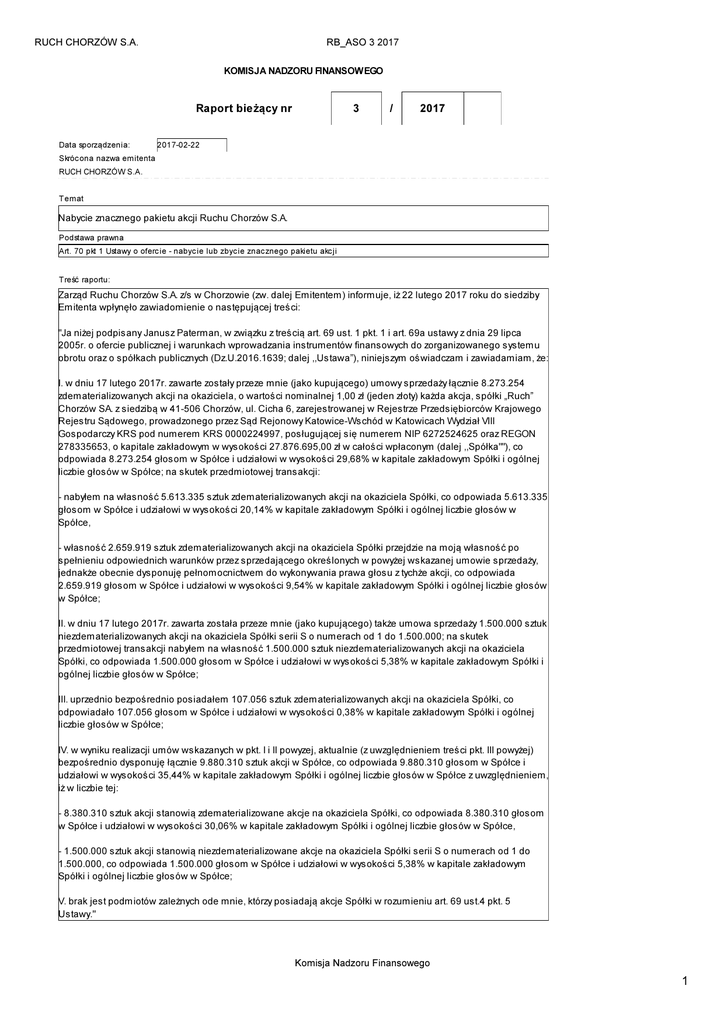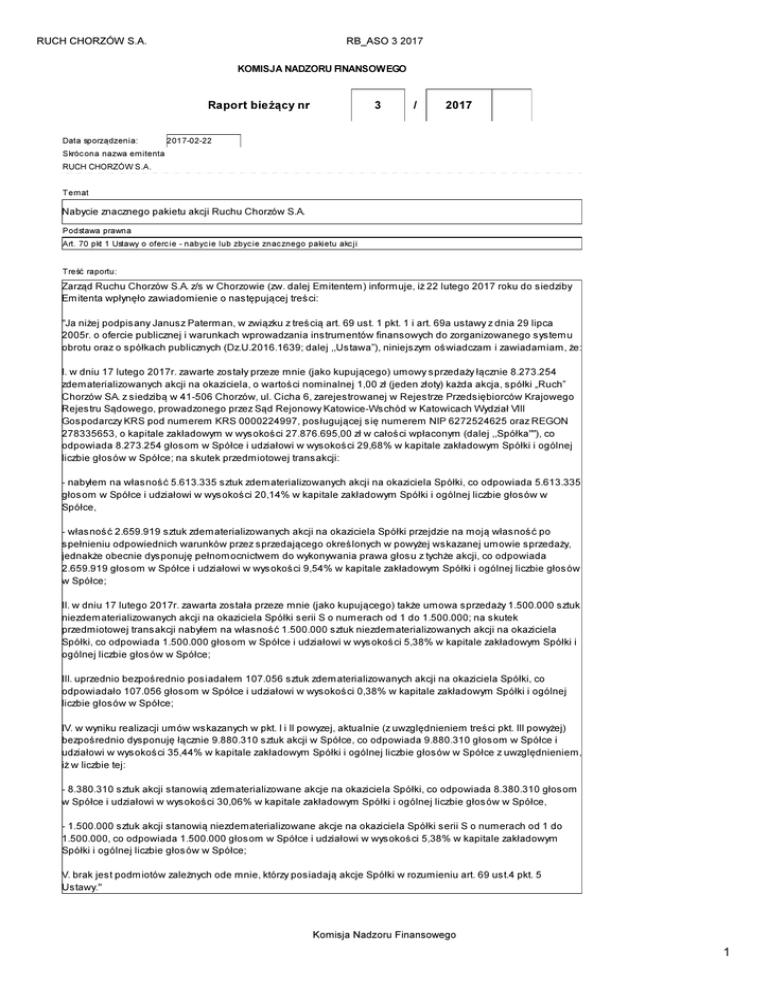 RUCH CHORZÓW S.A. RB_ASO 3 2017 KOMISJA NADZORU FINANSOWEGO Raport bieżący nr Data sporządzenia: 3 / 2017 2017-02-22 Skróc ona nazwa emitenta RUCH CHORZÓW S.A. Temat Nabycie znacznego pakietu akcji Ruchu Chorzów S.A. Podstawa prawna Art. 70 pkt 1 Ustawy o oferc ie - nabyc ie lub zbycie znac znego pakietu akcji Treść raportu: Zarząd Ruchu Chorzów S.A. z/s w Chorzowie (zw. dalej Emitentem) informuje, iż 22 lutego 2017 roku do siedziby Emitenta wpłynęło zawiadomienie o następującej treści: "Ja niżej podpisany Janusz Paterman, w związku z treścią art. 69 ust. 1 pkt. 1 i art. 69a ustawy z dnia 29 lipca 2005r. o ofercie publicznej i warunkach wprowadzania instrumentów finansowych do zorganizowanego systemu obrotu oraz o spółkach publicznych (Dz.U.2016.1639; dalej ,,Ustawa”), niniejszym oświadczam i zawiadamiam, że: I. w dniu 17 lutego 2017r. zawarte zostały przeze mnie (jako kupującego) umowy sprzedaży łącznie 8.273.254 zdematerializowanych akcji na okaziciela, o wartości nominalnej 1,00 zł (jeden złoty) każda akcja, spółki „Ruch” Chorzów SA. z siedzibą w 41-506 Chorzów, ul. Cicha 6, zarejestrowanej w Rejestrze Przedsiębiorców Krajowego Rejestru Sądowego, prowadzonego przez Sąd Rejonowy Katowice-Wschód w Katowicach Wydział VIII Gospodarczy KRS pod numerem KRS 0000224997, posługującej się numerem NIP 6272524625 oraz REGON 278335653, o kapitale zakładowym w wysokości 27.876.695,00 zł w całości wpłaconym (dalej ,,Spółka""), co odpowiada 8.273.254 głosom w Spółce i udziałowi w wysokości 29,68% w kapitale zakładowym Spółki i ogólnej liczbie głosów w Spółce; na skutek przedmiotowej transakcji: - nabyłem na własność 5.613.335 sztuk zdematerializowanych akcji na okaziciela Spółki, co odpowiada 5.613.335 głosom w Spółce i udziałowi w wysokości 20,14% w kapitale zakładowym Spółki i ogólnej liczbie głosów w Spółce, - własność 2.659.919 sztuk zdematerializowanych akcji na okaziciela Spółki przejdzie na moją własność po spełnieniu odpowiednich warunków przez sprzedającego określonych w powyżej wskazanej umowie sprzedaży, jednakże obecnie dysponuję pełnomocnictwem do wykonywania prawa głosu z tychże akcji, co odpowiada 2.659.919 głosom w Spółce i udziałowi w wysokości 9,54% w kapitale zakładowym Spółki i ogólnej liczbie głosów w Spółce; II. w dniu 17 lutego 2017r. zawarta została przeze mnie (jako kupującego) także umowa sprzedaży 1.500.000 sztuk niezdematerializowanych akcji na okaziciela Spółki serii S o numerach od 1 do 1.500.000; na skutek przedmiotowej transakcji nabyłem na własność 1.500.000 sztuk niezdematerializowanych akcji na okaziciela Spółki, co odpowiada 1.500.000 głosom w Spółce i udziałowi w wysokości 5,38% w kapitale zakładowym Spółki i ogólnej liczbie głosów w Spółce; III. uprzednio bezpośrednio posiadałem 107.056 sztuk zdematerializowanych akcji na okaziciela Spółki, co odpowiadało 107.056 głosom w Spółce i udziałowi w wysokości 0,38% w kapitale zakładowym Spółki i ogólnej liczbie głosów w Spółce; IV. w wyniku realizacji umów wskazanych w pkt. I i Il powyzej, aktualnie (z uwzględnieniem treści pkt. III powyżej) bezpośrednio dysponuję łącznie 9.880.310 sztuk akcji w Spółce, co odpowiada 9.880.310 głosom w Spółce i udziałowi w wysokości 35,44% w kapitale zakładowym Spółki i ogólnej liczbie głosów w Spółce z uwzględnieniem, iż w liczbie tej: - 8.380.310 sztuk akcji stanowią zdematerializowane akcje na okaziciela Spółki, co odpowiada 8.380.310 głosom w Spółce i udziałowi w wysokości 30,06% w kapitale zakładowym Spółki i ogólnej liczbie głosów w Spółce, - 1.500.000 sztuk akcji stanowią niezdematerializowane akcje na okaziciela Spółki serii S o numerach od 1 do 1.500.000, co odpowiada 1.500.000 głosom w Spółce i udziałowi w wysokości 5,38% w kapitale zakładowym Spółki i ogólnej liczbie głosów w Spółce; V. brak jest podmiotów zależnych ode mnie, którzy posiadają akcje Spółki w rozumieniu art. 69 ust.4 pkt. 5 Ustawy." Komisja Nadzoru Finansowego 1