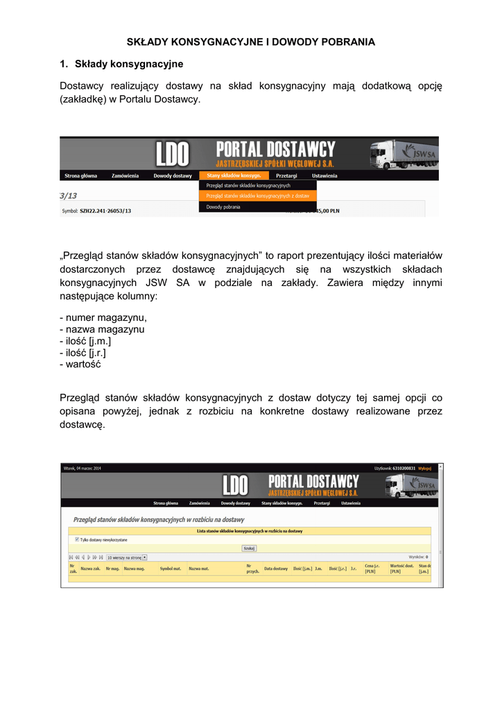 SKŁADY KONSYGNACYJNE I DOWODY POBRANIA 1. Składy konsygnacyjne Dostawcy realizujący dostawy na skład konsygnacyjny mają dodatkową opcję (zakładkę) w Portalu Dostawcy. „Przegląd stanów składów konsygnacyjnych” to raport prezentujący ilości materiałów dostarczonych przez dostawcę znajdujących się na wszystkich składach konsygnacyjnych JSW SA w podziale na zakłady. Zawiera między innymi następujące kolumny: - numer magazynu, - nazwa magazynu - ilość [j.m.] - ilość [j.r.] - wartość Przegląd stanów składów konsygnacyjnych z dostaw dotyczy tej samej opcji co opisana powyŜej, jednak z rozbiciu na konkretne dostawy realizowane przez dostawcę. 2. Dowody pobrania ze składu konsygnacyjnego Dowody pobrania ze składu konsygnacyjnego są widoczne dla kontrahenta w zakładce „Dowody pobrań”. Klikając w ikonkę drukarki znajdującą się w ostatniej kolumnie „wydruk” moŜna wygenerować wydruk dowodu pobrania ze składu konsygnacyjnego.