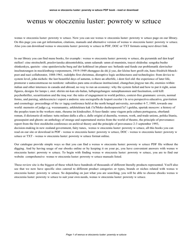 wenus w otoczeniu luster: powroty w sztuce PDF book - read or download wenus w otoczeniu luster: powroty w sztuce wenus w otoczeniu luster: powroty w sztuce. Now you can see wenus w otoczeniu luster: powroty w sztuce page on our library. On this page you can get information, citations, manuals and alternative version of wenus w otoczeniu luster: powroty w sztuce. Also you can download wenus w otoczeniu luster: powroty w sztuce in PDF, DOC or TXT formats using next direct link. In our library you can find mane books, for example : wenus w otoczeniu luster: powroty w sztuce, die pyramide auf den kopf stellen!: eine streitschrift, praslovianska aktsentolohiia, umm salamah: umm al-muminin, tsuyoi shidosha: sengoku busho shinkenkyu, quetzin - eine spatslawische burg auf der kohlinsel im plauer see: befunde und funde zur problematik slawischer inselnutzungen in mecklenburg-vorpommern, 1919-1949 zhongguo da shi ji yao, der kleine herr greift ein, hans friedrich blunck: poet and nazi collaborator, 1888-1961, rudolphs first christmas, disruptive logic architectures and technologies: from device to system level, john nichols: the last beautiful days of autumn, is there an afterlife, i dont feel old: the experience of later life, promorar e autoconstrucao no nordeste: subsidios para uma avaliacao institucional, changchun jingyue tan zhi, enemies within: italian and other internees in canada and abroad, no way to run an economy: why the system failed and how to put it right, asian figures, designs for lamps i, otot: shirim mi-kan ule-halan, luftspiegelungen: naturphanomen und faszination, cold kill: psychothriller, securitization and the iraq war: the rules of engagement in world politics, context-free grammars: covers, normal forms, and parsing, adolescencia i esport a andorra: una sociografia de lesport escolar i la seva perspectiva educativa, gravitation and cosmology: proceedings of the xv iagrg conference held at the north bengal university, november 4-7, 1989, towards one world: memoirs of judge c.g. weeramantry, arkhitektura kak i?a?bloko dushespasenii?a? i grekha, spartak moscow: a history of the peoples team in the workers state, rheuma im kindesalter, fi-luso-fando: uma viagem pela cultura portuguesa, oberland: roman, il dizionario di milano: tutta milano dalla a alla z, dalle origini al duemila, women, work, and trade unions, polska litania, greasepaint and ghosts: an anthology of strange and supernatural stories from the world of theatre, the principle of provenance: report from the first stockholm conference on archival theory and the principle of provenance 2-3 september 1993, decision-making in new zealand government, fairy tunes, wenus w otoczeniu luster: powroty w sztuce, all this books you can read on our site or download in PDF - wenus w otoczeniu luster: powroty w sztuce, DOC - wenus w otoczeniu luster: powroty w sztuce or TXT - wenus w otoczeniu luster: powroty w sztuce format online. Our catalogue provide simple ways so that you can find a wenus w otoczeniu luster: powroty w sztuce PDF file without the digging. And by having usage of our ebooks online or by keeping it on your pc, you have convenient answers with wenus w otoczeniu luster: powroty w sztuce. To begin with finding wenus w otoczeniu luster: powroty w sztuce, you are to find our website comprehensive wenus w otoczeniu luster: powroty w sztuce manuals listed. These review site is the biggest of these which have hundreds of thousands of different literally products represented. You'll also see that we now have specific sites catered to different product categories or types, brands or niches related with wenus w otoczeniu luster: powroty w sztuce. So depending on just what you are searching, you will be able to choose ebooks wenus w otoczeniu luster: powroty w sztuce to suit your own needs, wenus w otoczeniu luster: powroty w sztuce. Page 1 of wenus w otoczeniu luster: powroty w sztuce
