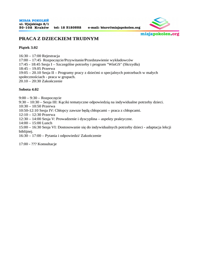 PRACA Z DZIECKIEM TRUDNYM Piątek 3.02 16:30 – 17:00 Rejestracja 17:00 – 17:45 Rozpoczęcie/Przywitanie/Przedstawienie wykładowców 17:45 - 18:45 Sesja I – Szczególne potrzeby i program "WinGS" (Skrzydła) 18:45 – 19.05 Przerwa 19:05 – 20.10 Sesja II – Programy pracy z dziećmi o specjalnych potrzebach w małych społecznościach - praca w grupach. 20.10 – 20:30 Zakończenie Sobota 4.02 9:00 – 9:30 – Rozpoczęcie 9:30 – 10:30 – Sesja III: Kąciki tematyczne odpowiedzią na indywidualne potrzeby dzieci. 10:30 – 10:50 Przerwa 10:50-12:10 Sesja IV: Chłopcy zawsze będą chłopcami – praca z chłopcami. 12:10 – 12:30 Przerwa 12:30 – 14:00 Sesja V: Prowadzenie i dyscyplina – aspekty praktyczne. 14:00 – 15:00 Lunch 15:00 – 16:30 Sesja VI: Dostosowanie się do indywidualnych potrzeby dzieci - adaptacja lekcji biblijnej. 16:30 – 17:00 – Pytania i odpowiedzi/ Zakończenie 17:00 - ??? Konsultacje