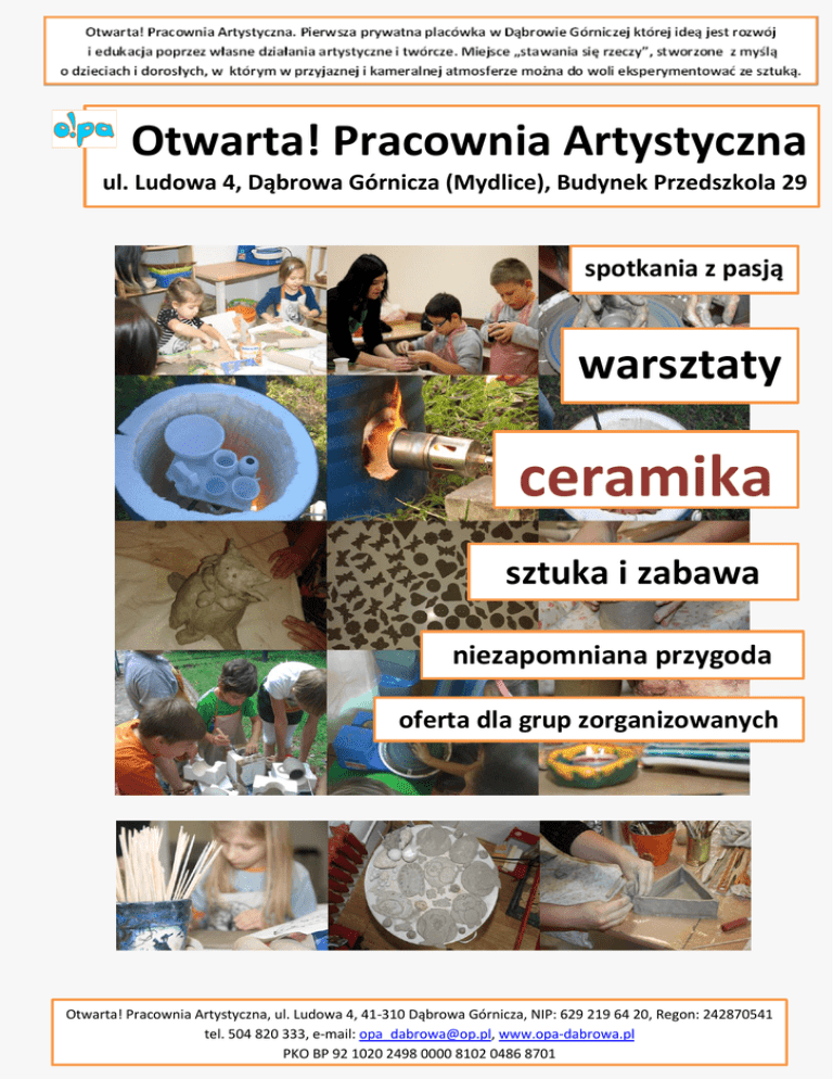 Otwarta! Pracownia Artystyczna ul. Ludowa 4, Dąbrowa Górnicza (Mydlice), Budynek Przedszkola 29 spotkania z pasją warsztaty ceramika sztuka i zabawa niezapomniana przygoda oferta dla grup zorganizowanych Otwarta! Pracownia Artystyczna, ul. Ludowa 4, 41-310 Dąbrowa Górnicza, NIP: 629 219 64 20, Regon: 242870541 tel. 504 820 333, e-mail: [email protected], www.opa-dabrowa.pl PKO BP 92 1020 2498 0000 8102 0486 8701 Podczas wizyty u Nas: - będziecie mieli możliwość samodzielnego wykonania pracy z gliny, sprawdzenia jakim jest materiałem, jak daje się modelować i kształtować - dowiecie się jak powstawały pierwsze gliniane wyroby ceramiczne - poznacie warsztat pracy współczesnego ceramika oraz niezmienne od lat metody wytwarzania przedmiotów z gliny - zobaczycie podstawowe formy, masę, glazury ceramiczne, ceramiczny piec - spróbujecie innych twórczych glinianych i ceramicznych aktywności Otwarta! Pracownia Artystyczna, ul. Ludowa 4, 41-310 Dąbrowa Górnicza, NIP: 629 219 64 20, Regon: 242870541 tel. 504 820 333, e-mail: [email protected], www.opa-dabrowa.pl PKO BP 92 1020 2498 0000 8102 0486 8701 ,0 PROGRAM SPOTKANIA: Prezentacja pracowni i programu spotkania. Krótka historia ceramiki. Omówienie technik ceramicznych począwszy od lepienia naczynia, poprzez jego zdobienie, szkliwienie i wypał w piecu. Pokaz odlewania naczynia w formie gipsowej (kubek). Pokaz toczenia na kole garncarskim. Warsztaty artystyczne – do wyboru: samodzielne tworzenie prac z gliny (wylepianie z plastra lub techniką wałeczkową, formowanie brył/rzeźb) zdobienie przedmiotów biskwitowych (szkliwienie, malowanie majolikami lub farbami akrylowymi) zdobienie kubeczków ceramicznych specjalnymi farbami/pisakami do ceramiki i porcelany tworzenie ceramicznych mozaik (układanie obrazów z kolorowych ceramicznych elementów) toczenie na kole garncarskim Otwarta! Pracownia Artystyczna, ul. Ludowa 4, 41-310 Dąbrowa Górnicza, NIP: 629 219 64 20, Regon: 242870541 tel. 504 820 333, e-mail: [email protected], www.opa-dabrowa.pl PKO BP 92 1020 2498 0000 8102 0486 8701 INFORMACJE DODATKOWE: Oferta została przygotowana dla grup zorganizowanych: klas, drużyn, zespołów, grup przedszkolnych lub rodzinkowych (min. 10 osób). Istnieje możliwość wyboru więcej niż jednego z proponowanych warsztatów. Toczenie na kole garncarskim jest zawsze drugim warsztatem. Czas trwania spotkania: od 2 do 3 godzin (uzależnione od szczegółowego programu spotkania oraz tempa pracy grupy podczas warsztatów) Koszt (zależny od wybranych warsztatów artystycznych): 20-35 pln/osoba Wszystkie prace są własnością ich autorów. Prace lepione są suszone w pracowni i wypalane na biskwit (odbiór po ok. 2 tygodniach). Rezerwacja terminów: Anna Dęboń, tel. 504 820 333 ZAPRASZAMY W PODRÓŻ DO ŚWIATA SZTUKI, KTÓRA NA DŁUGO POZOSTANIE W PAMIĘCI. Otwarta! Pracownia Artystyczna, ul. Ludowa 4, 41-310 Dąbrowa Górnicza, NIP: 629 219 64 20, Regon: 242870541 tel. 504 820 333, e-mail: [email protected], www.opa-dabrowa.pl PKO BP 92 1020 2498 0000 8102 0486 8701