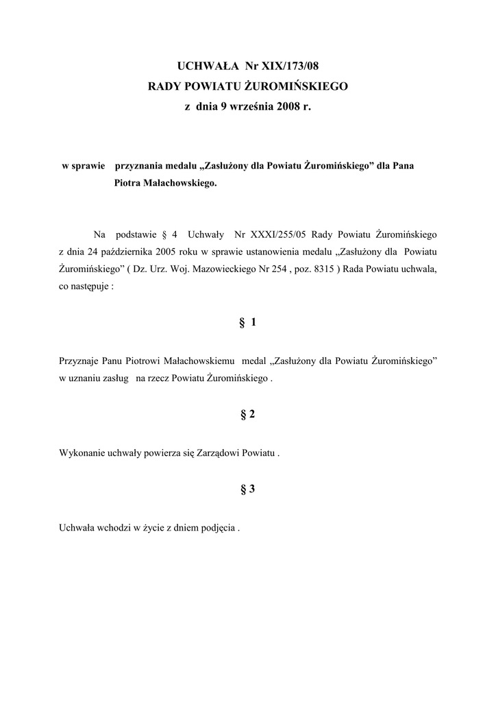 UCHWAŁA Nr XIX/173/08 RADY POWIATU śUROMIŃSKIEGO z dnia 9 września 2008 r. w sprawie przyznania medalu „ZasłuŜony dla Powiatu śuromińskiego” dla Pana Piotra Małachowskiego. Na podstawie § 4 Uchwały Nr XXXI/255/05 Rady Powiatu śuromińskiego z dnia 24 października 2005 roku w sprawie ustanowienia medalu „ZasłuŜony dla Powiatu śuromińskiego” ( Dz. Urz. Woj. Mazowieckiego Nr 254 , poz. 8315 ) Rada Powiatu uchwala, co następuje : § 1 Przyznaje Panu Piotrowi Małachowskiemu medal „ZasłuŜony dla Powiatu śuromińskiego” w uznaniu zasług na rzecz Powiatu śuromińskiego . §2 Wykonanie uchwały powierza się Zarządowi Powiatu . §3 Uchwała wchodzi w Ŝycie z dniem podjęcia . Nr wniosku 5 WNIOSEK PRZYZNANIE MEDALU „ZASŁUśONY DLA POWIATU śUROMIŃSKIEGO DLA OSOBY FIZYCZNEJ 1. Imię i nazwisko PIOTR MAŁACHOWSKI 2. Data i miejsce urodzenia 7 czerwca 1983 r. w śurominie 3. Miejsce zamieszkania 09-320 BieŜuń, ul. Płocka 10 4. Miejsce zatrudnienia, stanowisko. Reprezentuje Klub Śląsk Wrocław, a trenuje w ośrodku miotaczy działającym pod egidą PZLA na obiektach warszawskiej AWF – trener Witold Suski. 5. Szczegółowy opis zasług uzasadniających przyznanie medalu Jest wychowankiem ciechanowskiej szkoły miotaczy . W 2001 r. był szósty w mistrzostwach Europy juniorów w Grosseto, w 2002 r. zajął piąte miejsce w mistrzostwach świata w tej kategorii wieku w Kingston, w 2005 r. został w Erfurcie młodzieŜowym wicemistrzem kontynentu. Sezon 2006 zaczął od rekordu Ŝyciowego 65.01 i zwycięstwa w Zimowym Pucharze Europy miotaczy w Tel Awiwie, by 29.06.2006 r. ( MALAGA ) triumfować w najwaŜniejszej rozgrywce pucharowej na Starym Kontynencie i zostać rekordzistą Polski w rzucie dyskiem z wynikiem 66.21. Dotychczasowy rekord kraju wynosił 65.98 i był ustanowiony 24.08.1985 r. w Warszawie przez Dariusza Juzyszyna. 23.07.2006 r. w Mistrzostwach Polski w Bydgoszczy uzyskał 64.82 i został Mistrzem Polski. Stała progresja wyników i ponowne Mistrzostwa Polski w roku 2007 i 2008. Nominacja Olimpijska i srebrny medal – jeden z dziesięciu całej reprezentacji Polski. 6. Inne dane uzupełniające wniosek REKORDZISTA POLSKI W RZUCIE DYSKIEM i aktualny MISTRZ POLSKI V-ce MISTRZ OLIMPIJSKI – PEKIN 2008 7. Załączniki Artykuły z Przeglądu Sportowego 8. Oznaczenie wnioskodawcy (adres, telefon, data, imię i nazwisko, pieczątka podpis) starosta Zarząd Powiatu śuromińskiego – 27.08.2008 r. k 9. Opinia Zarządu Powiatu (data, nr protokołu, podpis Przewodniczącego lub jego Zastępcy) Pozytywna opinia Zarządu Powiatu śuromińskiego – Protokół z posiedzenia Zarządu Nr 54/2008 z dnia 27.08.2008 r.