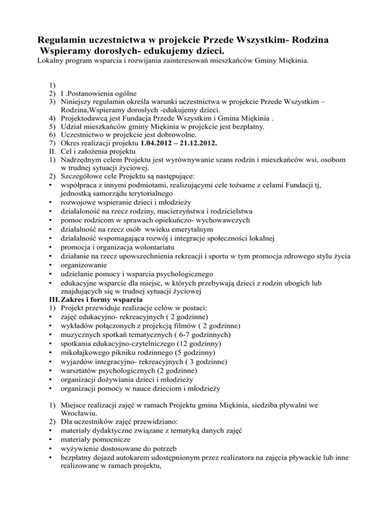 Regulamin uczestnictwa w projekcie Przede Wszystkim- Rodzina Wspieramy dorosłych- edukujemy dzieci. Lokalny program wsparcia i rozwijania zainteresowań mieszkańców Gminy Miękinia. 1) 2) I .Postanowienia ogólne 3) Niniejszy regulamin określa warunki uczestnictwa w projekcie Przede Wszystkim – Rodzina,Wspieramy dorosłych -edukujemy dzieci. 4) Projektodawcą jest Fundacja Przede Wszystkim i Gmina Miękinia . 5) Udział mieszkańców gminy Miękinia w projekcie jest bezpłatny. 6) Uczestnictwo w projekcie jest dobrowolne. 7) Okres realizacji projektu 1.04.2012 – 21.12.2012. II. Cel i założenia projektu 1) Nadrzędnym celem Projektu jest wyrównywanie szans rodzin i mieszkańców wsi, osobom w trudnej sytuacji życiowej. 2) Szczegółowe cele Projektu są następujące: • współpraca z innymi podmiotami, realizującymi cele tożsame z celami Fundacji tj, jednostką samorządu terytorialnego • rozwojowe wspieranie dzieci i młodzieży • działaloność na rzecz rodziny, macierzyństwa i rodzicielstwa • pomoc rodzicom w sprawach opiekuńczo- wychowawczych • działalność na rzecz osób wwieku emerytalnym • działalność wspomagająca rozwój i integracje społeczności lokalnej • promocja i organizacja wolontariatu • działanie na rzecz upowszechnienia rekreacji i sportu w tym promocja zdrowego stylu życia • organizowanie • udzielanie pomocy i wsparcia psychologicznego • edukacyjne wsparcie dla miejsc, w których przebywają dzieci z rodzin ubogich lub znajdujących się w trudnej sytuacji życiowej III.Zakres i formy wsparcia 1) Projekt przewiduje realizacje celów w postaci: • zajęć edukacyjno- rekreacyjnych ( 2 godzinne) • wykładów połączonych z projekcją filmów ( 2 godzinne) • muzycznych spotkań tematycznych ( 6-7 godzinnych) • spotkania edukacyjno-czytelniczego (12 godzinny) • mikołajkowego pikniku rodzinnego (5 godzinny) • wyjazdów integracyjno- rekreacyjnych ( 3 godzinne) • warsztatów psychologicznych (2 godzinne) • organizacji dożywiania dzieci i młodzieży • organizacji pomocy w nauce dzieciom i młodzieży 1) Miejsce realizacji zajęć w ramach Projektu gmina Miękinia, siedziba pływalni we Wrocławiu. 2) Dla uczestników zajęć przewidziano: • materiały dydaktyczne związane z tematyką danych zajęć • materiały pomocnicze • wyżywienie dostosowane do potrzeb • bezpłatny dojazd autokarem udostępnionym przez realizatora na zajęcia pływackie lub inne realizowane w ramach projektu, • • upominki lub nagrody, dostęp do całości zasobów dydaktycznych w ramach Projektu. IV. Uczestnicy projektu 1) Grupa docelowa – Klub Kangura Uczestnikami grupy mogą być kobiety lub mężczyżni z dziećmi do lat 4, zameldowani mieszkańcy Gminy Miękinia, którzy wypełnią deklarację uczestnictwa w projekcie i zobowiążą się do realizacji ustaleń zawartych w niniejszym regulaminie. 2) Grupa docelowa – Klub Młodego Zdobywcy Uczestnikami grupy mogą być dzieci – uczniowie szkół podstawowych od kl. I do V włącznie, których rodzice lub opiekunowie wypełnią deklarację uczestnictwa dziecka w projekcie i zobowiążą się do realizacji ustaleń zawartch w niniejszym regulaminie. 3) Grupa docelowa – Klub Sportowców Świata Uczestnikami grupy mogą być dzieci – uczniowie kl. VI w roku szkolnym 2011/12 oraz uczniowie kl. I i II Gimnazjum w gminie Miękinia, których rodzice lub opiekunowie wypełnią deklaracje uczestnictwa i zobowiążą się do realizacji ustaleń zawartch w niniejszym regulaminie. 4) Grupa docelowa – Klub Kreatywnego Seniora Uczestnikami grupy mogą być dorośli zameldowani mieszkańcy gminy Miękinia, którzy wypełnią deklaracje uczestnictwa w projekcie i zobowiążą się do realizacji ustaleń zawartych w niniejszym regulaminie. V. Ogólne zasady rekrutacji 1) Rekrutacja będzie uwzględniała zasady równych szans poprzez zapewnienie możliwości udziału bez względu na płeć, miejsce zamieszkania na terenie gminy, ze szczególnym uwzględnieniem rodzin i osób w trudnej sytuacji życiowej. Opis procesu rekrutacji 1) Nabór do projektu zapoczątkowany zostanie akcją informacyjno- promocyjną na terenie gminy. 2) Zgłoszenie do udziału w Projekcie jest jednoznaczne z podpisaniem deklaracji uczestnictwa w projekcie. Deklaracja udziału znajduje się na stronie gminy Miękinia oraz bezpośrednio u Koordynatora projektu. 3) Ostateczny wybór grup docelowych pozostaje w kompetencji Fundacji Przede Wszystkim i Koordynatora projektu. 4) Proces rekrutacji będzie zmierzał do wytypowania grupy: 20 kobiet lub mężczyzn w grupie Klub Kangura, 20 uczniów w grupie Klub Młodego Zdobywcy, 20 uczniów w Klubie Sportowców Świata, 35 osób dorosłych w grupie Klub Kreatywnego Seniora. 5) W przypadku dużego zainteresowania danymi zajęciami będą tworzone listy rezerwowe. 6) W przypadku dużego zainteresowania Realizator Projektu zastrzega sobie możliwość wprowadzenia dodatkowych kryteriów. VI. Uprawnienia i obowiązki uczestnika 1) Uczestnicy są uprawnieni do nieodpłatnego udziału w Projekcie . 2) Uczestnik jest zaobowiązany do udostępnienia swoich danych osobowych i przetwarzania wizerunku na potrzeby projektu. 3) Uczestnik jest zobowiązany do potwierdzenia swojego uczestnictwa w zajęciach, warsztatach, wyjazdach, spotkaniach integracyjnych własnoręcznym podpisem. 4) Realizator dopuszcza usprawiedliwioną nieobecność spowodowaną chorobą lub sytuacjami losowymi. Usprawiedliwienie wymaga poinformowania koordynatora projektu – w przypadku osób małoletnich osobami uprawnionymi do usprawiedliwienia nieobecności są rodzice lub opiekunowie. 5) Uczestnicy zobowiązani są do wypełniania ankiet monitorujących przebieg Projektu, przedkładanych im przez Koordynatora. 6) Warunkiem uczestnictwa w projekcie w miesiącu następnym w przypadku osób małoletnich jest udział rodziców lub opiekunów w spotkaniu edukacyjnym odbywajacym się w każdą ostatnią 