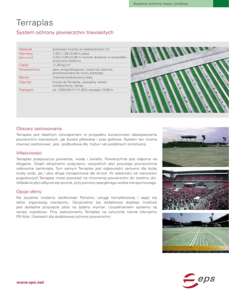 Systemy ochrony trawy i podłoża Terraplas System ochrony powierzchni trawiastych Materiał Wymiary (d x s x w) Ciężar Powierzchnia Barwa Osprzęt Transport polietylen twardy ze stabilizatorem UV 1,00 x 1,00 x 0,06 m płyta 2,00 x 2,00 x 0,06 m wymiar dostawy w przypadku przykrycia stadionu 11,00 kg / m² pasy antypoślizgowe ( szare lub zielone), przystosowana do ruchu pieszego materiał podstawowy biały klucze do Terraplas, specjalny wózek transportowy, rampy ok. 1.000,00 m² (11,00 t) naczepa 13,60 m Obszary zastosowania Terraplas jest idealnym rozwiązaniem w przypadku konieczności zabezpieczenia powierzchni trawiastych, jak boiska piłkarskie i pola golfowe. System ten można równiez zastosować jako podbudowa dla trybun lub podobnych konstrukcji. Właściwości Terraplas przepuszcza powietrze, wodę i światło. Powierzchnia jest odporna na ślizganie. Dzięki okrężnemu połączeniu wszystkich płyt powstaje powierzchnia całkowicie zamknięta. Tym samym Terraplas jest odpowiedni zarówno dla dużej liczby osób, jak i jako droga transportowa dla skrzyń. W zależności od warunków pogodowych Terraplas może pozostać na chronionej powierzchni do siedmiu dni. Układanie płyt odbywa się ręcznie, przy pomocy specjalnego wózka transportowego. Opcje oferty Na życzenie możemy zaoferować Państwu usługę kompleksową i zająć się także organizacją transportu. Opcjonalnie (za dodatkową dopłatą) możliwe jest dokładne przycięcie płyty na żądany wymiar. Uzupełnieniem systemu są rampy wjazdowe. Przy zastosowaniu Terraplas na sztucznej trawie oferujemy PE-folie i Geotextil dla dodatkowej ochrony powierzchni. www.eps.net Systemy ochrony trawy i podłoża Terraplas Zastosowania Pokrycie stadionu, André Rieu World Stadium Tour, AAMI Stadiom Adelaide Pokrycie stadionu, Herbert Grönemeyer Koncert, Ruhrstadion Bochum Bezproblemowe przejście z jednego systemu ochrony powierzchni do następnego Impreza branżowa, Esprit Arena Düsseldorf © eps Pokrycie stadionu, U2 360° Tour, Berlin Kontakt i więcej informacji: [email protected]
