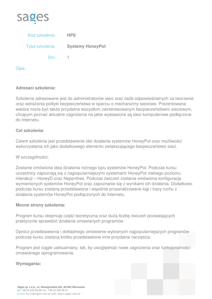 Kod szkolenia: Tytuł szkolenia: Dni: HPS Systemy HoneyPot 1 Opis: Adresaci szkolenia: Szkolenie adresowane jest do administratorów sieci oraz osób odpowiedzialnych za tworzenie oraz wdrażania polityki bezpieczeństwa w oparciu o mechanizmy sieciowe. Prezentowana wiedza może być także przydatna wszystkim zainteresowanym bezpieczeństwem sieciowym, chcącym poznać aktualne zagrożenia na jakie wystawione są sieci komputerowe podłączone do Internetu. Cel szkolenia: Celem szkolenia jest przedstawienie idei działania systemów HoneyPot oraz możliwości wykorzystania ich jako dodatkowego elementu zwiększającego bezpieczeństwo sieci. W szczególności: Zostanie omówiona idea działania rożnego typu systemów HoneyPot. Podczas kursu uczestnicy zapoznają się z najpopularniejszymi systemami HoneyPot niskiego poziomu interakcji – HoneyD oraz Nepenthes. Podczas ćwiczeń zostanie omówiona konfiguracja wymienionych systemów HoneyPot oraz zapoznanie się z wynikami ich działania. Dodatkowo podczas kursu zostaną przedstawione i wspólnie przeanalizowane logi i tracy ruchu z działania systemów HoneyPot podłączonych do Internetu. Mocne strony szkolenia: Program kursu obejmuję część teoretyczną oraz dużą liczbę ćwiczeń pozwalających praktycznie sprawdzić działanie omawianych programów. Oprócz przedstawienia i dokładnego omówienie wybranych najpopularniejszych programów podczas kursu zostaną krótko przedstawione inne przydatne narzędzia. Program jest ciągle uaktualniany, tak, by uwzględniać nowe zagrożenia oraz funkcjonalności omawianego oprogramowania. Wymagania: Od uczestników szkolenia wymagana jest znajomość podstawowych zagadnień związanych z sieciami komputerowymi (podstawowe protokoły i mechanizmy sieciowe, adresacji itp.) oraz podstawowa znajomość konfiguracji aplikacji oraz systemu Linux. Parametry szkolenia: 8 godzin (7 godzin netto) wykładów i ćwiczeń. Wielkość grupy: maks. 8-10 osób. Program szkolenia: Powered by TCPDF (www.tcpdf.org)