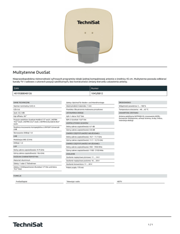 Multytenne DuoSat Nieprawdopodobna różnorodność cyfrowych programów dzięki jednej kompaktowej antenie o średnicy 45 cm. Multytenne pozwala odbierać kanały TV i radiowe z czterech pozycji satelitarnych, bez konieczności zmiany kierunku ustawienia anteny. EAN Numer 4019588048126 1045/8812 DANE TECHNICZNE Zalety: Optimal für Boden- und Wandmontage ŚRODOWISKO Wymiar nominalny: 0.45 m Wytzrymałość materiału: 1 mm Wilgotność powietrza: 5 ... 100 % F/D: 0.6 Powłoka: Obustronnie malowana proszkowo Temperatura otoczenia : -40 ... 65 °C Zysk: 32.2 dBi USTAWIENIA DISEQC ZAWARTOSC ZESTAWU Kąt offsetu: 30 ° A/A 1: Astra 19,2° Ost Pozycje satelitów: Eutelsat Hotbird 13° wsch. | ASTRA 19,2° wsch. | ASTRA 23,5° wsch. | ASTRA & Eurobird 28,5° wsch. B/A 2: Eutelsat 13,0° Ost Antena satelitarna SATMAN 45, mocowanie AZ/EL, konwerter Multytenne, uchwyt ścienny, śruby, imbus, instrukcja obsługi Średnica mocowania: kompatybilna z UNYSAT-UniversalLNB Dolny zakres częstotliwości: 0.7 dB Sterowanie: DiSEqC 1.0 ZAKRES CZĘSTOTLIWOŚCI WEJŚCIOWEJ LNB Dolny zakres częstotliwości: 10.7 - 11.7 GHz Modulacja LNB: 22 kHz Górny zakres częstotliwości: 11.7 - 12.75 GHz DiSEqC: 1.0 ZAKRES CZĘSTOTLIWOŚCI WYJŚCIOWEJ LOF Dolny zakres częstotliwości: 950 - 1950 MHz Dolny zakres częstotliwości: 9.75 GHz Górny zakres częstotliwości: 1100 - 2150 MHz Górny zakres częstotliwości: 10.6 GHz ZASILANIE OGÓLNA CHARAKTERYSTYKA Zasilanie napięciowe pionowe: 11 ... 14 V Materiał: Aluminium Zasilanie napięciowe poziome: 16 ... 20 V Zalety: 1 oder 2 Teilnehmer Zasilanie konwertera: 11 ... 20 V Zalety: 2 Orbitpositionen (Eutelsat 13° Ost und Astra 19,2° Ost) Pobór prądu: 170 mA WSPÓŁCZYNNIK SZUMÓW Górny zakres częstotliwości: 0.8 dB FUNKCJE FreiSatDigital Telewizja i radio HDTV 1/1 Powered by TCPDF (www.tcpdf.org)