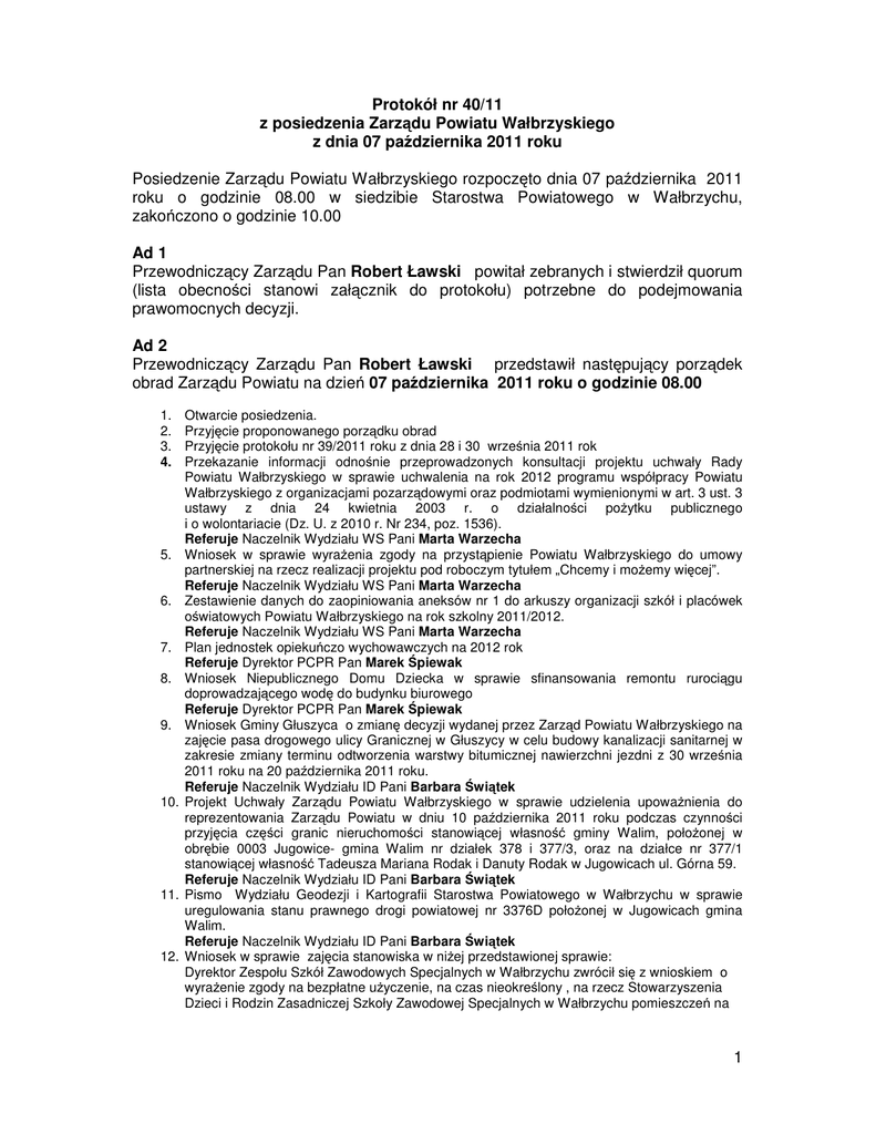 1 Protokół nr 40/11 z posiedzenia Zarządu Powiatu Wałbrzyskiego z