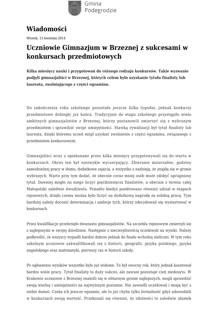 Wiadomości Wtorek, 15 kwietnia 2014 Uczniowie Gimnazjum w Brzeznej z sukcesami w konkursach przedmiotowych Kilka miesięcy nauki i przygotowań do różnego rodzaju konkursów. Takie wyzwanie podjęli gimnazjaliści w Brzeznej, których celem było uzyskanie tytułu finalisty lub laureata, zwalniającego z części egzaminu. Do zakończenia roku szkolnego pozostało jeszcze kilka tygodni, jednak konkursy przedmiotowe dobiegły już końca. Tradycyjnie do etapu szkolnego przystąpiło wielu ambitnych gimnazjalistów z Brzeznej, którzy postanowili zmierzyć się z wybranym przedmiotem i sprawdzić swoje umiejętności. Stawką rywalizacji był tytuł finalisty lub laureata, dzięki któremu uczeń mógł uzyskać zwolnienie z części egzaminu, związanego z przedmiotem konkursowym. Gimnazjaliści wraz z opiekunami przez kilka miesięcy przygotowywali się do startu w konkursach. Okres ten był niezwykle wyczerpujący. Zbieranie materiałów, godziny samodzielnej pracy w domu, dodatkowe zajęcia, a wszystko z nadzieją, że znajdą się w gronie wybranych. Warto przy tym dodać, że obecnie coraz mniej osób może zdobyć upragniony tytuł. Dawniej mogło na niego liczyć pięćdziesięciu finalistów, a obecnie z terenu całej Małopolski zaledwie dwudziestu. Ponadto kiedyś punktowano również udział w etapach rejonowych, dzięki czemu można było liczyć na dodatkową nagrodę za solidną pracę. Tym bardziej należy docenić determinację i ambicje tych, którzy zdecydowali się wystartować w konkursach. Przez kwalifikacje przebrnęło dwunastu gimnazjalistów. Na szczeblu rejonowym zmierzyli się z najlepszymi w swojej dziedzinie. Następnie z niecierpliwością oczekiwali na wyniki. Należy podkreślić, że wszyscy wypadli bardzo dobrze jednak do finału wchodzą nieliczni. W tym roku szkolnym uczniowie zakwalifikowali się z historii, geografii, języka polskiego, języka angielskiego oraz matematyki, pierwszy raz w historii szkoły. Po ogłoszeniu wyników wszystko było już widome. To był owocny rok, który jednak kosztował bardzo wiele pracy. Tytuł finalisty to duży sukces, ale zawsze pozostaje cień niedosytu. W Krakowie uczniowie z Brzeznej znaleźli się w elitarnym gronie najlepszych, mogli sprawdzić swoją wiedzę i umiejętności na najwyższym poziomie. Nie zawiedli oczekiwań i mogą być z siebie dumni. Czeka ich jeszcze egzamin, ale to już chyba tylko formalność gdyż udowodnili w konkursach swoją wartość. Przekonali się również, że zdolności to zaledwie ułamek sukcesu. Konieczna jest również systematyczność, pracowitość i trochę szczęścia. Uczniowie, którzy osiągnęli bardzo dobre wyniki w konkursach: Adam Cabała i Kamil Wolak – laureaci z historii (opiekun – p. S. Bodziony) Karolina Kuchnia – finalistka z matematyki (opiekun – p. S. Ogorzałek) Anna Monica – finalistka z języka polskiego (opiekun – p. B. Kula) oraz języka angielskiego (opiekun – p. A. Gasparska-Międlar) Mateusz Pasiut, Kamil Wolak i Wojciech Jojczyk – finaliści z geografii (opiekun – p. M. Zaweracz)