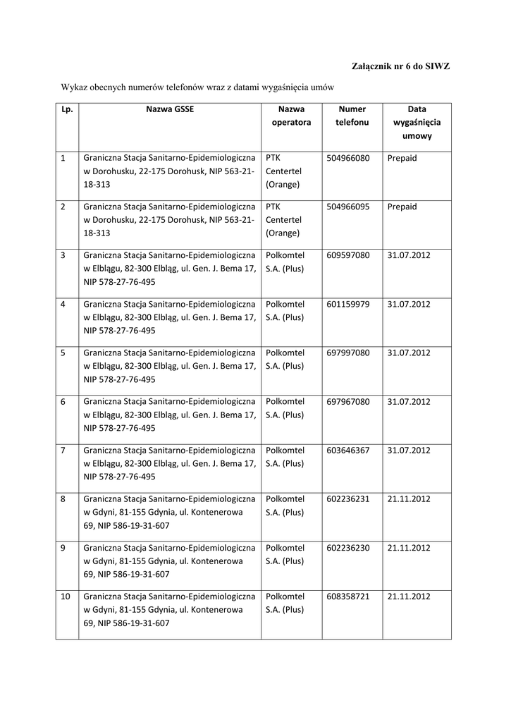 Załącznik nr 6 do SIWZ Wykaz obecnych numerów telefonów wraz z datami wygaśnięcia umów Lp. Nazwa GSSE Nazwa operatora Numer telefonu Data wygaśnięcia umowy 1 Graniczna Stacja Sanitarno-Epidemiologiczna w Dorohusku, 22-175 Dorohusk, NIP 563-2118-313 PTK Centertel (Orange) 504966080 Prepaid 2 Graniczna Stacja Sanitarno-Epidemiologiczna w Dorohusku, 22-175 Dorohusk, NIP 563-2118-313 PTK Centertel (Orange) 504966095 Prepaid 3 Graniczna Stacja Sanitarno-Epidemiologiczna w Elblągu, 82-300 Elbląg, ul. Gen. J. Bema 17, NIP 578-27-76-495 Polkomtel S.A. (Plus) 609597080 31.07.2012 4 Graniczna Stacja Sanitarno-Epidemiologiczna w Elblągu, 82-300 Elbląg, ul. Gen. J. Bema 17, NIP 578-27-76-495 Polkomtel S.A. (Plus) 601159979 31.07.2012 5 Graniczna Stacja Sanitarno-Epidemiologiczna w Elblągu, 82-300 Elbląg, ul. Gen. J. Bema 17, NIP 578-27-76-495 Polkomtel S.A. (Plus) 697997080 31.07.2012 6 Graniczna Stacja Sanitarno-Epidemiologiczna w Elblągu, 82-300 Elbląg, ul. Gen. J. Bema 17, NIP 578-27-76-495 Polkomtel S.A. (Plus) 697967080 31.07.2012 7 Graniczna Stacja Sanitarno-Epidemiologiczna w Elblągu, 82-300 Elbląg, ul. Gen. J. Bema 17, NIP 578-27-76-495 Polkomtel S.A. (Plus) 603646367 31.07.2012 8 Graniczna Stacja Sanitarno-Epidemiologiczna w Gdyni, 81-155 Gdynia, ul. Kontenerowa 69, NIP 586-19-31-607 Polkomtel S.A. (Plus) 602236231 21.11.2012 9 Graniczna Stacja Sanitarno-Epidemiologiczna w Gdyni, 81-155 Gdynia, ul. Kontenerowa 69, NIP 586-19-31-607 Polkomtel S.A. (Plus) 602236230 21.11.2012 10 Graniczna Stacja Sanitarno-Epidemiologiczna w Gdyni, 81-155 Gdynia, ul. Kontenerowa 69, NIP 586-19-31-607 Polkomtel S.A. (Plus) 608358721 21.11.2012 11 Graniczna Stacja Sanitarno-Epidemiologiczna w Gdyni, 81-155 Gdynia, ul. Kontenerowa 69, NIP 586-19-31-607 Polkomtel S.A. (Plus) 783914032 21.11.2012 12 Graniczna Stacja Sanitarno-Epidemiologiczna w Gdyni, 81-155 Gdynia, ul. Kontenerowa 69, NIP 586-19-31-607 Polkomtel S.A. (Plus) 783914031 21.11.2012 13 Graniczna Stacja Sanitarno-Epidemiologiczna w Gdyni, 81-155 Gdynia, ul. Kontenerowa 69, NIP 586-19-31-607 Polkomtel S.A. (Plus) 783914033 21.11.2012 14 Graniczna Stacja Sanitarno-Epidemiologiczna w Gdyni, 81-155 Gdynia, ul. Kontenerowa 69, NIP 586-19-31-607 Polkomtel S.A. (Plus) 608358722 21.11.2012 15 Graniczna Stacja Sanitarno-Epidemiologiczna w Gdyni, 81-155 Gdynia, ul. Kontenerowa 69, NIP 586-19-31-607 Polkomtel S.A. (Plus) 696476012 21.11.2012 16 Graniczna Stacja Sanitarno-Epidemiologiczna w Gdyni, 81-155 Gdynia, ul. Kontenerowa 69, NIP 586-19-31-607 Polkomtel S.A. (Plus) 606406196 21.11.2012 17 Graniczna Stacja Sanitarno-Epidemiologiczna w Gdyni, 81-155 Gdynia, ul. Kontenerowa 69, NIP 586-19-31-607 Polkomtel S.A. (Plus) 606684544 21.11.2012 18 Graniczna Stacja Sanitarno-Epidemiologiczna w Hrebennem, Drogowe Przejście Graniczne w Hrebennem, 22-680 Lubycza Królewska, NIP 921-18-09-625 PTK Centertel (Orange) 509 196 776 05.04.2013 19 Graniczna Stacja Sanitarno-Epidemiologiczna w Hrebennem, Drogowe Przejście Graniczne w Hrebennem, 22-680 Lubycza Królewska, NIP 921-18-09-625 Polska Telefonia Cyfrowa S.A. (T-Mobile) 606 138 180 Umowa na czas nieokreślony 20 Graniczna Stacja Sanitarno-Epidemiologiczna w Koroszczynie, 21-550 Terespol, NIP 53722-42-943 Polska Telefonia Cyfrowa S.A. (T-Mobile) 668300426 Umowa na czas nieokreślony 21 Graniczna Stacja Sanitarno-Epidemiologiczna w Koroszczynie, 21-550 Terespol, NIP 53722-42-943 PTK Centertel (Orange) 509141976 27.04.2013 22 Graniczna Stacja Sanitarno-Epidemiologiczna PTK 602188040 27.04.2013 w Koroszczynie, 21-550 Terespol, NIP 53722-42-943 Centertel (Orange) 23 Graniczna Stacja Sanitarno-Epidemiologiczna w Przemyślu, 37-700 Przemyśl, ul. Mariacka 4, NIP 795-22-68-469 Polkomtel S.A. (Plus) 692 419 430 07.02.2014 24 Graniczna Stacja Sanitarno-Epidemiologiczna w Przemyślu, 37-700 Przemyśl, ul. Mariacka 4, NIP 795-22-68-469 Polkomtel S.A. (Plus) 608 456 968 07.02.2014 25 Graniczna Stacja Sanitarno-Epidemiologiczna w Przemyślu, 37-700 Przemyśl, ul. Mariacka 4, NIP 795-22-68-469 Polkomtel S.A. (Plus) 602 342 071 25.03.2014 26 Graniczna Stacja Sanitarno-Epidemiologiczna w Przemyślu, 37-700 Przemyśl, ul. Mariacka 4, NIP 795-22-68-469 Polkomtel S.A. (Plus) 606 240 269 21.09.2013 27 Graniczna Stacja Sanitarno-Epidemiologiczna w Suwałkach, 16-400 Suwałki, ul. Utrata 9, NIP 844-20-74-092 Polkomtel S.A. (Plus) 695 651 962 07.07.2013 28 Graniczna Stacja Sanitarno-Epidemiologiczna w Suwałkach, 16-400 Suwałki, ul. Utrata 9, NIP 844-20-74-092 Polkomtel S.A. (Plus) 695 650 919 07.07.2013 29 Graniczna Stacja Sanitarno-Epidemiologiczna w Suwałkach, 16-400 Suwałki, ul. Utrata 9, NIP 844-20-74-092 Polkomtel S.A. (Plus) 695 655 708 07.07.2013 30 Graniczna Stacja Sanitarno-Epidemiologiczna w Suwałkach, 16-400 Suwałki, ul. Utrata 9, NIP 844-20-74-092 Polkomtel S.A. (Plus) 693 107 282 07.07.2013 31 Graniczna Stacja Sanitarno-Epidemiologiczna w Suwałkach, 16-400 Suwałki, ul. Utrata 9, NIP 844-20-74-092 Polkomtel S.A. (Plus) 695 657 144 07.07.2013 32 Graniczna Stacja Sanitarno-Epidemiologiczna w Suwałkach, 16-400 Suwałki, ul. Utrata 9, NIP 844-20-74-092 Polkomtel S.A. (Plus) 695 653 519 07.07.2013 33 Graniczna Stacja Sanitarno-Epidemiologiczna w Suwałkach, 16-400 Suwałki, ul. Utrata 9, NIP 844-20-74-092 Polkomtel S.A. (Plus) 695 656 964 07.07.2013 34 Graniczna Stacja Sanitarno-Epidemiologiczna w Suwałkach, 16-400 Suwałki, ul. Utrata 9, Polkomtel 695 652 453 07.07.2013 NIP 844-20-74-092 S.A. (Plus) 35 Graniczna Stacja Sanitarno-Epidemiologiczna w Suwałkach, 16-400 Suwałki, ul. Utrata 9, NIP 844-20-74-092 Polkomtel S.A. (Plus) 695 651 918 07.07.2013 36 Graniczna Stacja Sanitarno-Epidemiologiczna w Suwałkach, 16-400 Suwałki, ul. Utrata 9, NIP 844-20-74-092 Polkomtel S.A. (Plus) 695 653 869 07.07.2013 37 Graniczna Stacja Sanitarno-Epidemiologiczna w Suwałkach, 16-400 Suwałki, ul. Utrata 9, NIP 844-20-74-092 Polkomtel S.A. (Plus) 695 650 848 07.07.2013 38 Graniczna Stacja Sanitarno-Epidemiologiczna w Suwa